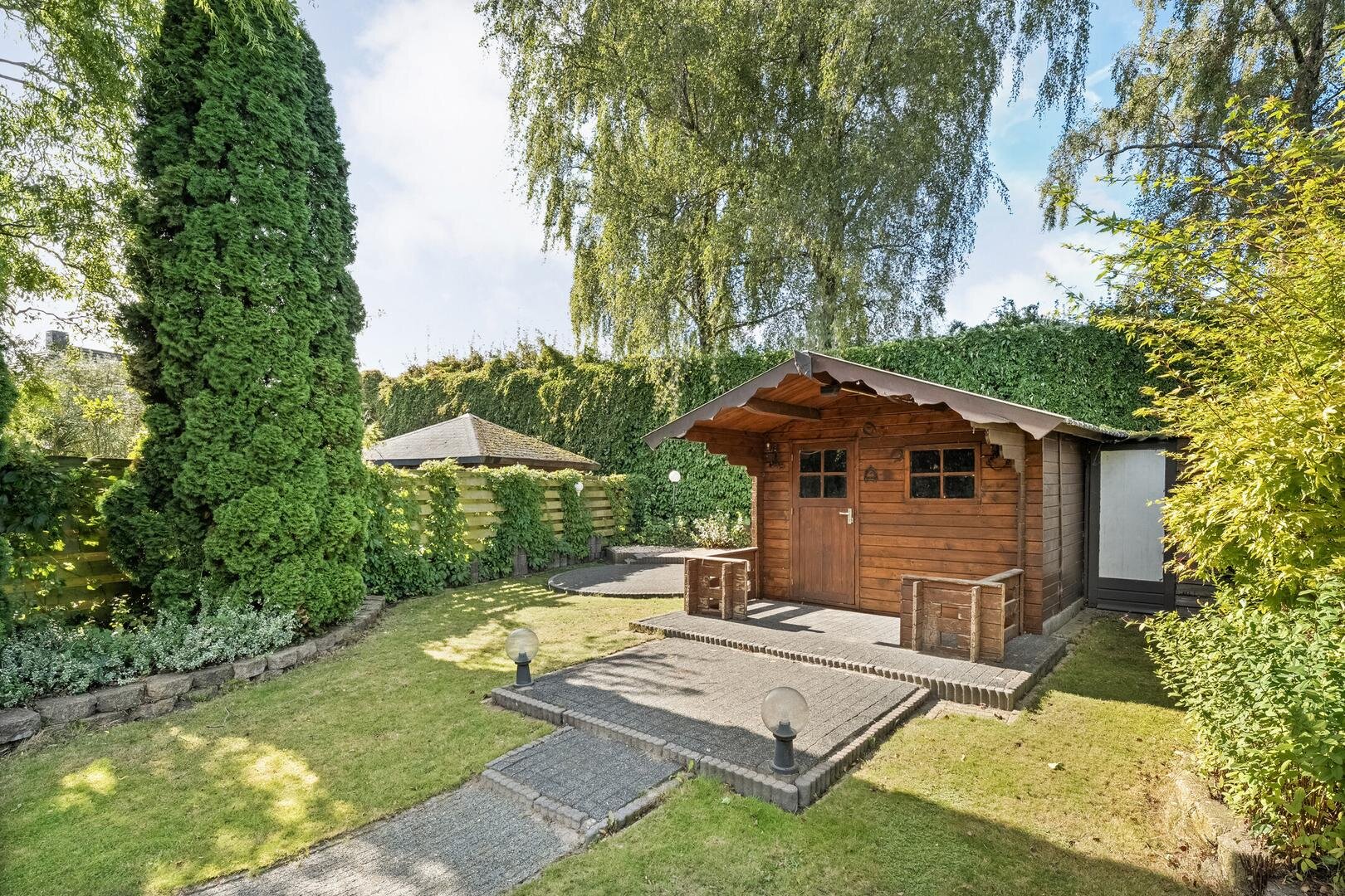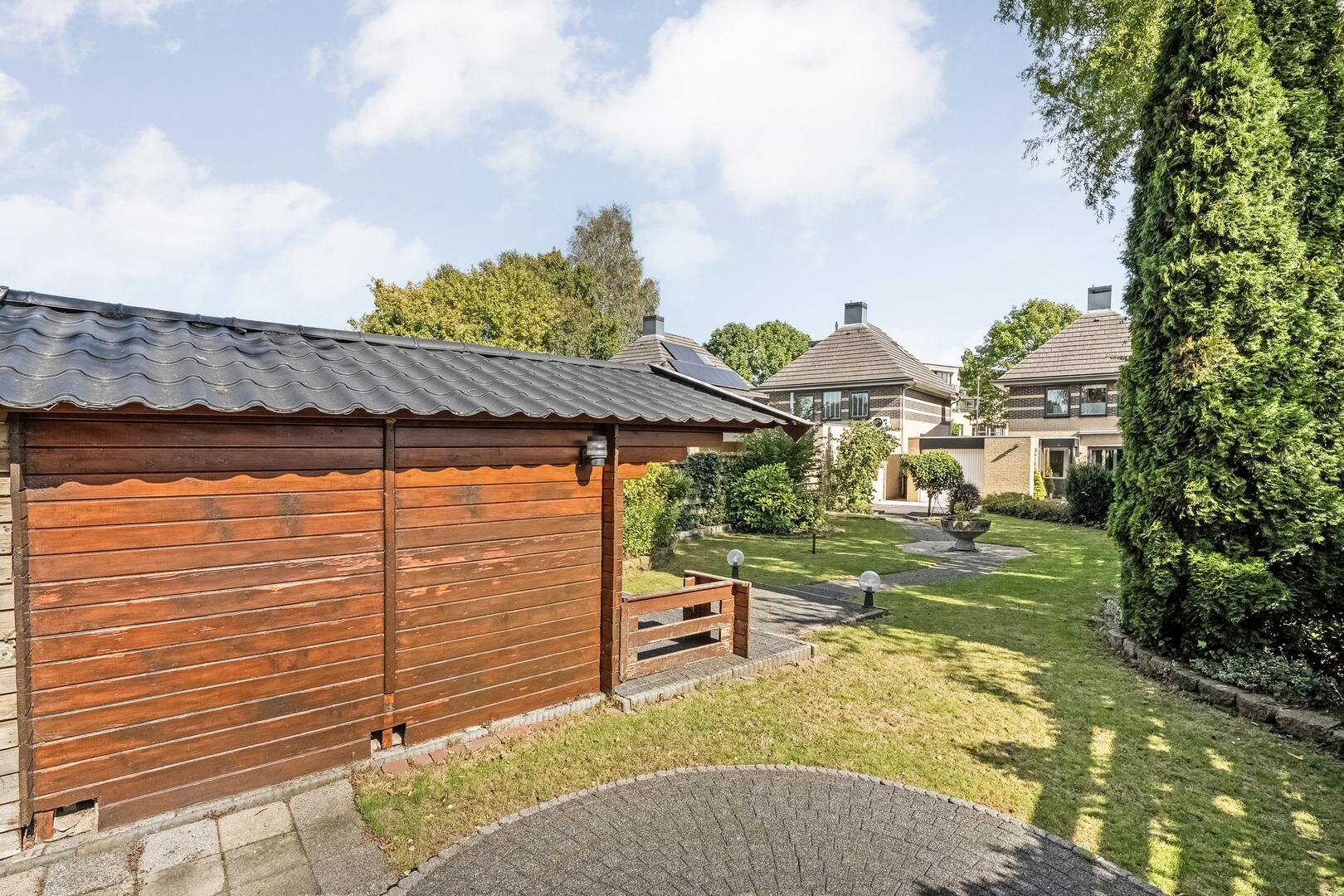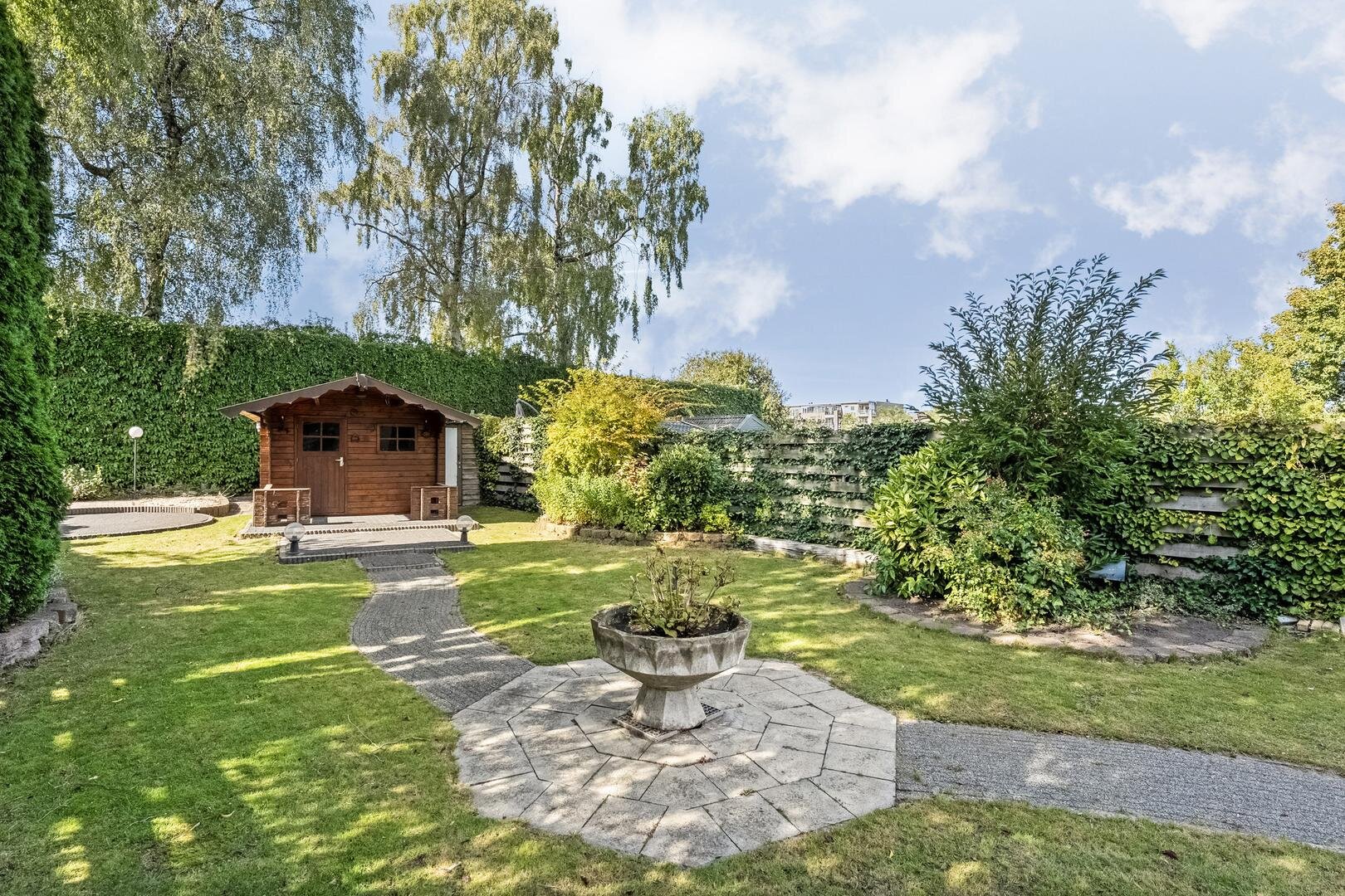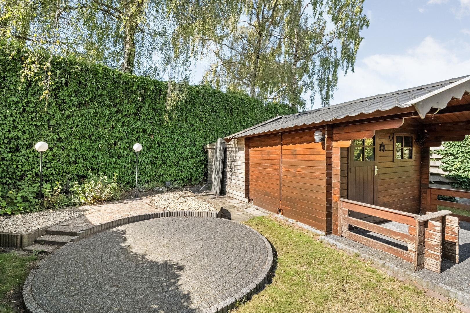 De tuin rondom de woning is royaal en biedt meerdere terrassen waar op elk moment van de dag een fijne plek in de zon of schaduw te vinden is. Het houten tuinhuis zorgt voor extra bergruimte en in de verlengde garage is volop plaats voor een auto, fietsen en gereedschap.