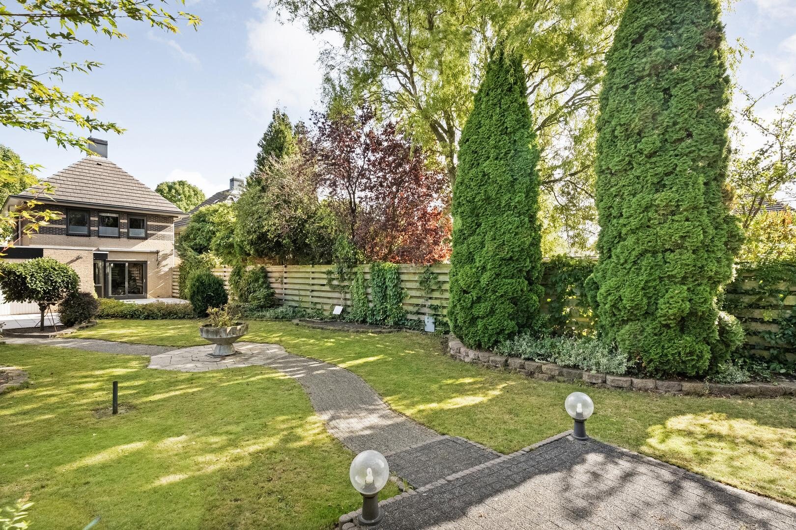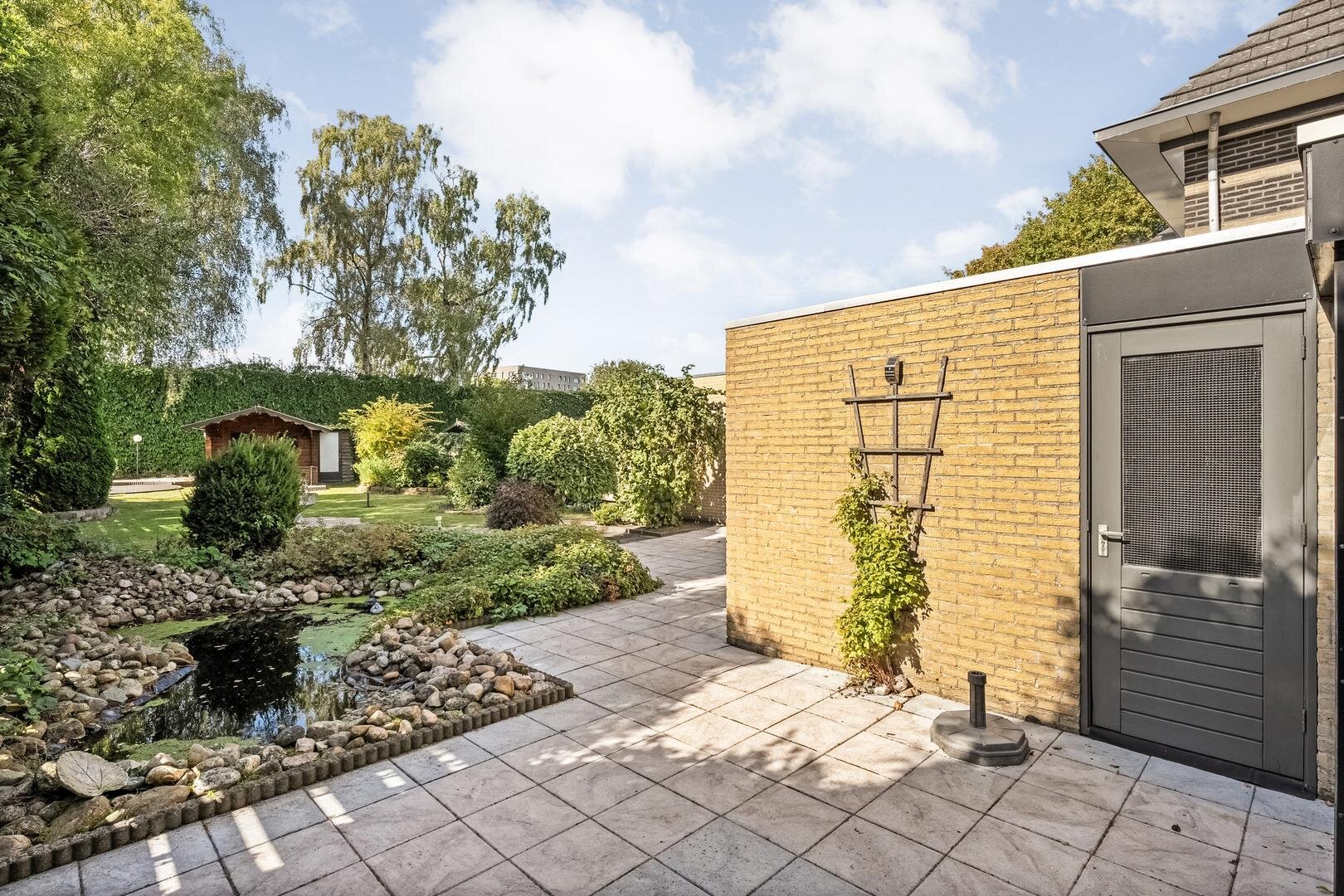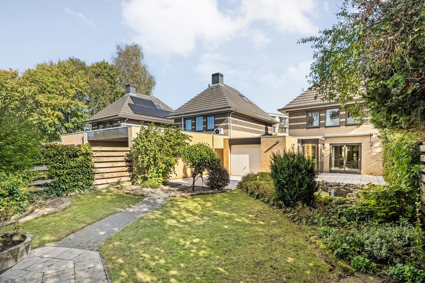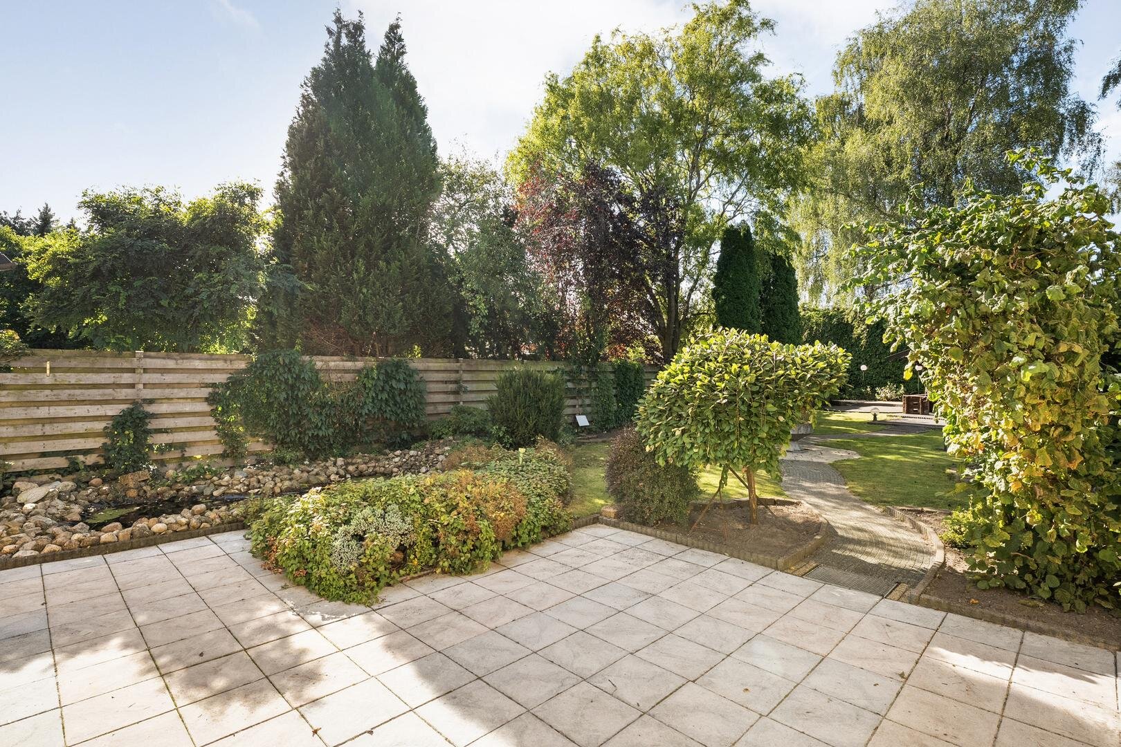 De tuin rondom de woning is royaal en biedt meerdere terrassen waar op elk moment van de dag een fijne plek in de zon of schaduw te vinden is. Het houten tuinhuis zorgt voor extra bergruimte en in de verlengde garage is volop plaats voor een auto, fietsen en gereedschap.