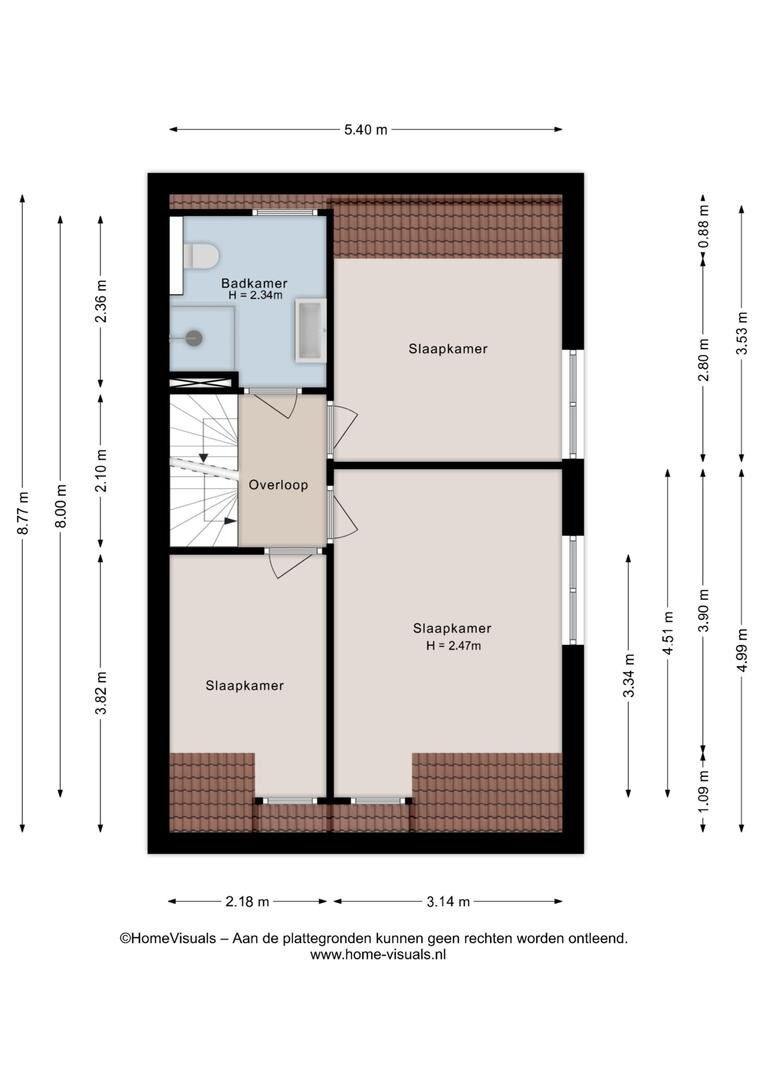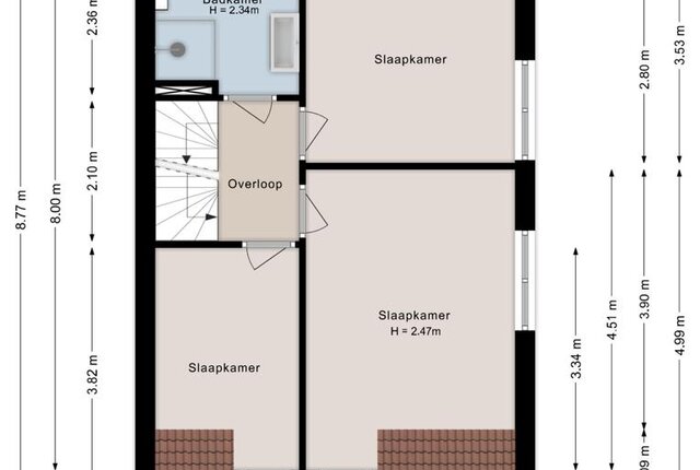 Eerste verdieping: Overloop. Drie slaapkamers. Badkamer voorzien van wastafelmeubel, toilet en douche.