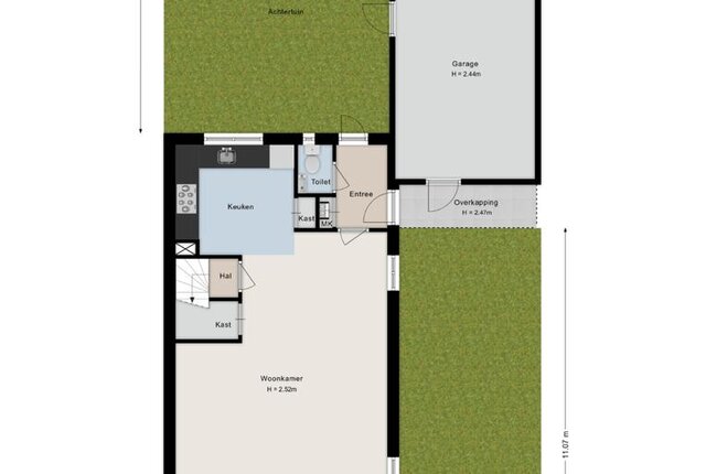 Begane grond: Entree met toilet en deur richting de achtertuin. L-vormige woonkamer voorzien van laminaatvloer. Bergruimte en hal met trap naar de eerste verdieping. Hoekkeuken voorzien van inbouwapparatuur, o.a. vaatwasser, combi oven, 5-pits gasfornuis, afzuigkap en koelkast.