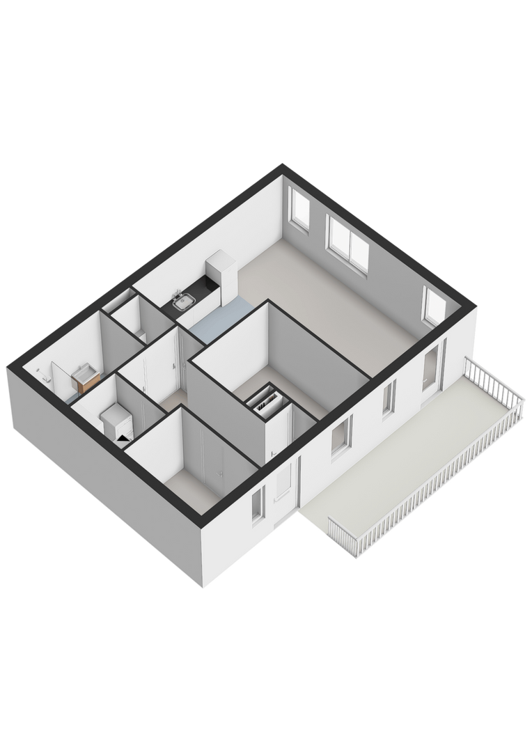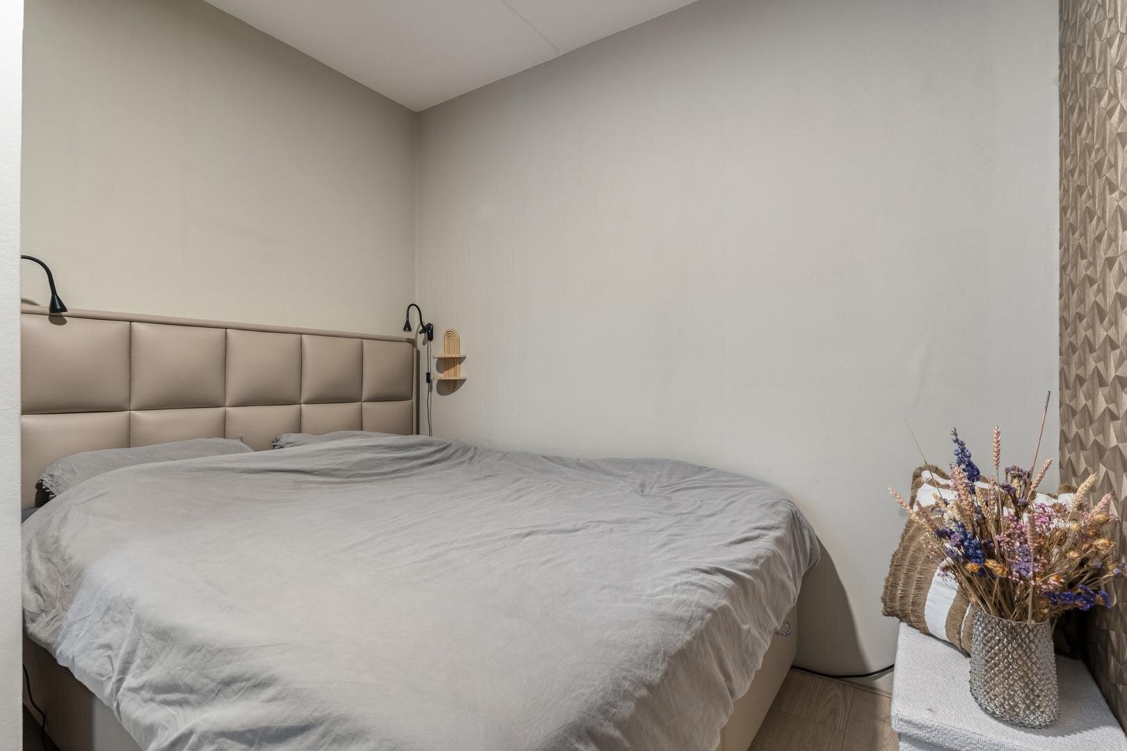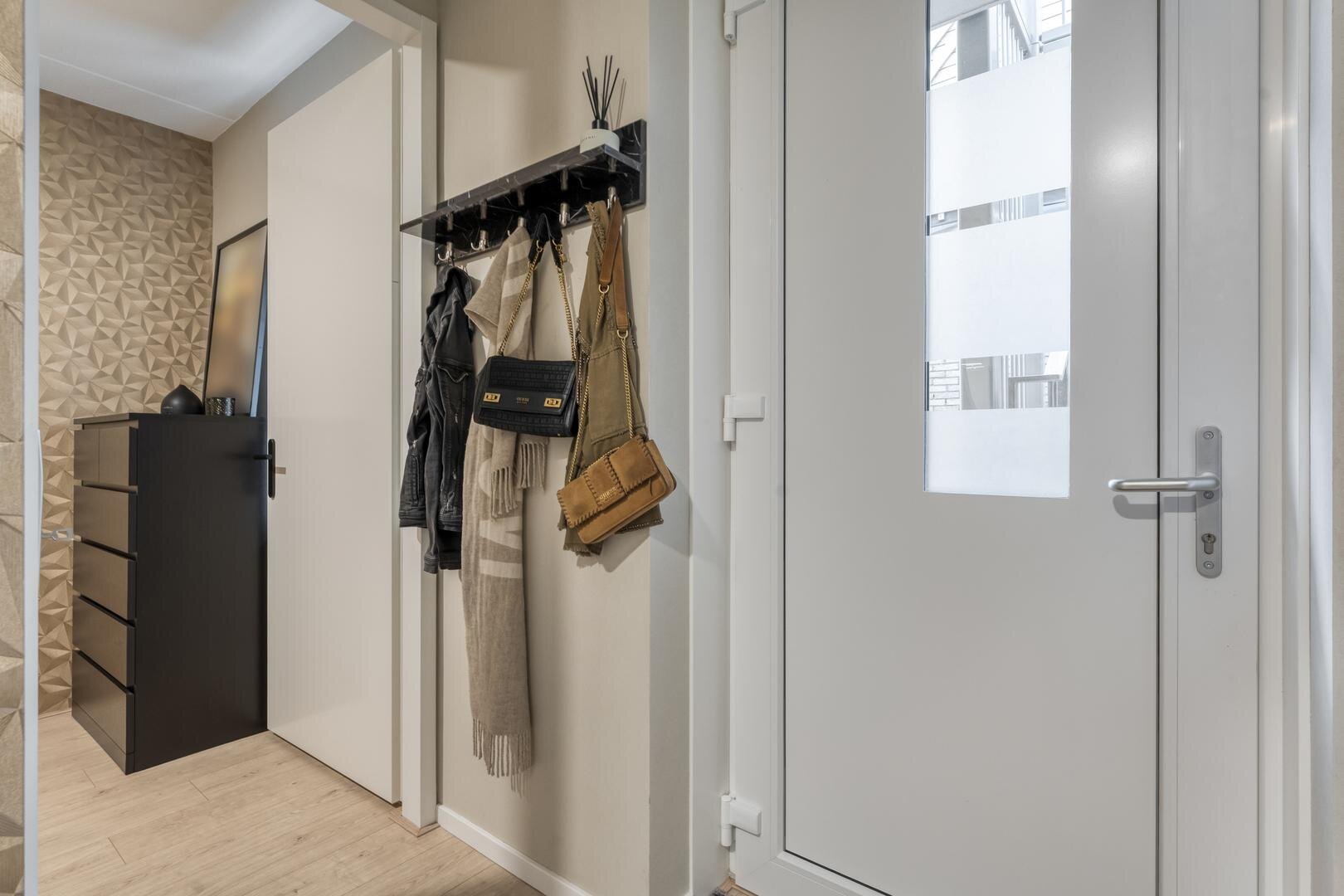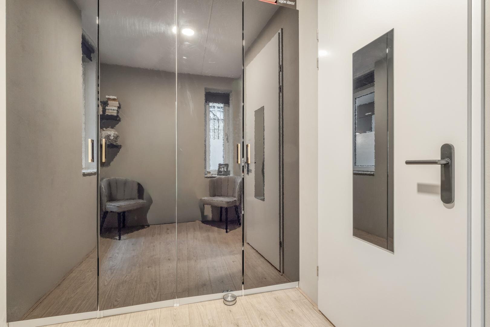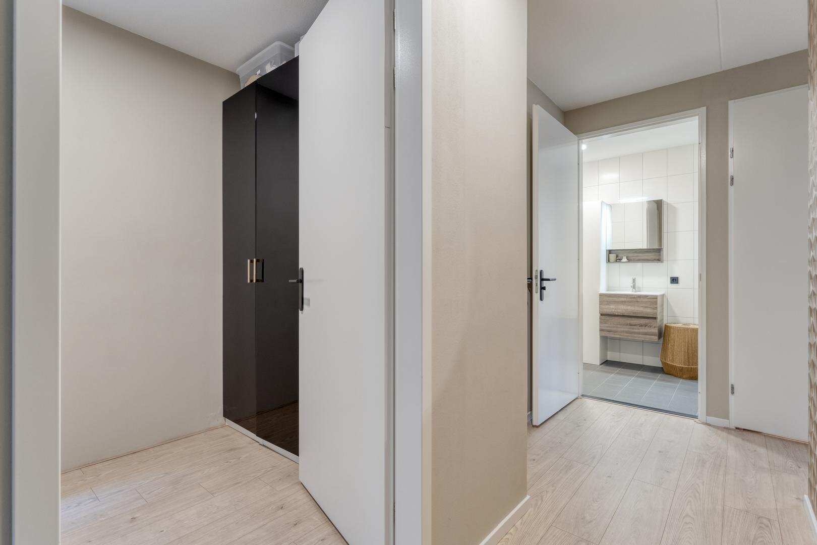 Hal/entree. Toilet. Eerste (grote) slaapkamer aan balkonzijde. Tweede slaapkamer die nu gebruikt wordt als kastenkamer.