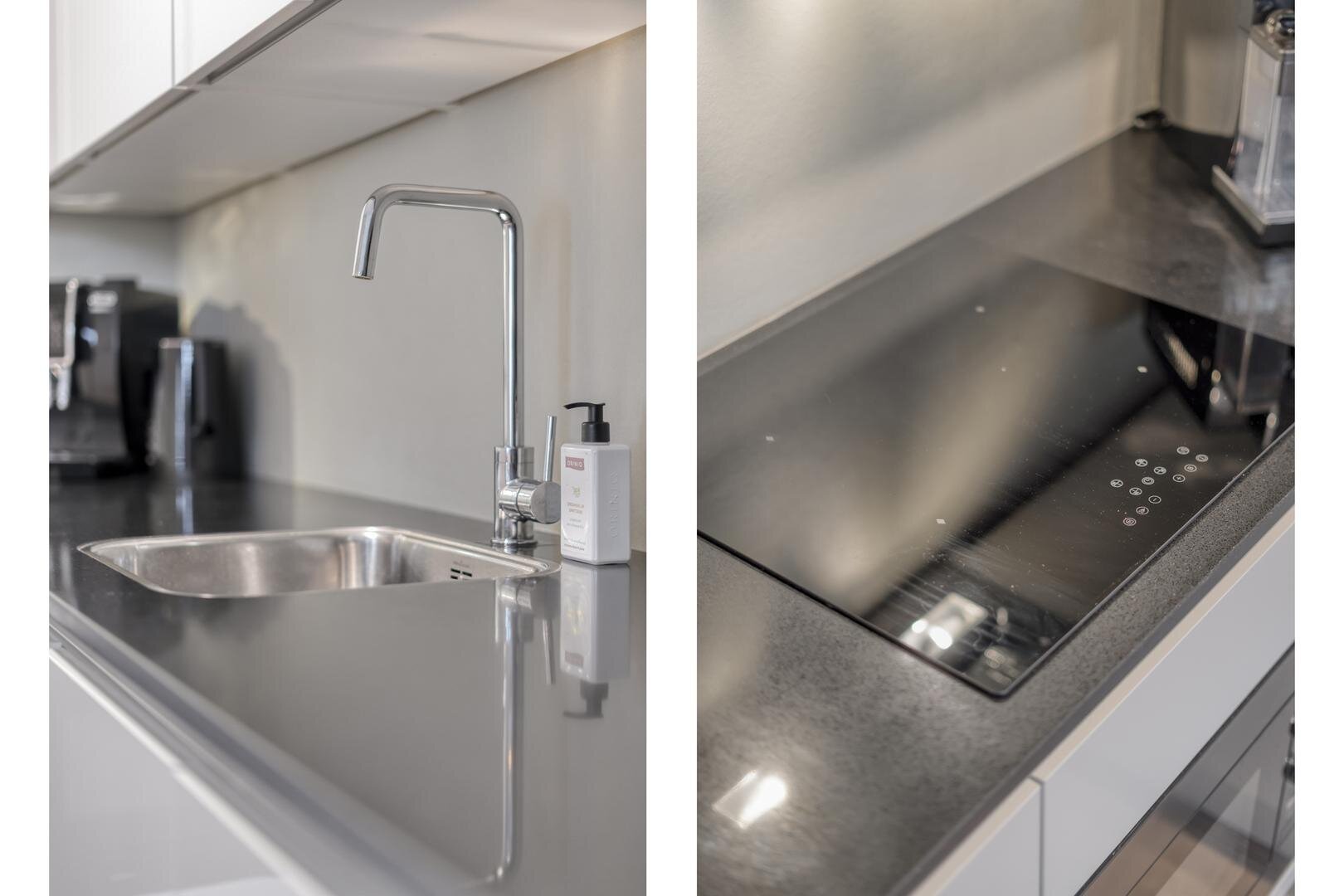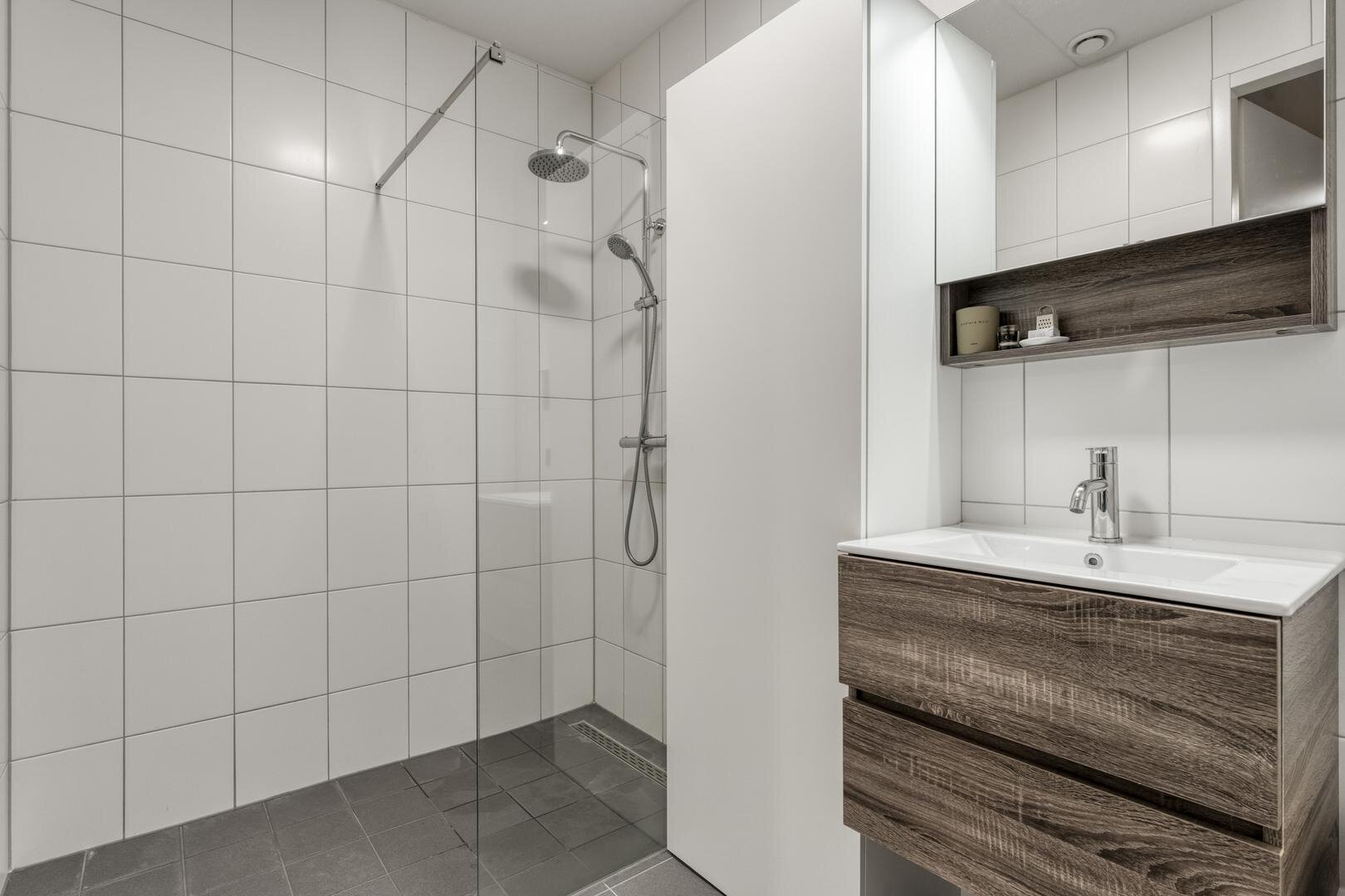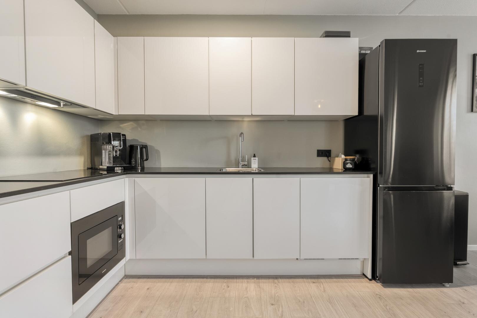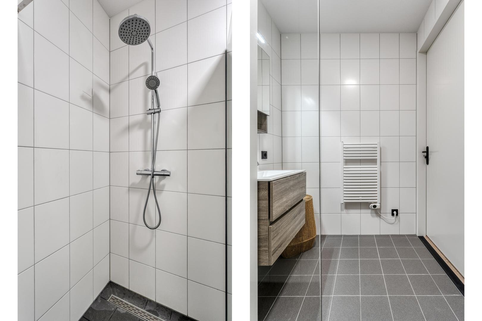 Berging met wasmachineaansluiting, mechanisch ventilatie, warmtepomp, verdeler vloerverwarming. Badkamer met vloerverwarming, inloopdouche en wastafel met meubel. Living met deur naar het balkon. Open keuken met inductie kookplaat met afzuiging, combi-oven, vaatwasser, koel/vries combinatie (wit).