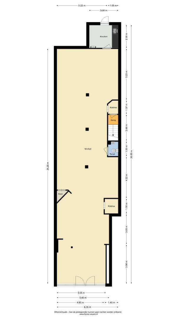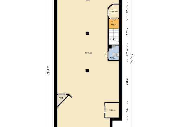 De verkoopruimte is groot ca. 150 m² BVO op de begane grond. Magazijn op de eerste verdieping van 21 m²