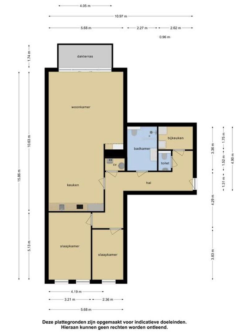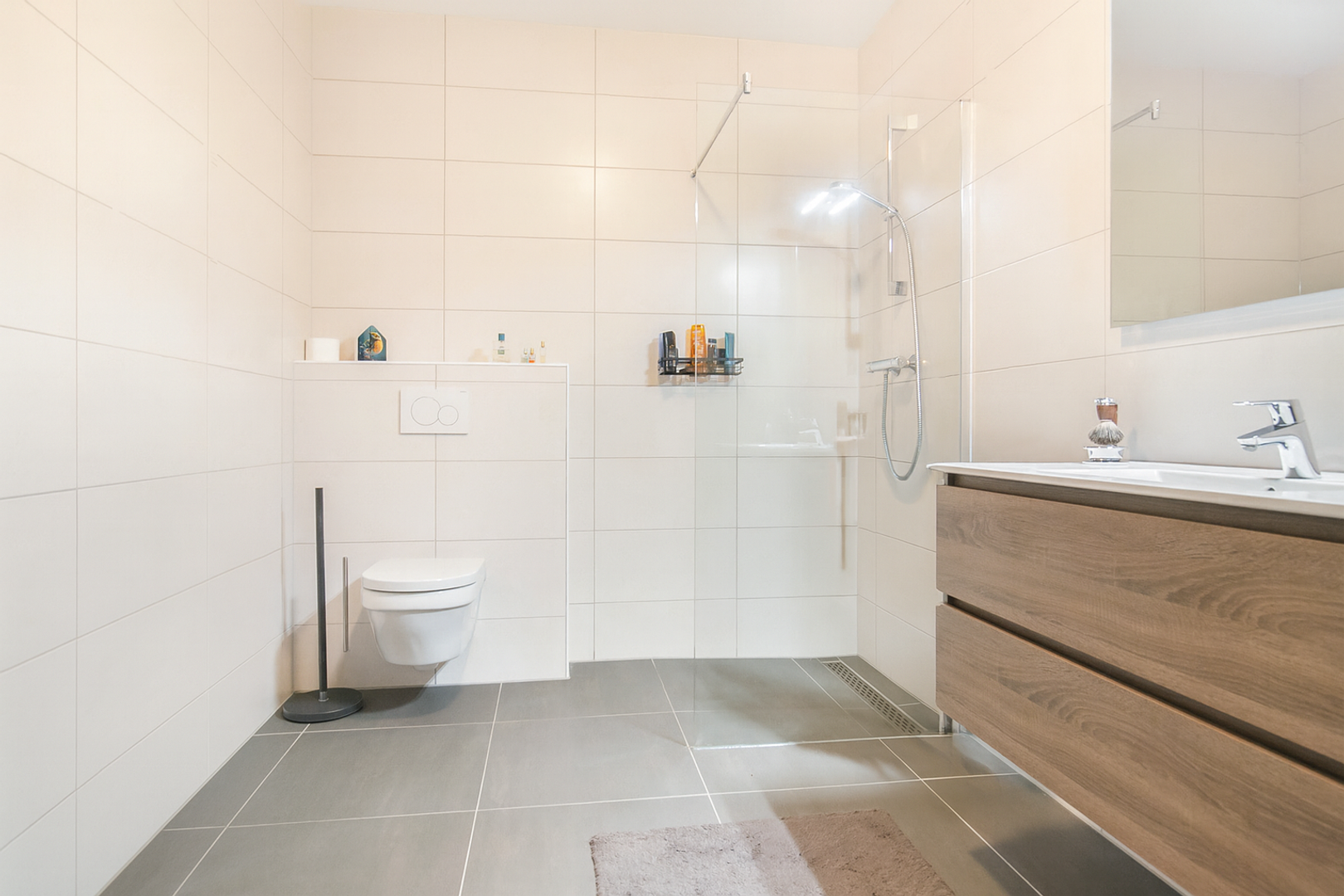 Hal/entree met meterkast en toilet, bijkeuken met wasmachine-aansluiting. Woonkamer voorzien van pvc-vloer, open keuken en toegang tot een royaal balkon. Badkamer met inloopdouche, toilet en wastafelmeubel. Twee slaapkamers.