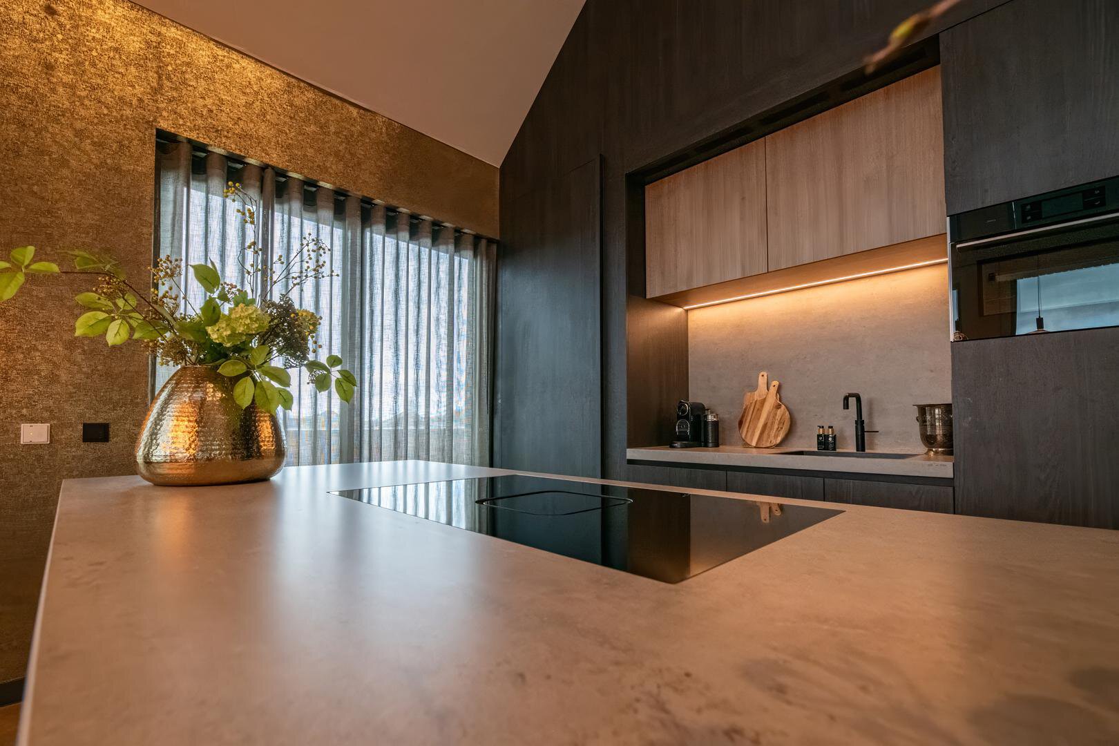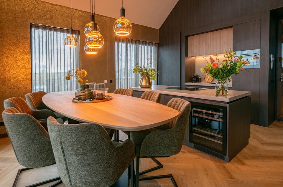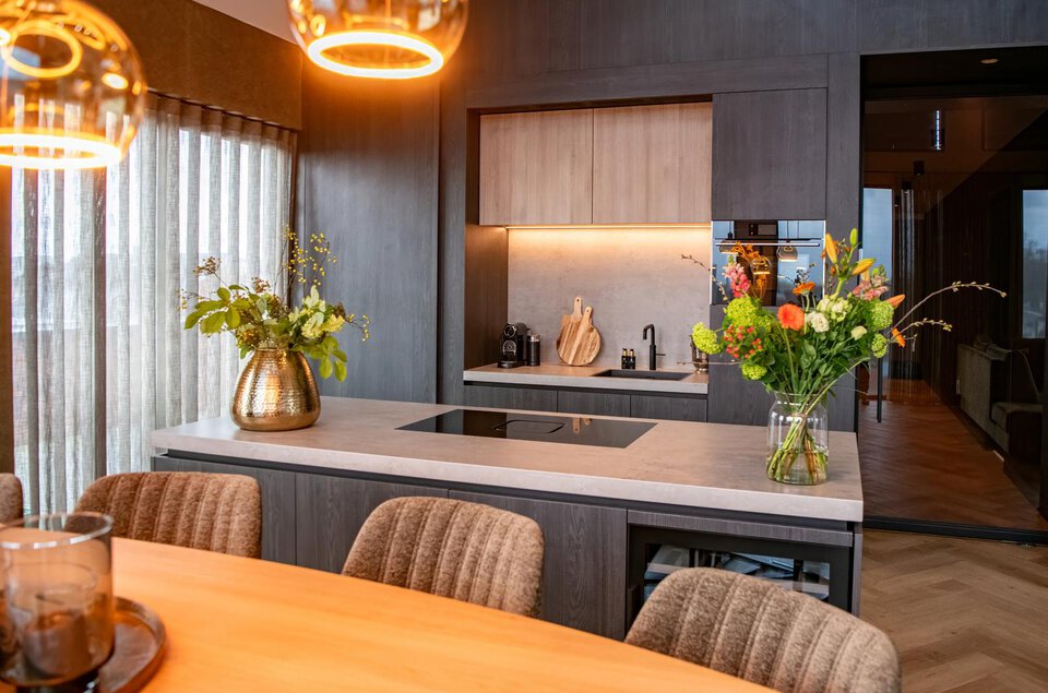 De living is het absolute pronkstuk van de woning: een riante ruimte met een imposante kastenwand, een elektrische haard en een weergaloos uitzicht. De open keuken, uitgevoerd in hoogwaardig design, is een droom voor liefhebbers van culinaire perfectie en biedt directe toegang tot de bijkeuken.