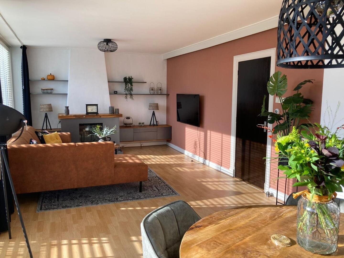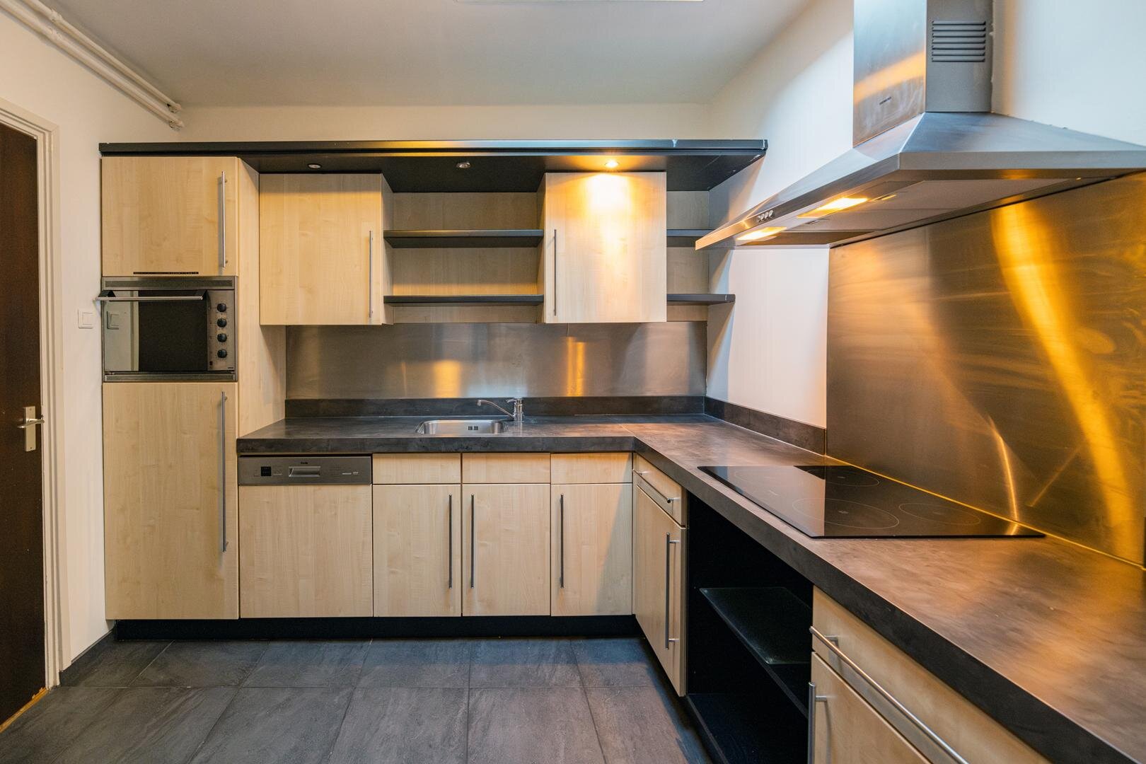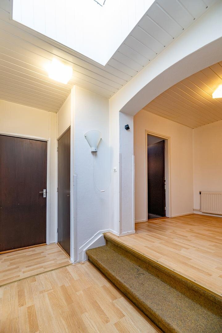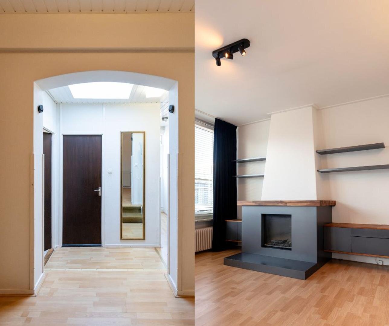 Opgang met entree/hal en toilet. Living met laminaatvloer, schuifpui en open-haard. Dichte woonkeuken met inbouwkeuken en apparatuur o.a. vaatwasser, koelkast, kookplaat en combi-oven.