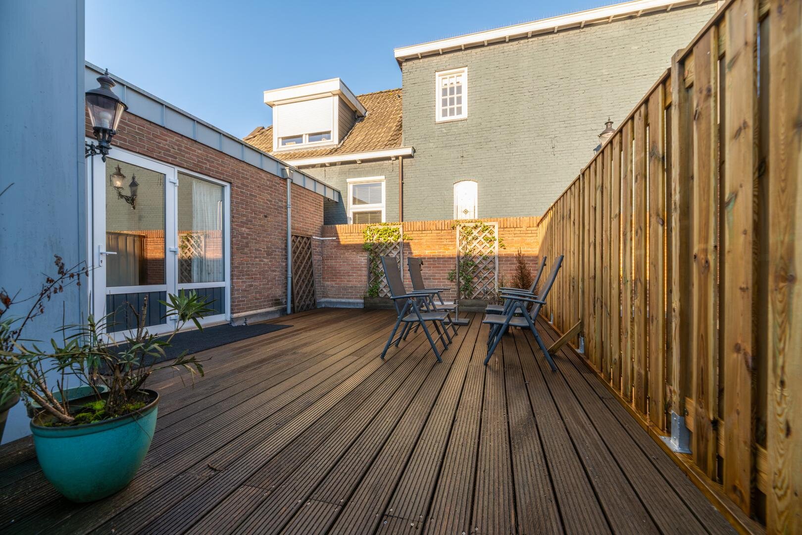 Naast een ruim balkon aan de voorzijde (winkelstraat) beschikt de woning over een groot dakterras aan de achterzijde op het zuidoosten, waar u in alle privacy kunt genieten van de zon. Ook is er een berging aanwezig, ideaal voor het stallen van fietsen.