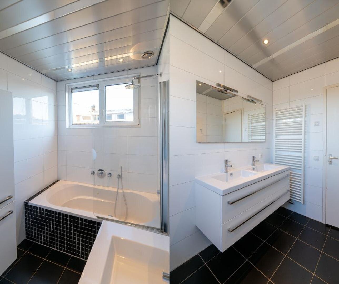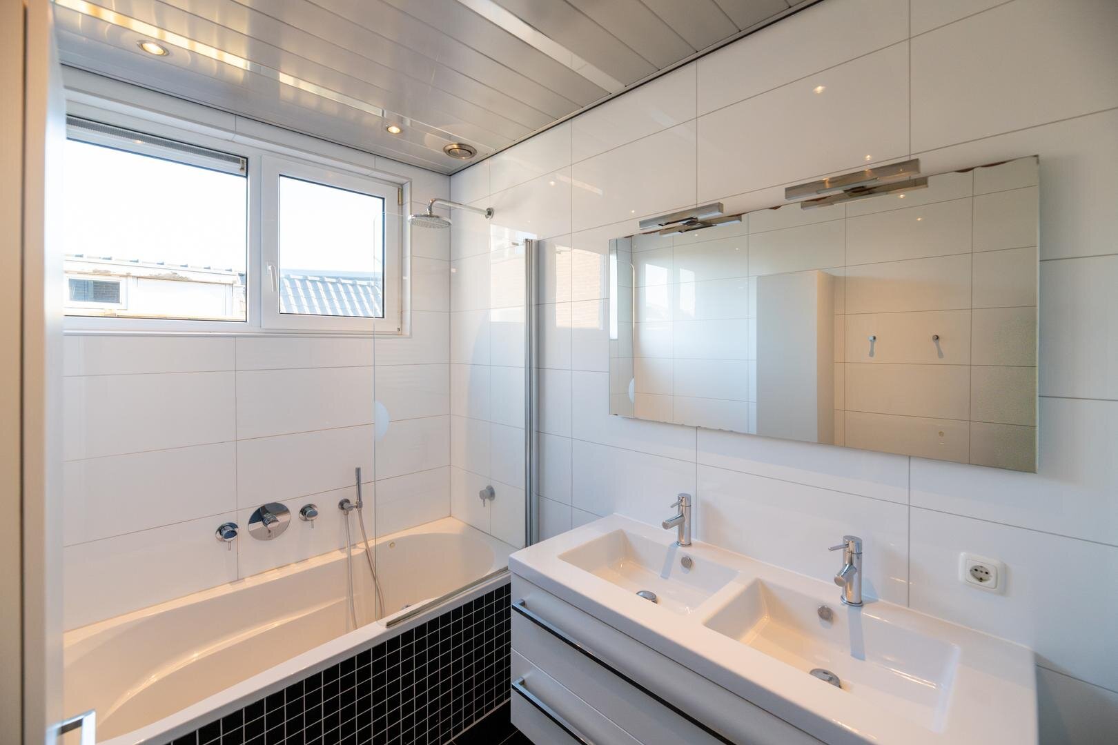 Badkamer met douchecabine, ligbad en meubel.