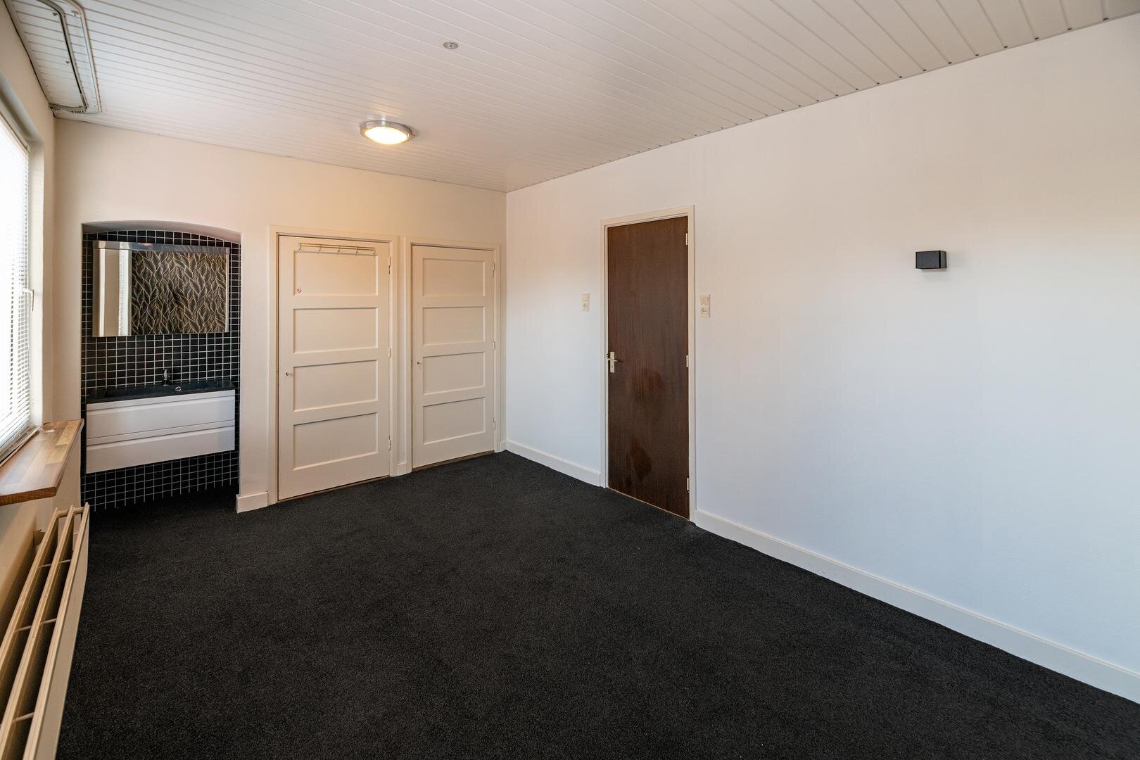 Drie slaapkamers met wastafels en kasten.
