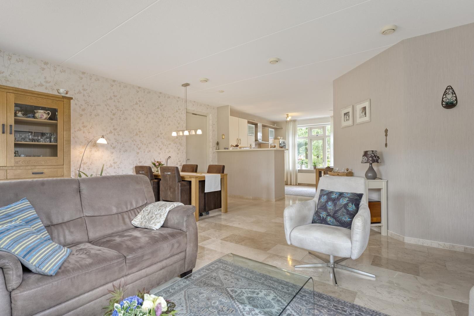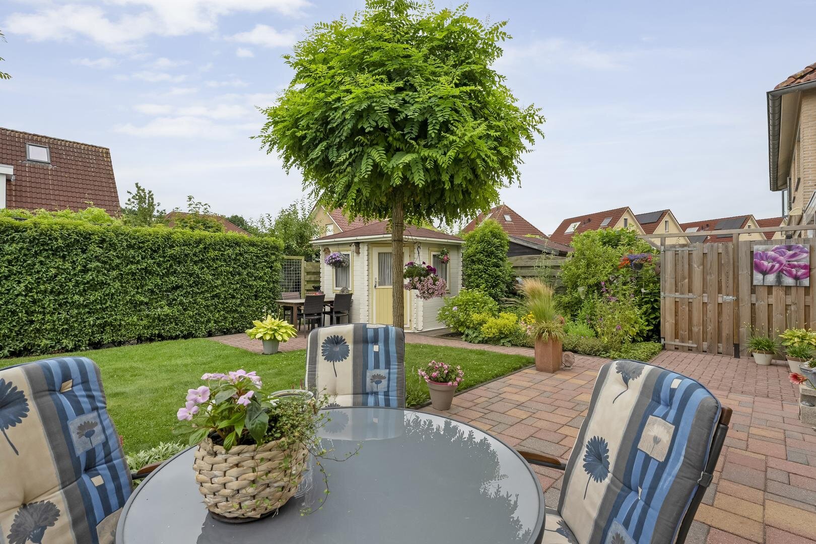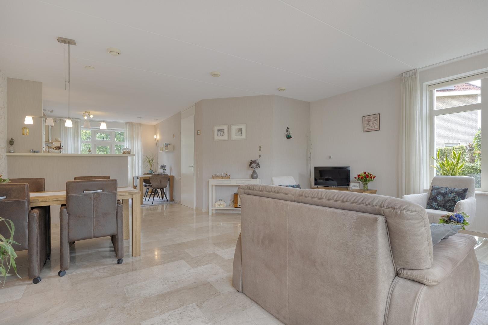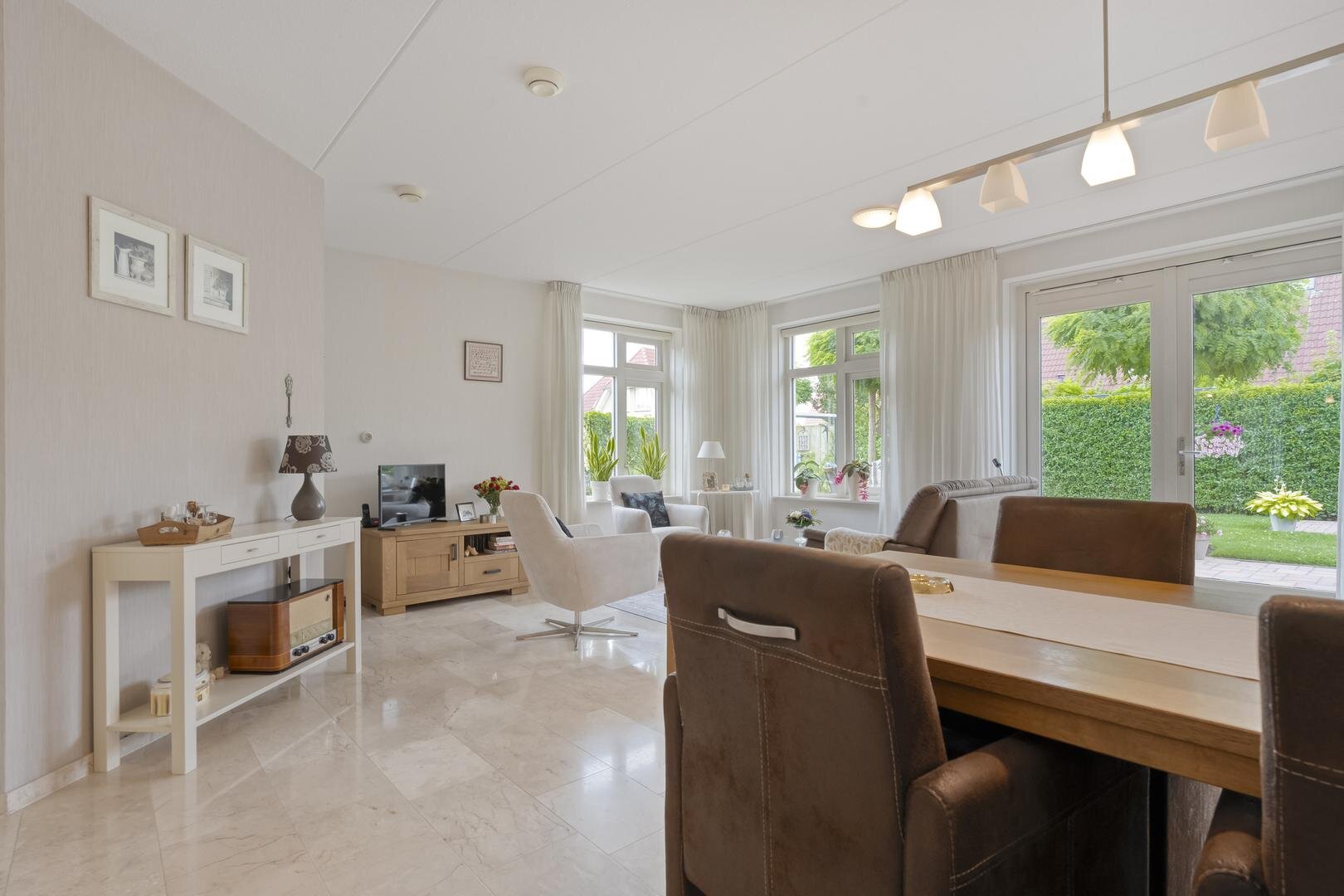 De ruime woonkamer heeft een fijne lichtinval en openslaande deuren die direct toegang geven tot het zonnige terras. Hier geniet je in alle rust van de verzorgde tuin die rondom de woning ligt. De tuin biedt meerdere terrassen, een achterom en een houten tuinhuis voor extra bergruimte. De garage is omgebouwd tot een geïsoleerde bijkeuken en schuur.