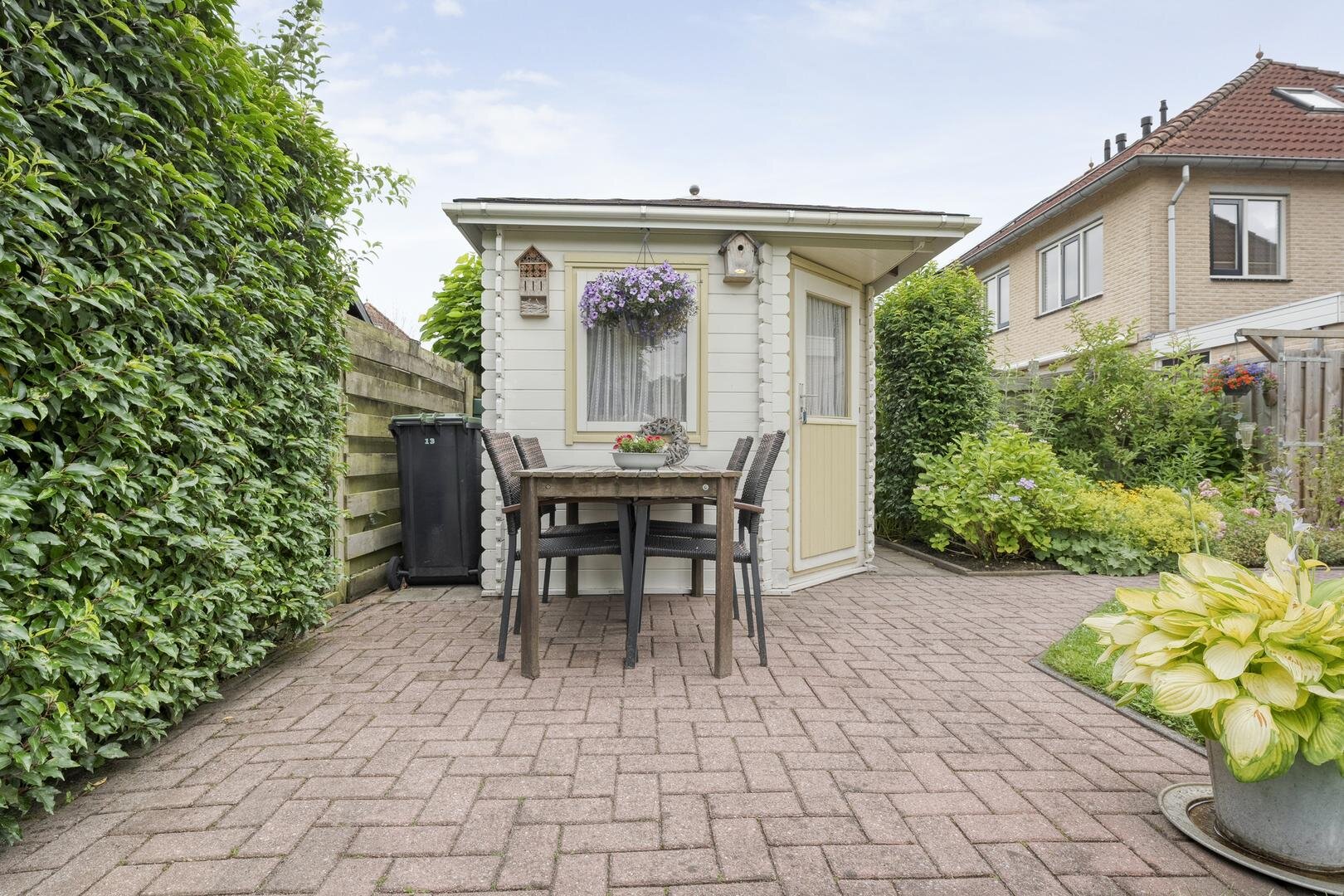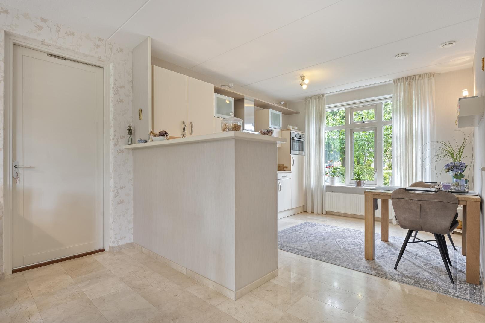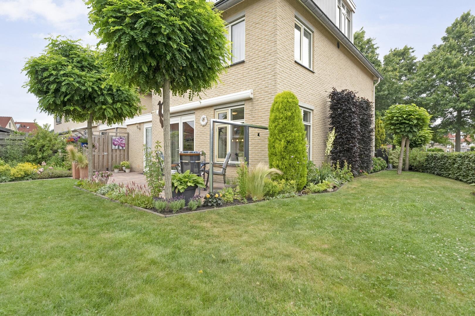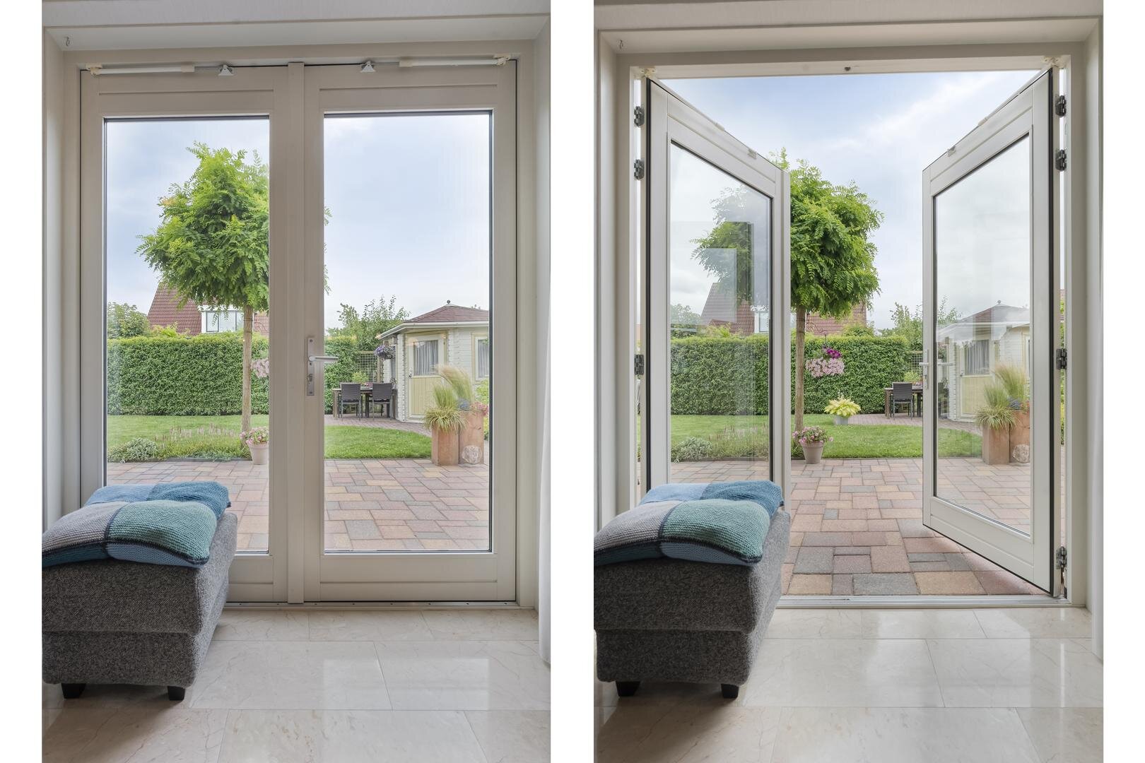 De ruime woonkamer heeft een fijne lichtinval en openslaande deuren die direct toegang geven tot het zonnige terras. Hier geniet je in alle rust van de verzorgde tuin die rondom de woning ligt. De tuin biedt meerdere terrassen, een achterom en een houten tuinhuis voor extra bergruimte. De garage is omgebouwd tot een geïsoleerde bijkeuken en schuur.