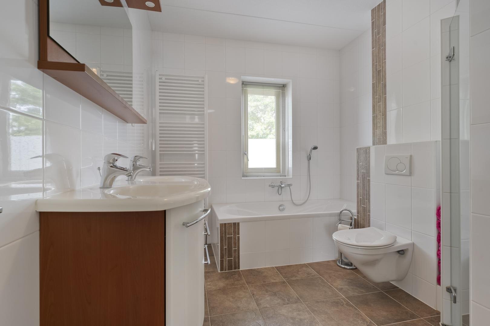 Eerst verdieping: overloop. Drie slaapkamers voorzien van vloerbedekking. Badkamer met ligbad, douche, dubbele wastafel met meubel en toilet. Via vaste trap naar...