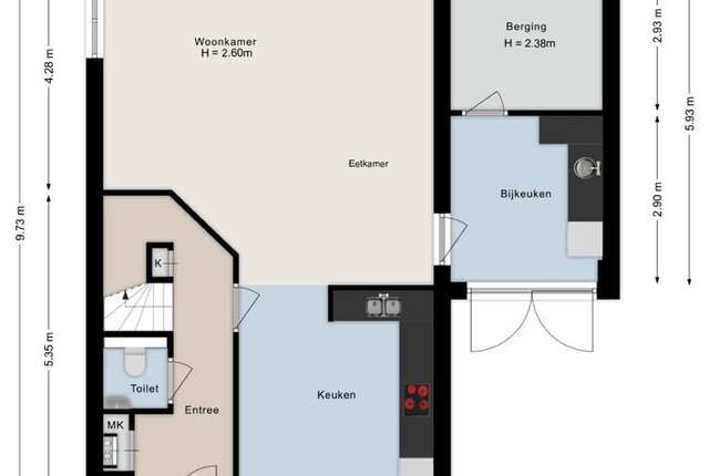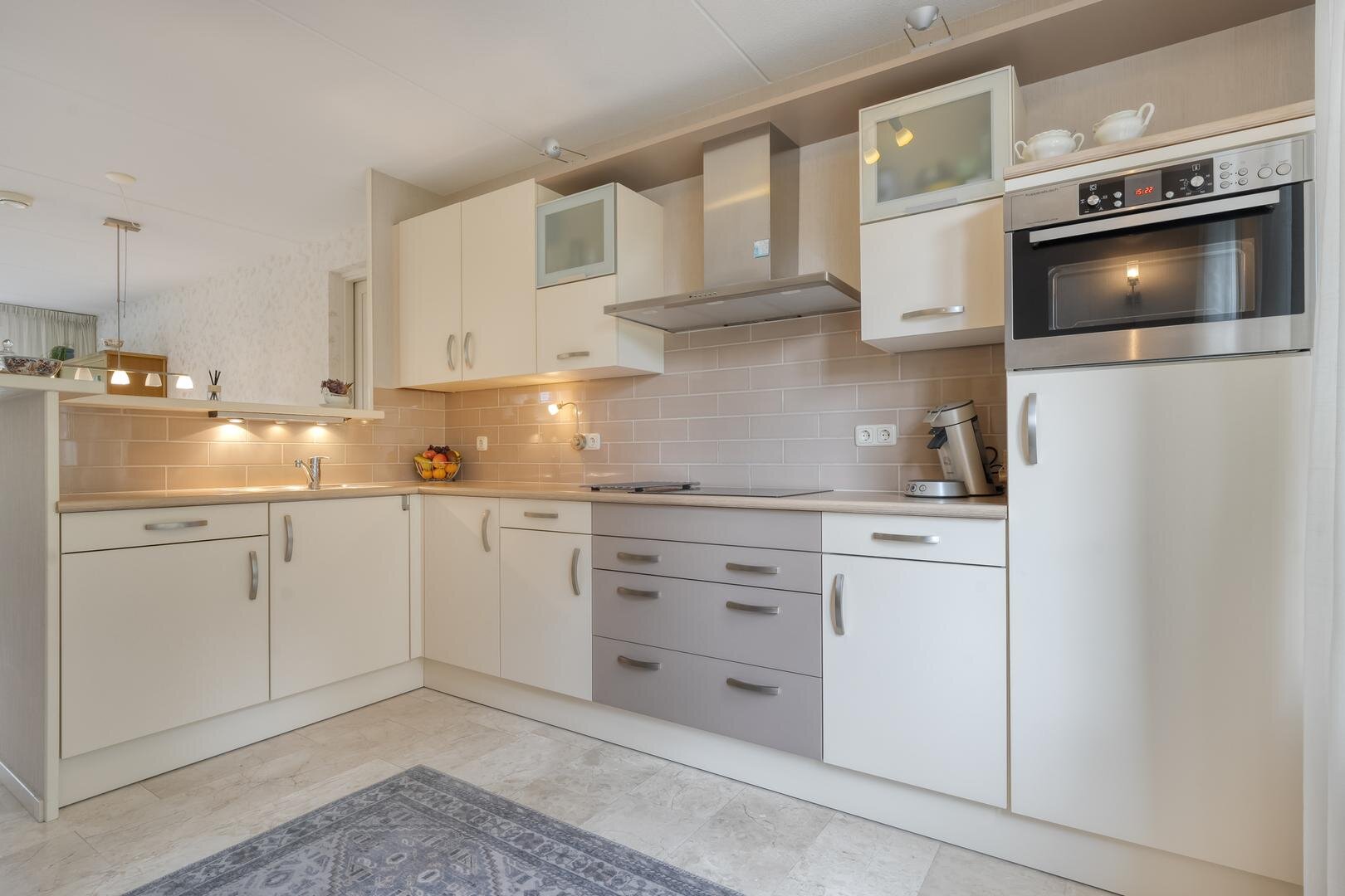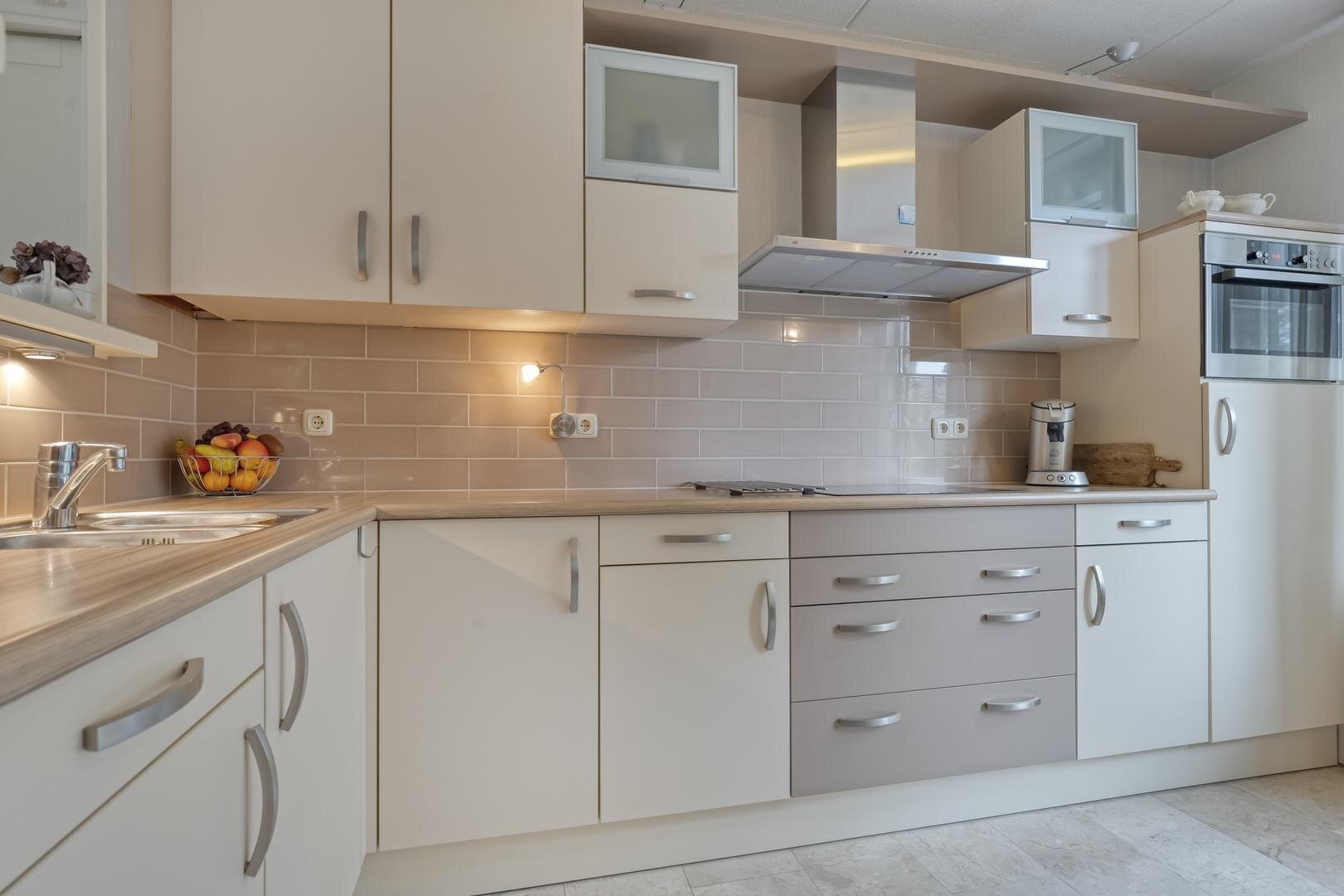 Keuken voorzien van een inductiekookplaat met afzuigkap, combi-oven/magnetron, koelkast. Bijkeuken voorzien van Novilon, met wasmachineaansluiting, keukenblok met kraan (warm/koud water) en berging met deur naar de tuin.