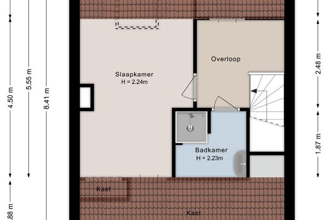 Tweede verdieping: Via vaste trap te bereiken overloop. Badkamer met douche en wastafel. Vierde slaapkamer voorzien van dakraam. CV-ketel.
