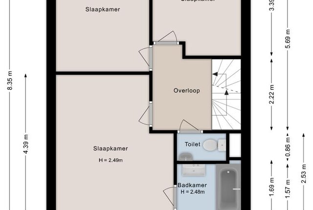Eerste verdieping: Overloop met toilet. Drie slaapkamers, waarvan één slaapkamer beschikt over een badkamer met ligbad, douche en wastafelmeubel.