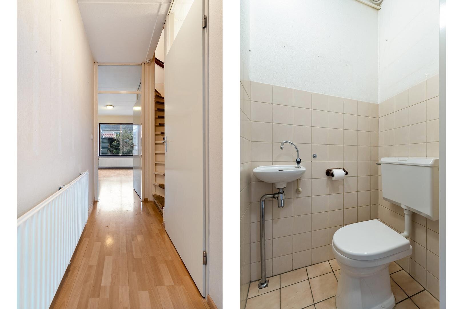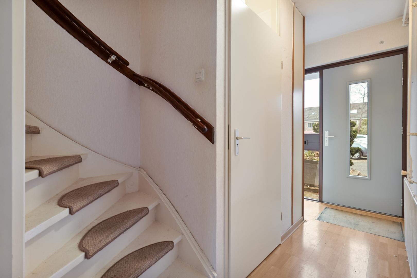 Begane grond: Entree met toilet en trap naar de eerste verdieping. Woonkamer voorzien van laminaatvloer. Open keuken voorzien van inbouwapparatuur met schuifpui naar de achtertuin. Bijkeuken met wasmachineaansluiting.