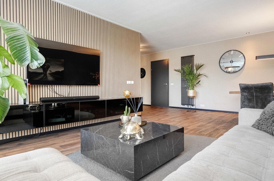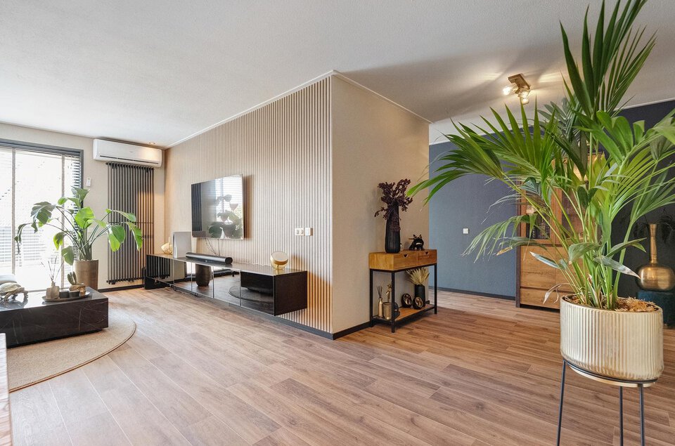 Woonkamer met laminaatvloer, akoestische panelen en airconditioning. Open keuken voorzien van apparatuur: gastoestel met afzuigkap, koelkast met combi- oven, vaatwasser. Deur naar het dakterras.