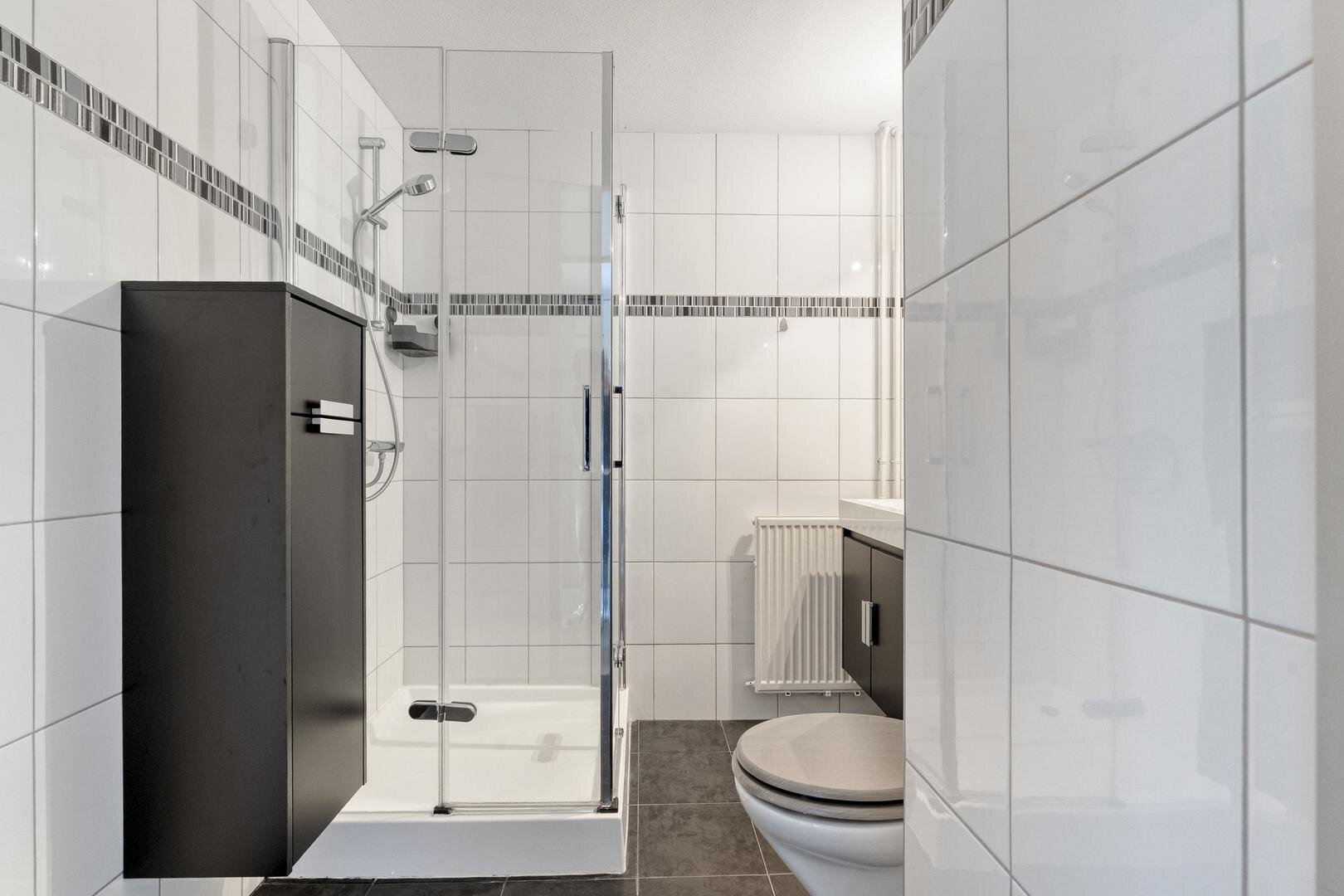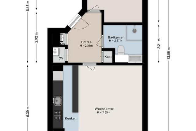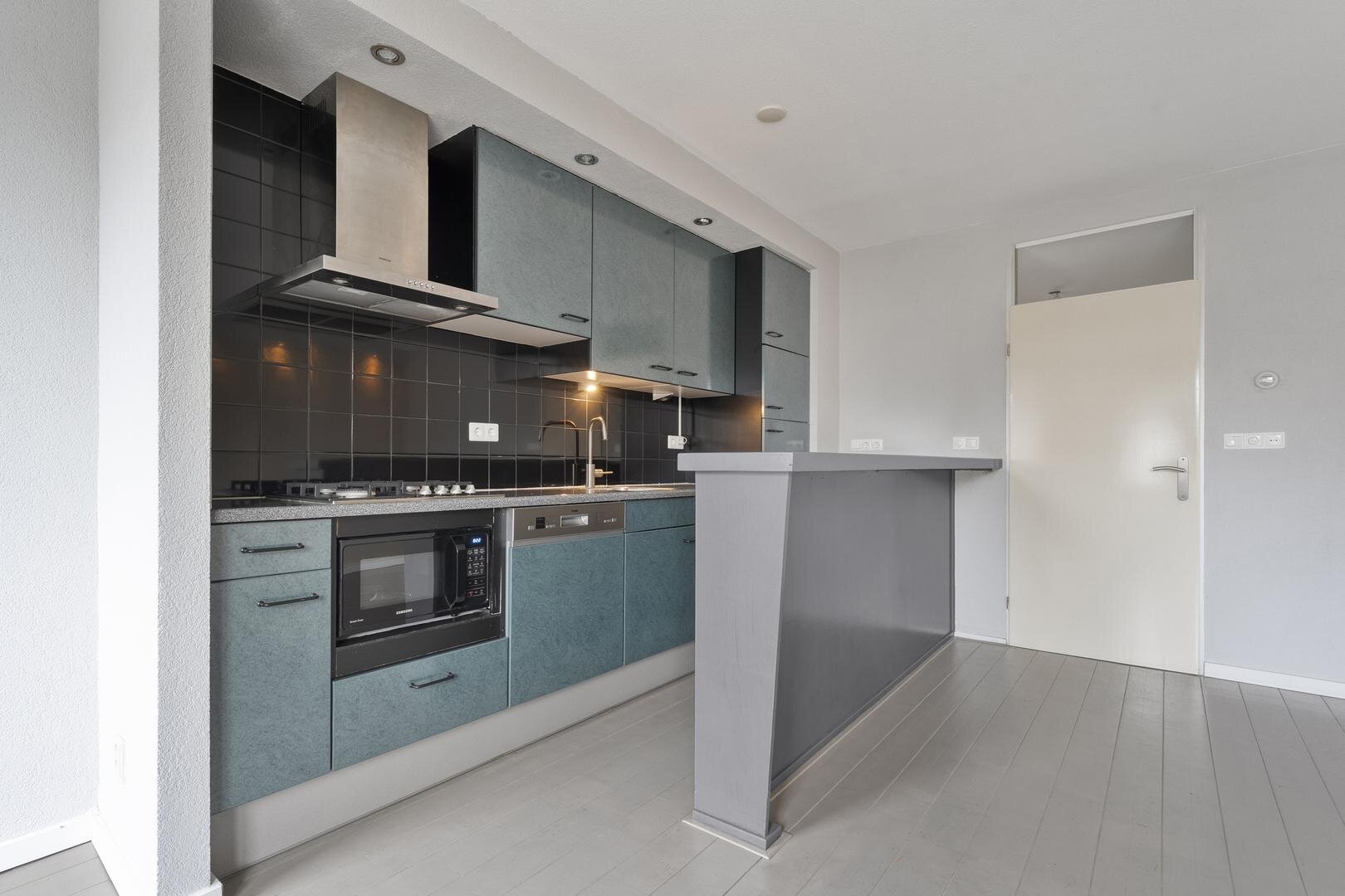Appartement gelegen op de 1e verdieping: Entree/hal met cv kast (2023). Woonkamer voorzien van eikenvloer en rolluik. Open keuken met inbouwapparatuur: vaatwasser, magnetron, koelkast, afzuigkap en 4-pits gaskookstel. Badkamer voorzien van toilet, wasmachineaansluiting, douche, wastafel en wastafelmeubel. Slaapkamer beschikt over een laminaat vloer en een kast.