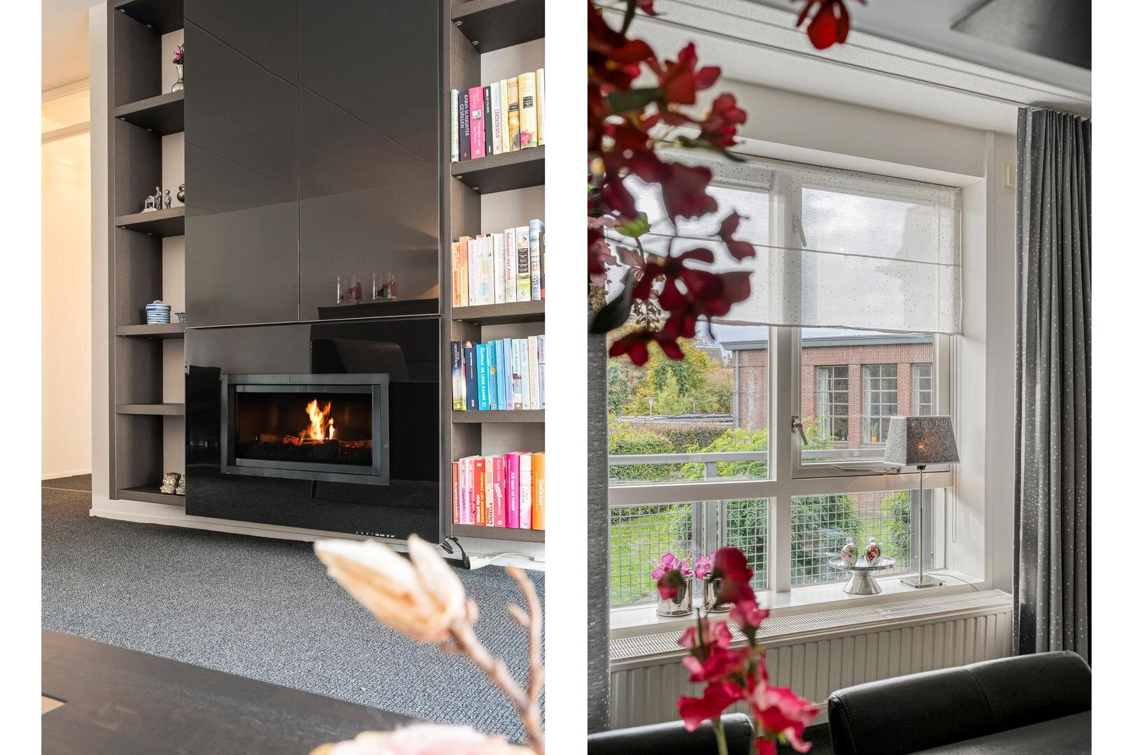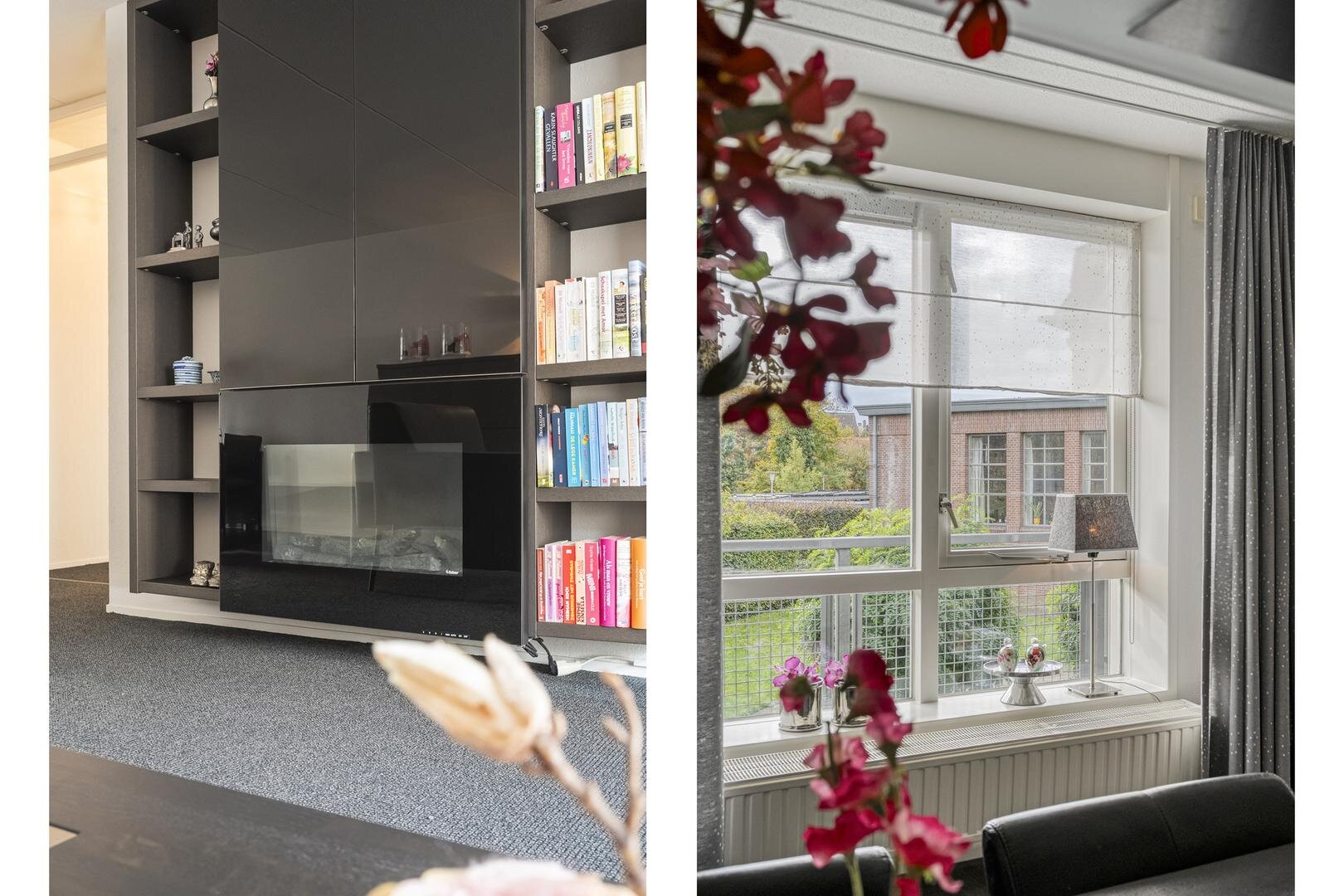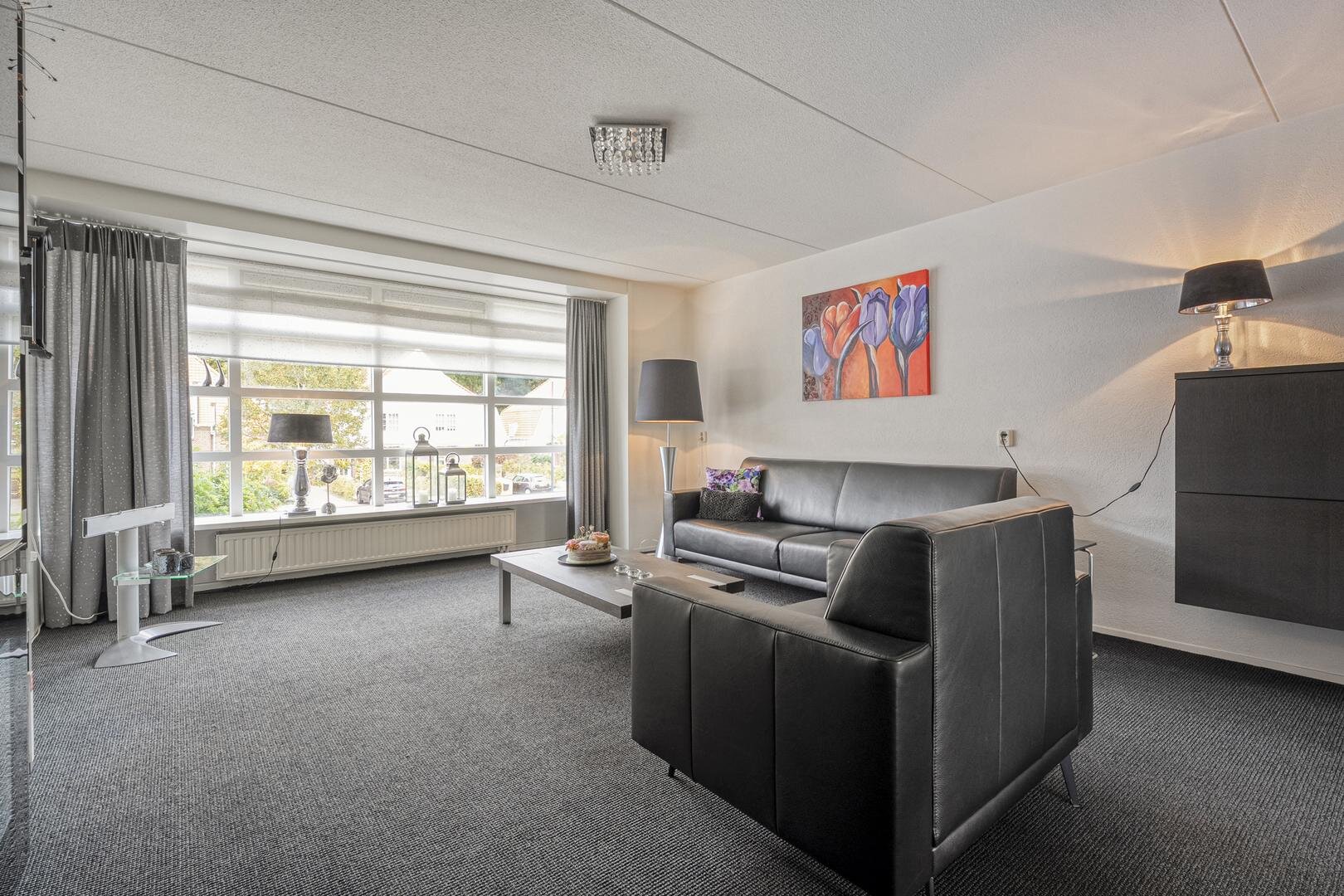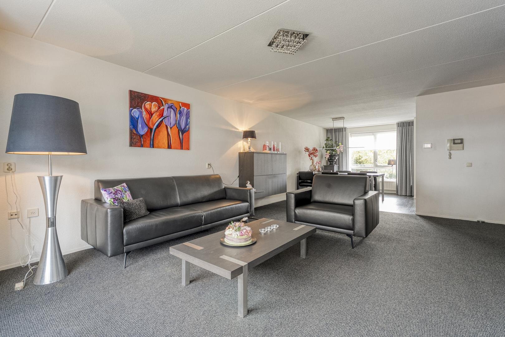 De woonkamer is licht en ruim, met een fraai uitzicht richting het stadspark. Via de woonkamer bereik je het zonnige balkon op het zuiden, waar het heerlijk vertoeven is onder het aanwezige zonnescherm.