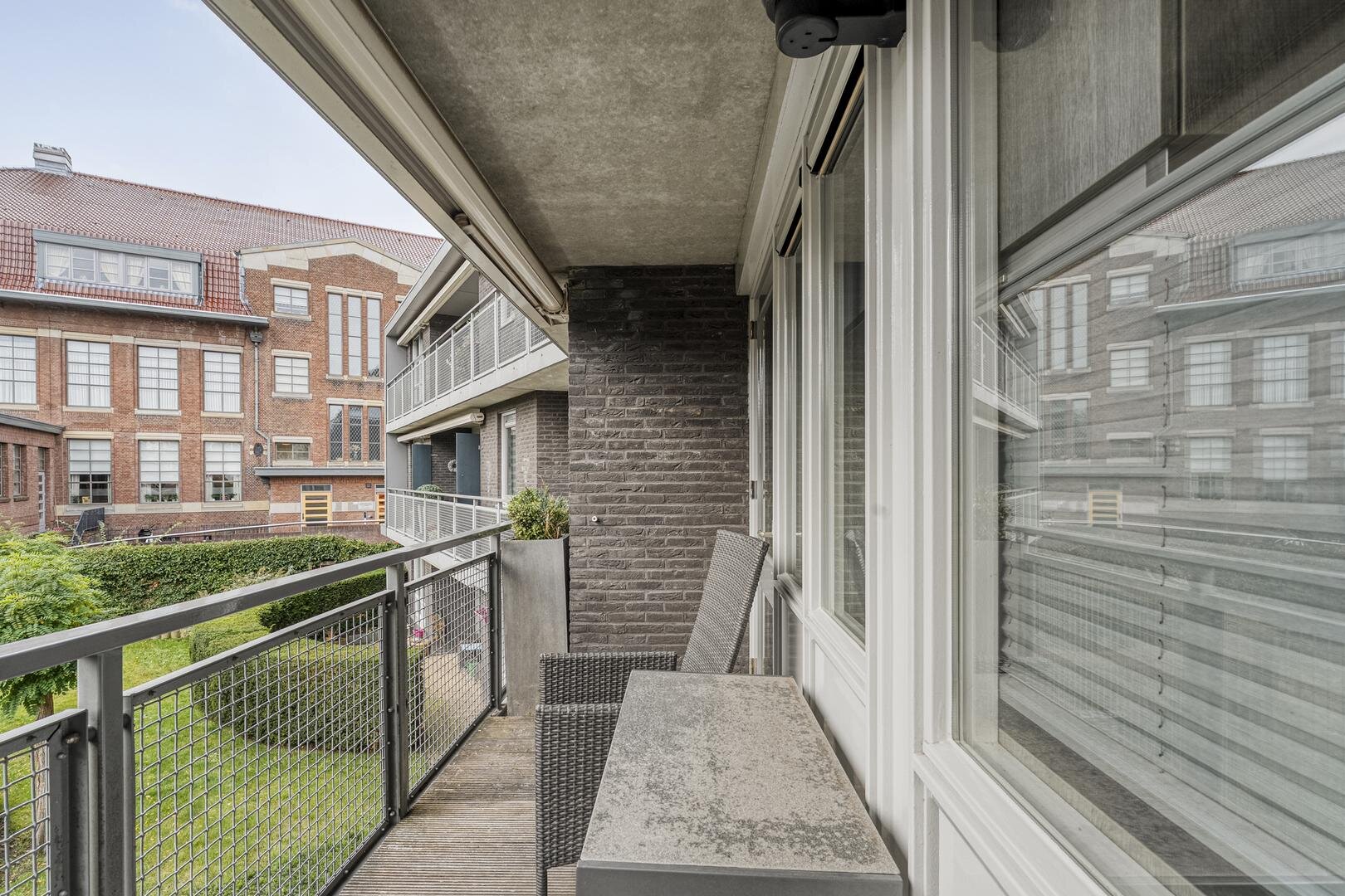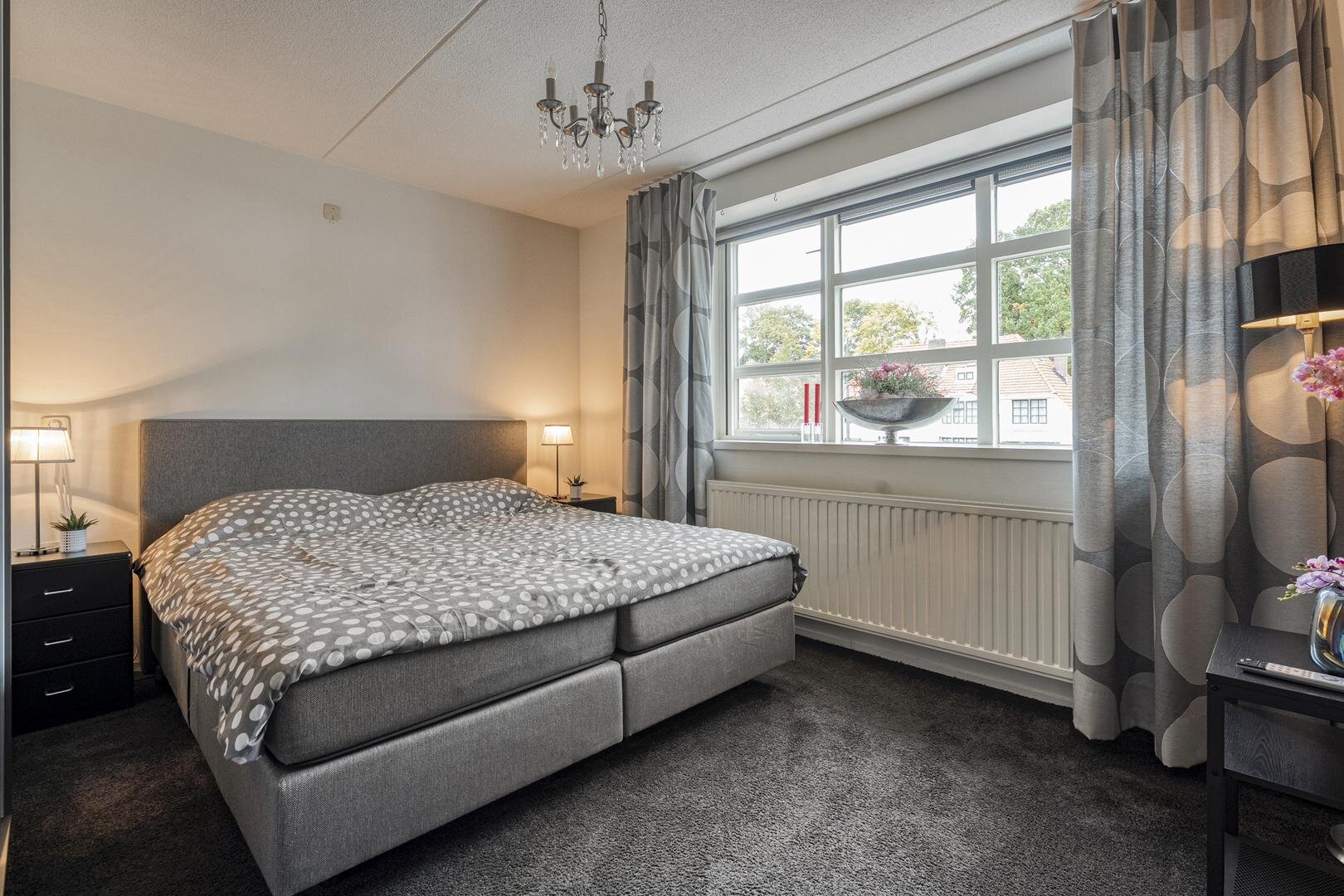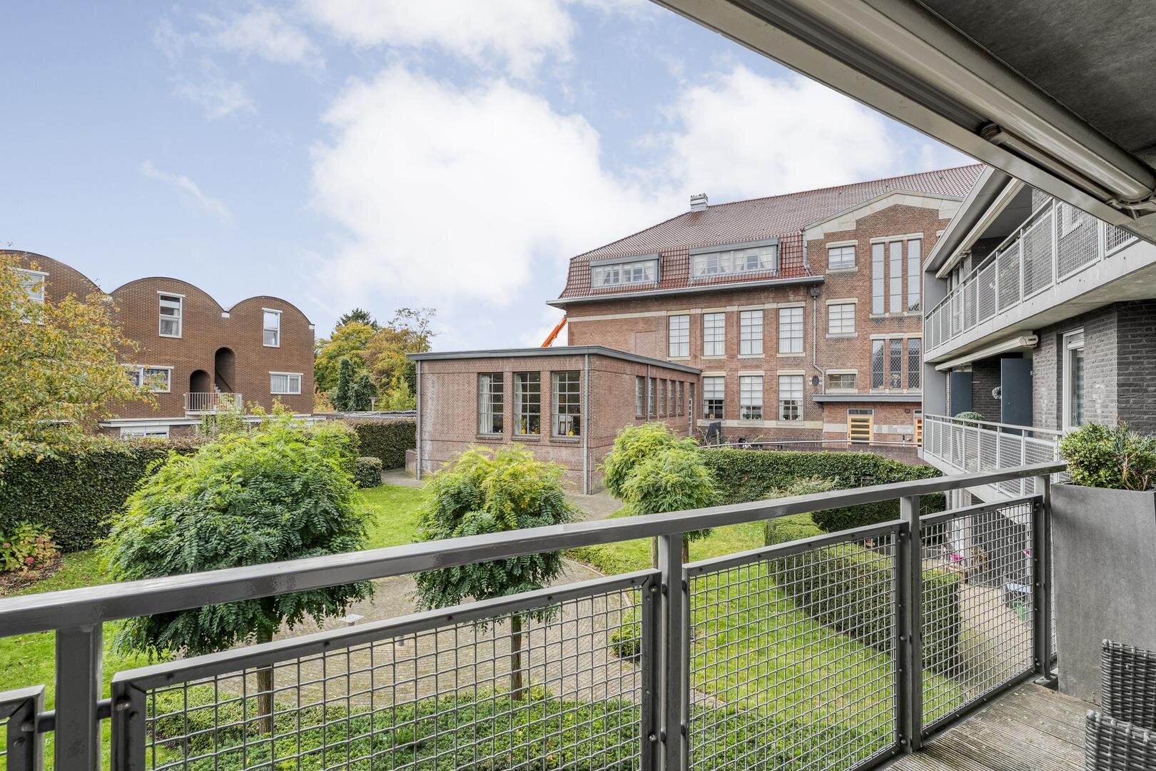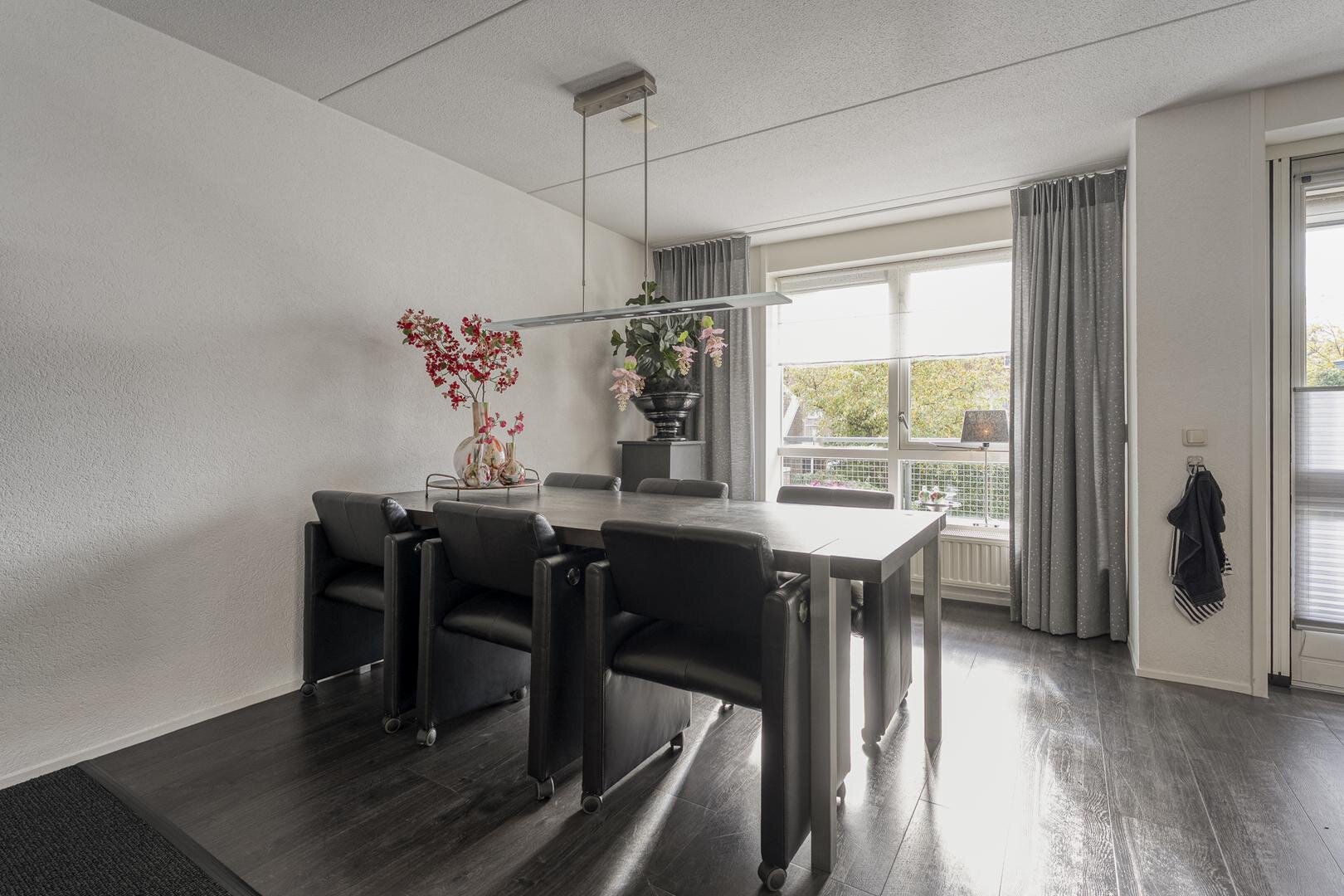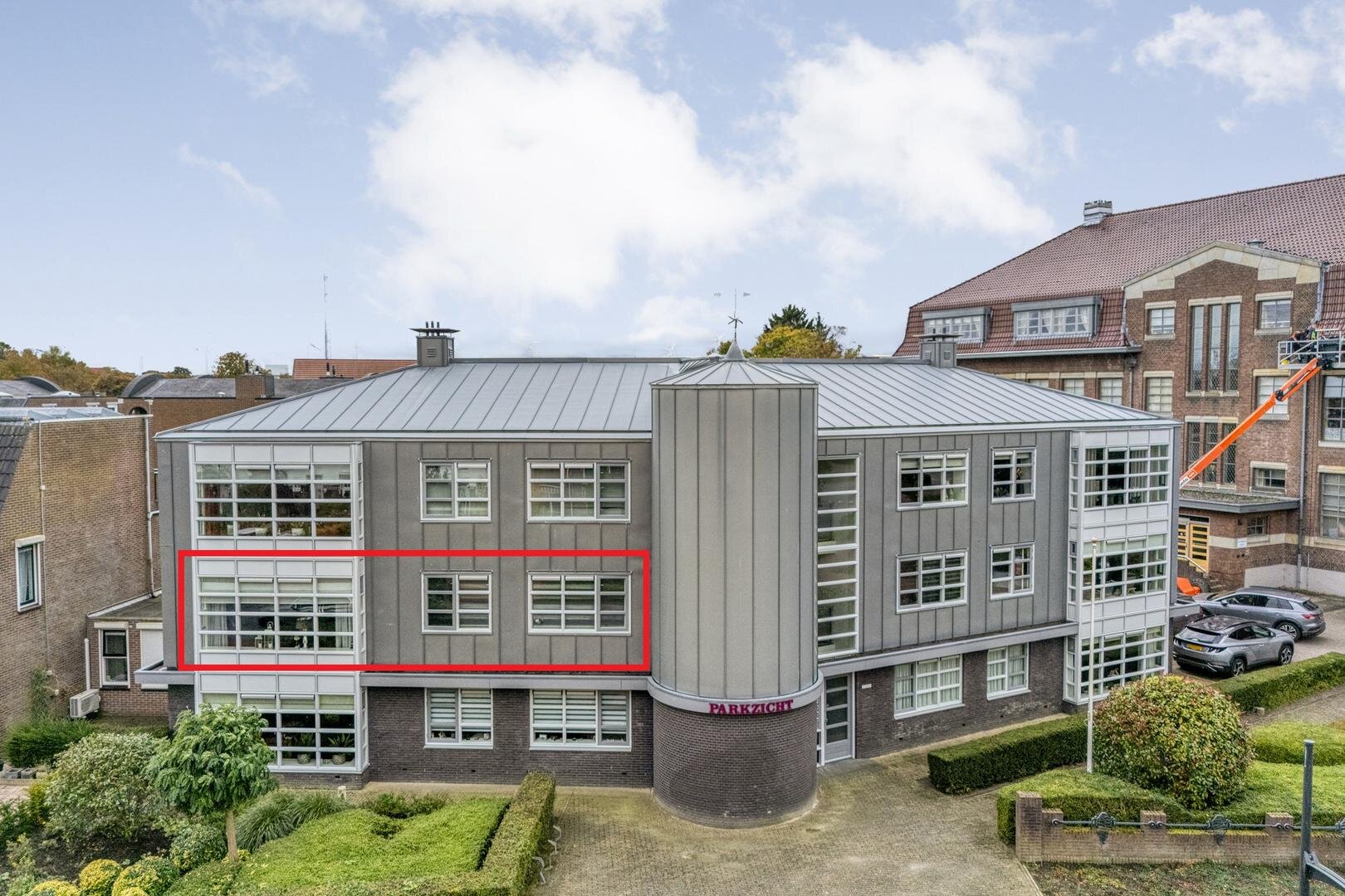 De woonkamer is licht en ruim, met een fraai uitzicht richting het stadspark. Via de woonkamer bereik je het zonnige balkon op het zuiden, waar het heerlijk vertoeven is onder het aanwezige zonnescherm.