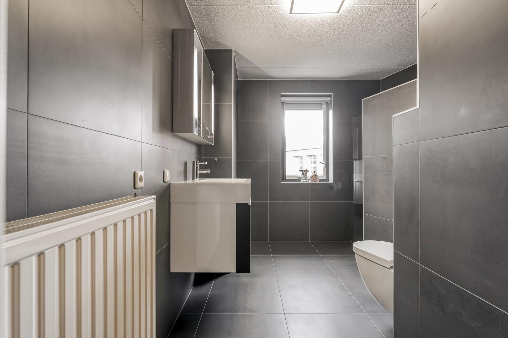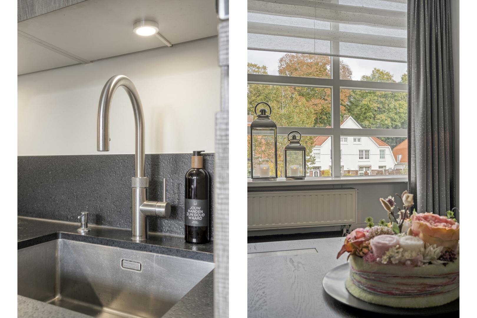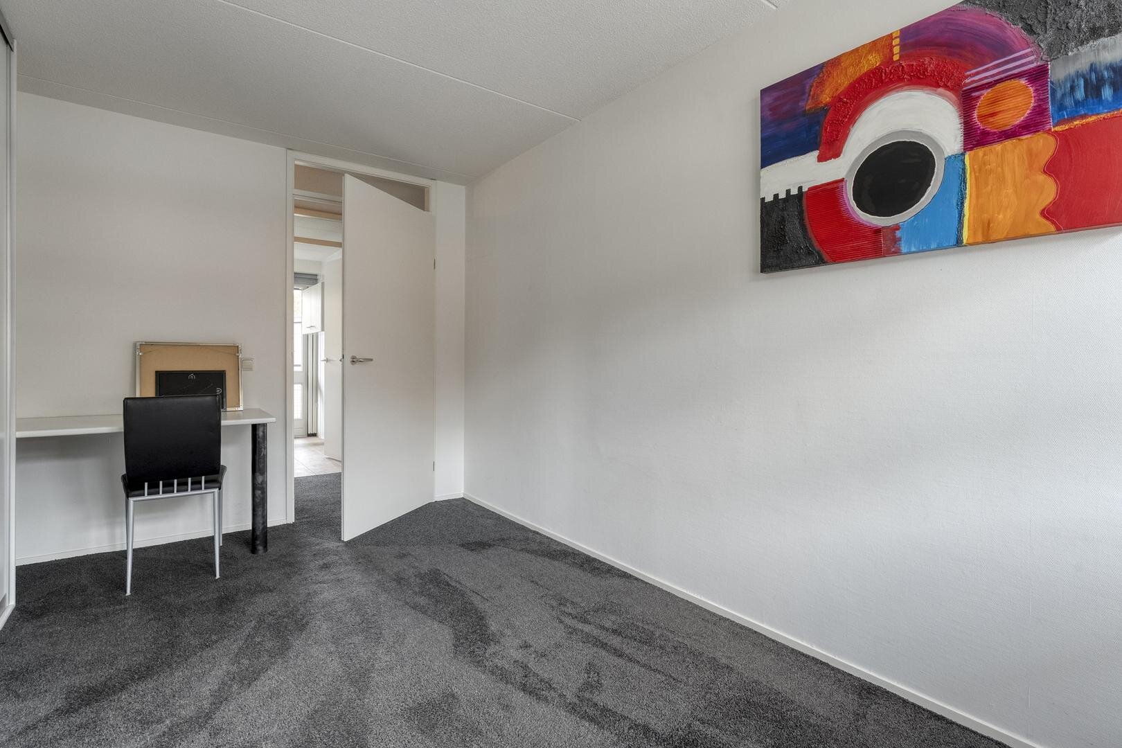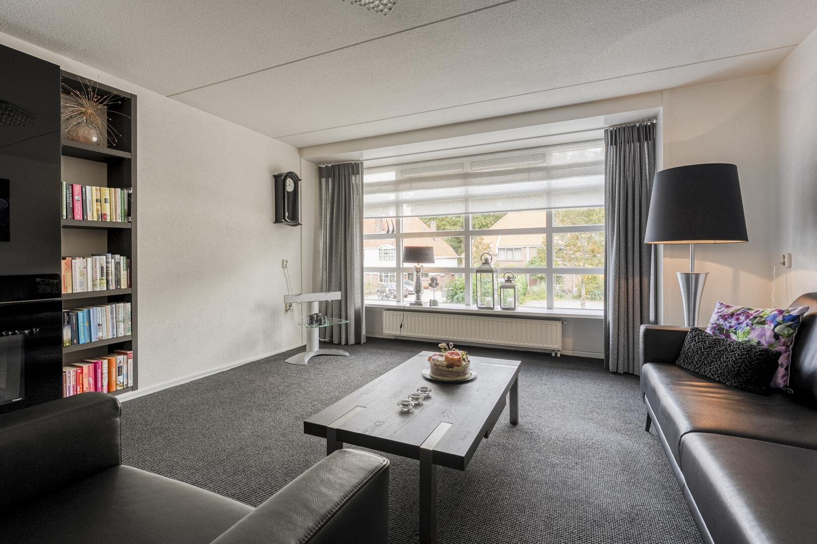 De woonkamer is licht en ruim, met een fraai uitzicht richting het stadspark. Via de woonkamer bereik je het zonnige balkon op het zuiden, waar het heerlijk vertoeven is onder het aanwezige zonnescherm.