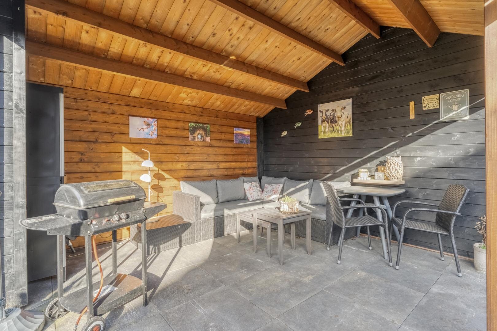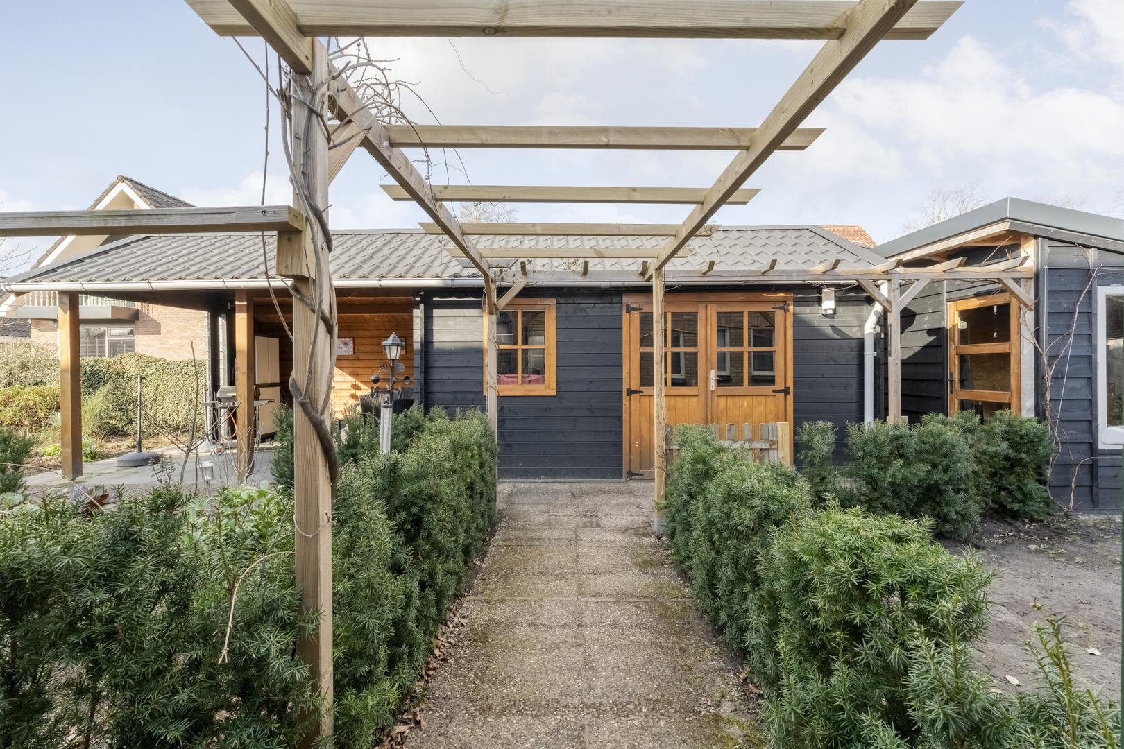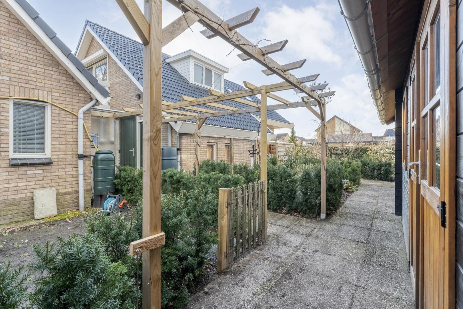 De tuin is gelegen op het noordoosten en biedt volop mogelijkheden om van het buitenleven te genieten. Er zijn meerdere bergingen aanwezig, evenals een garage en een leuke houten overkapping waar het heerlijk zitten is.