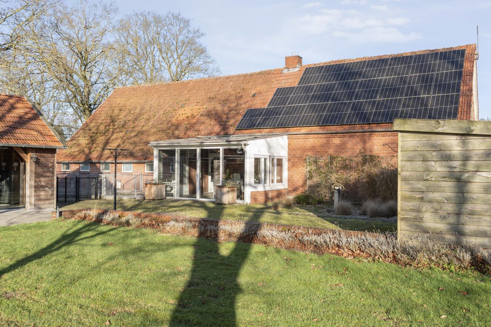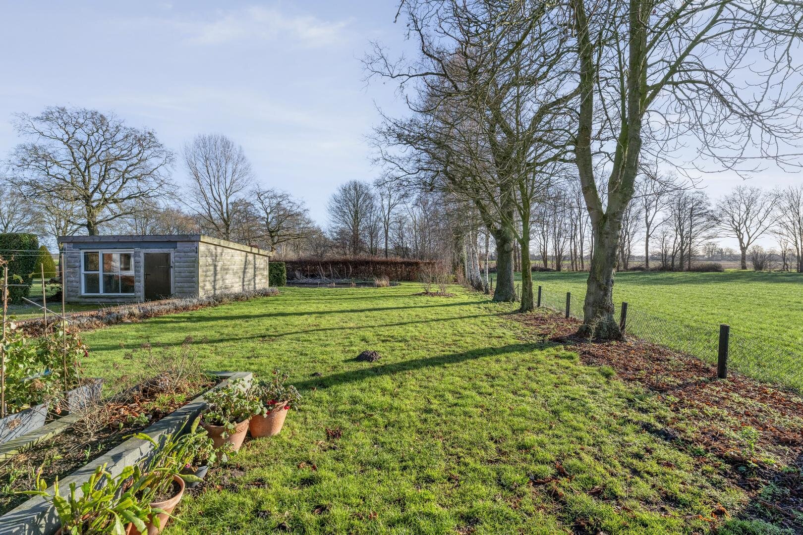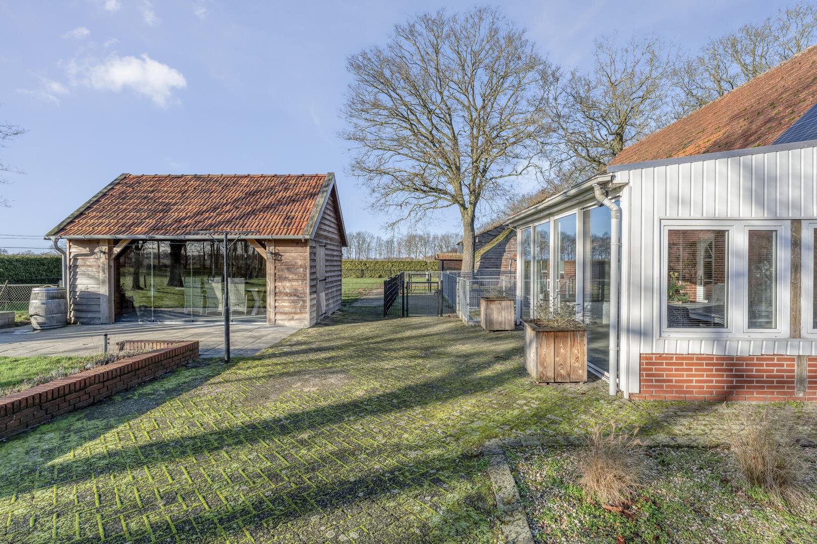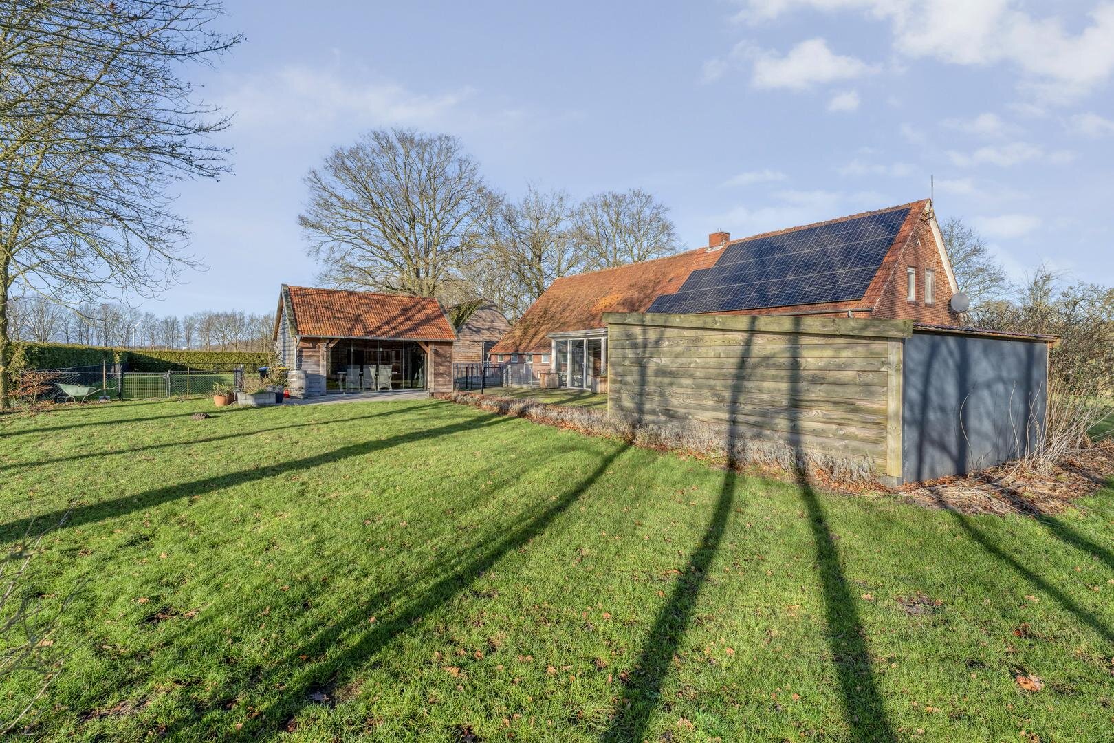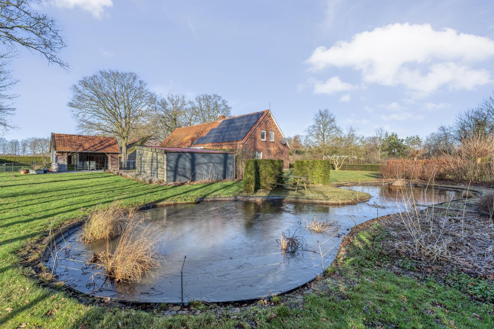Rondom de woning ligt een ruime tuin waar het buitenleven volledig tot zijn recht komt. De aangebouwde overkapping/serre vormt een fijne plek om beschut te zitten en te genieten van het uitzicht en de rust. In de tuin bevindt zich daarnaast een houten tuinhuis met een glazen wand, waardoor u ook hier uitkijkt over het land en het groen. Door de grote vijver, meerdere schuren en de royale opzet is het een ideaal perceel voor wie op zoek is naar vrijheid, ruimte en hobby.