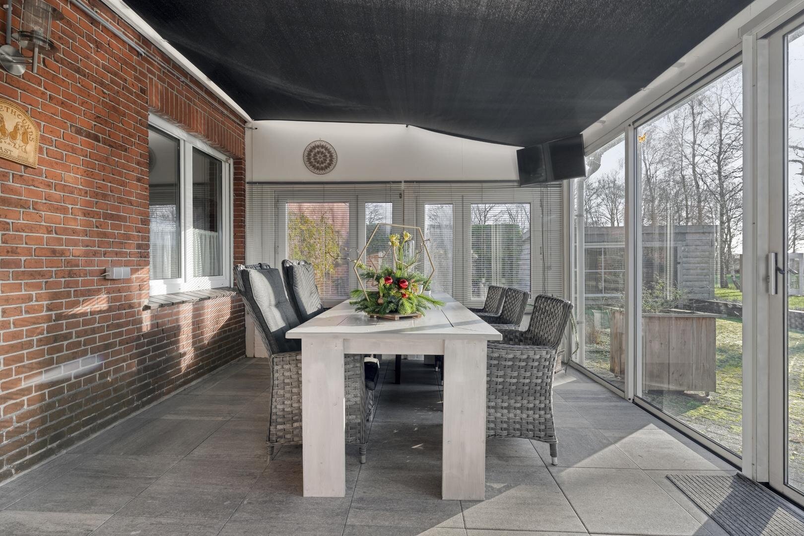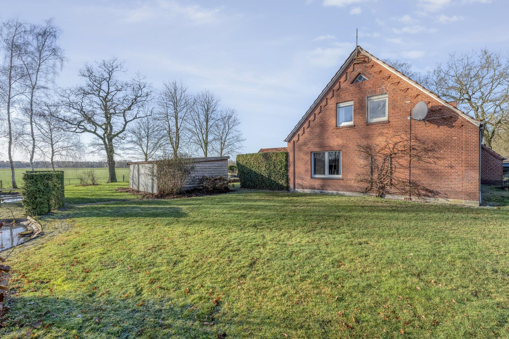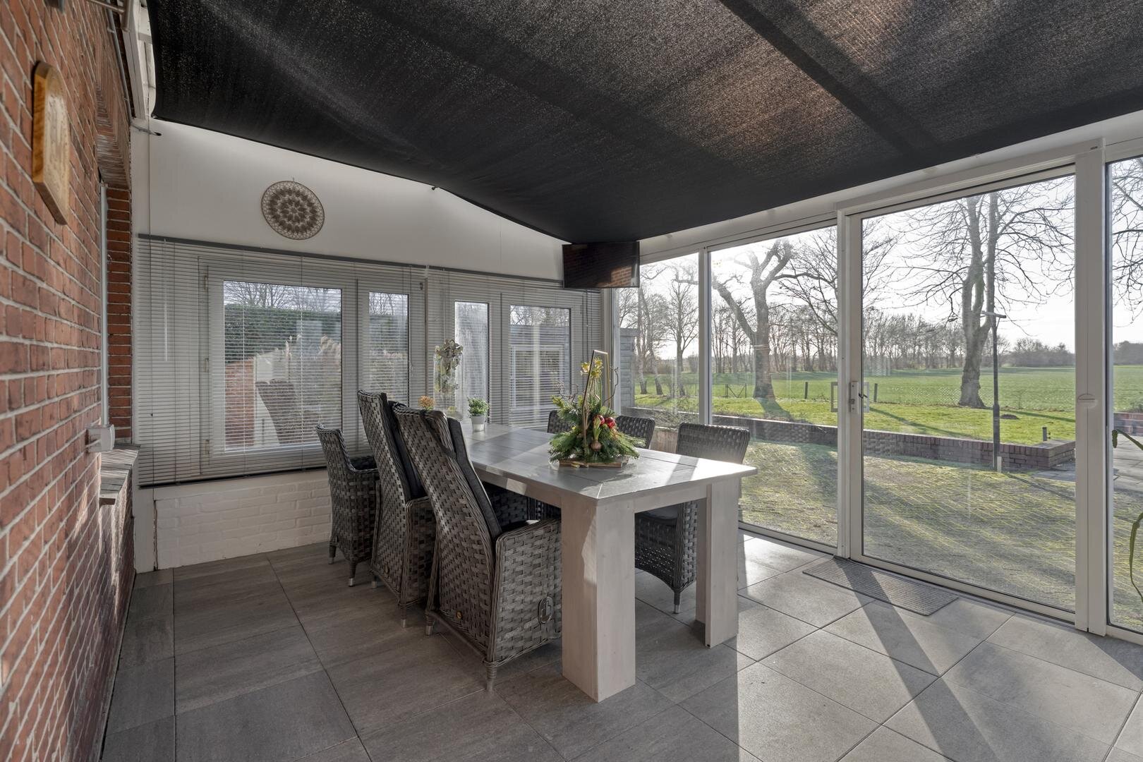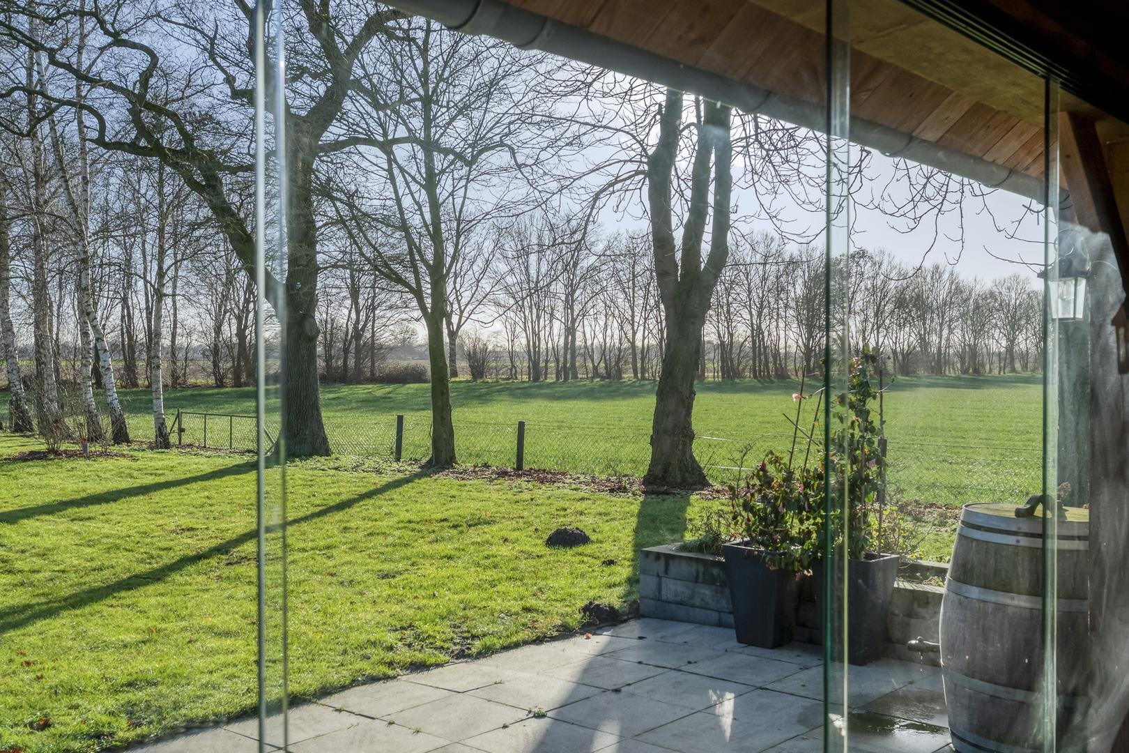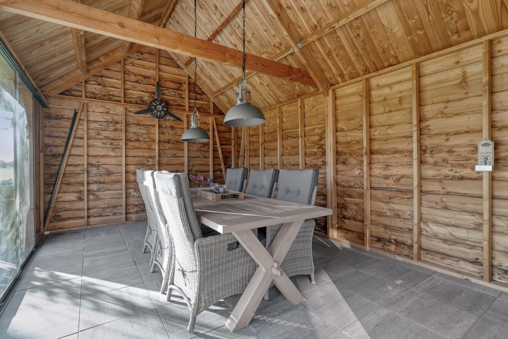Rondom de woning ligt een ruime tuin waar het buitenleven volledig tot zijn recht komt. De aangebouwde overkapping/serre vormt een fijne plek om beschut te zitten en te genieten van het uitzicht en de rust. In de tuin bevindt zich daarnaast een houten tuinhuis met een glazen wand, waardoor u ook hier uitkijkt over het land en het groen. Door de grote vijver, meerdere schuren en de royale opzet is het een ideaal perceel voor wie op zoek is naar vrijheid, ruimte en hobby.