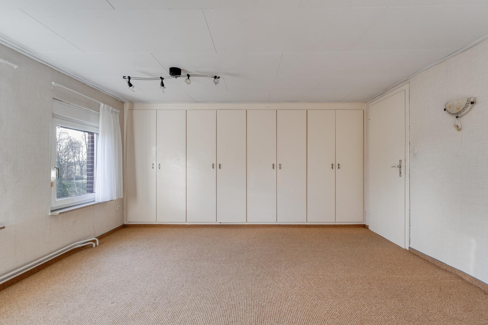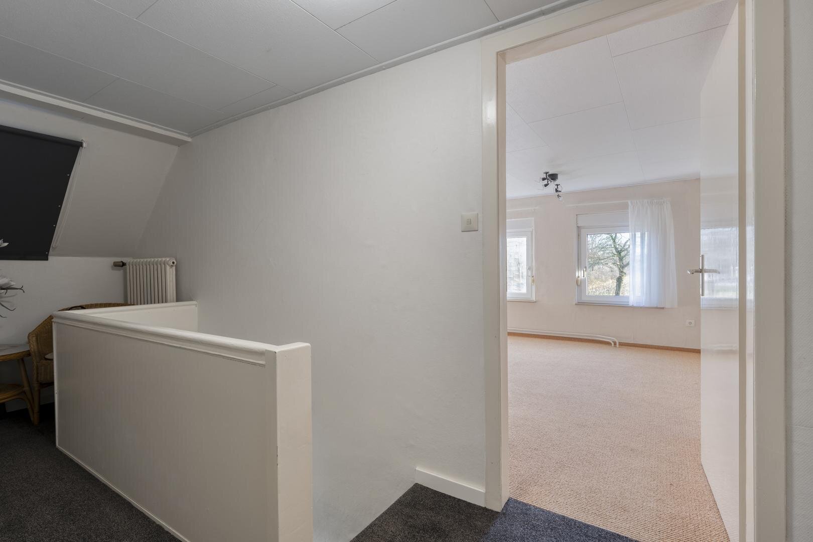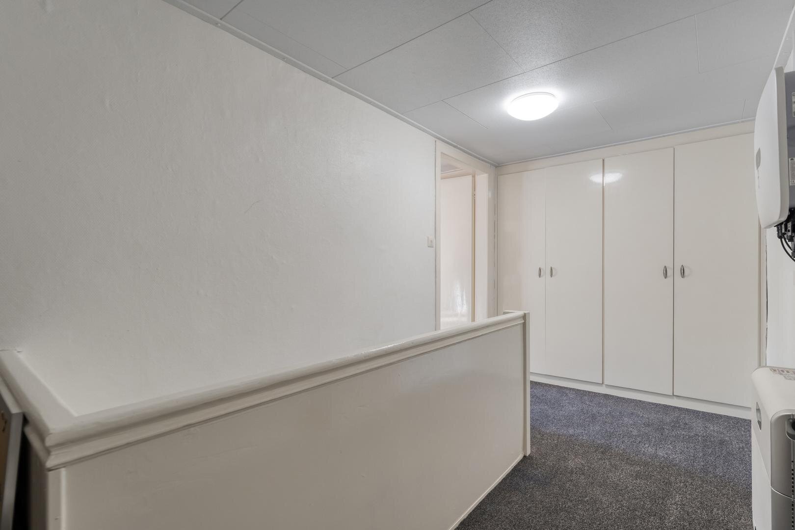 Eerste verdieping: overloop met vaste kasten. Ruime slaapkamer met vaste kast.
