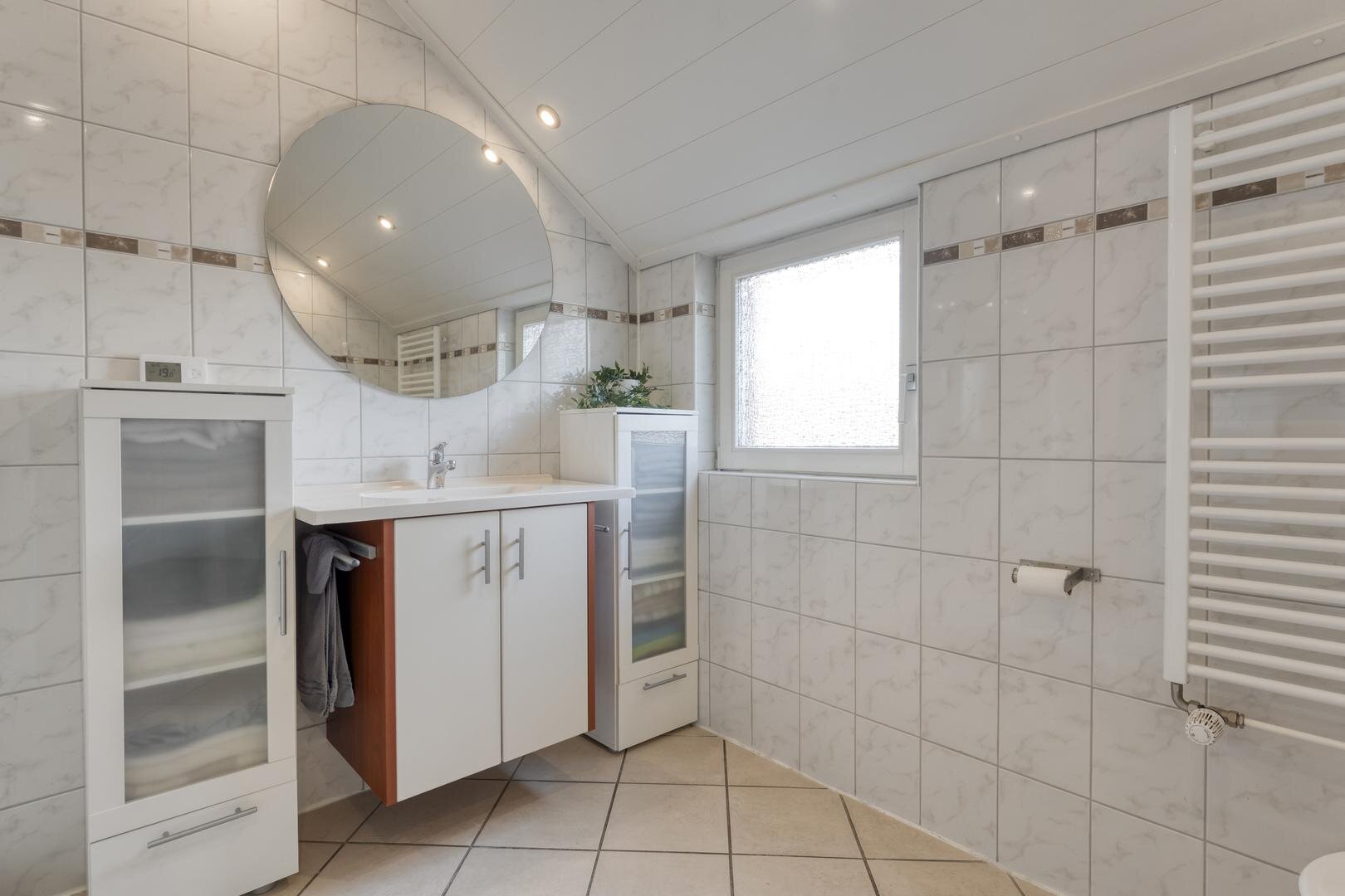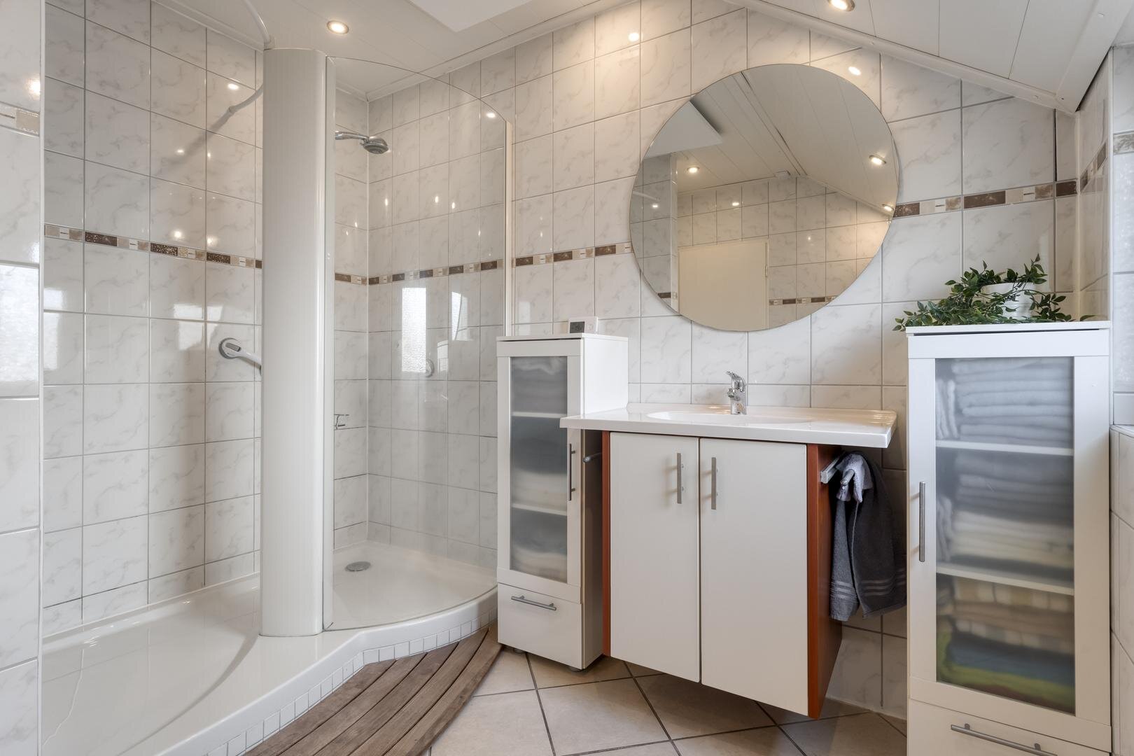 2e Hal/bijkeuken met toilet en washok. Badkamer voorzien van wastafelmeubel, toilet en douche.