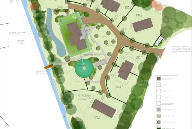 De kavel ligt beschut door de bestaande groenstructuur aan de oostzijde en heeft een ruime tuin richting het zuiden.