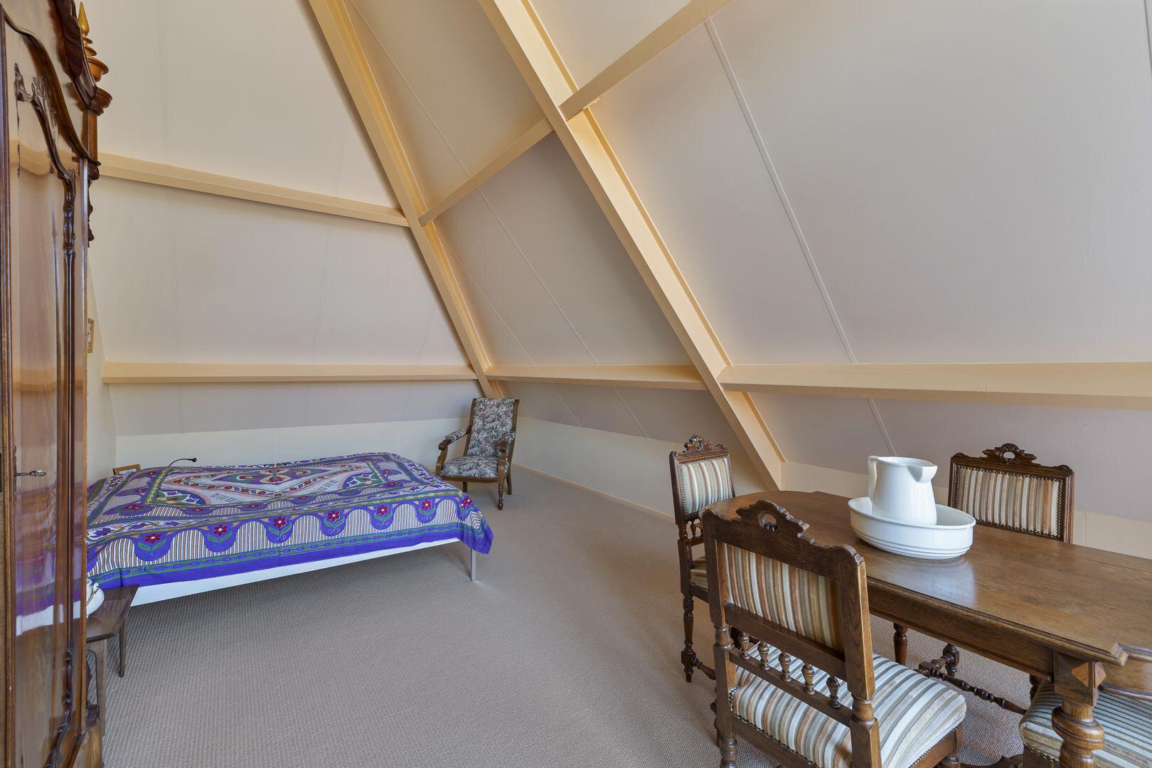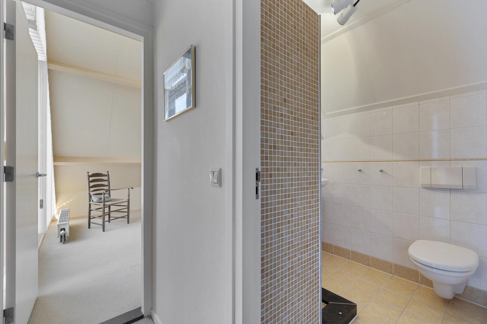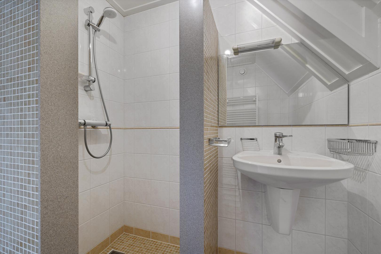 Eerste verdieping: overloop met berging. Twee ruime slaapkamers voorzien van vloerbedekking en toegang tot het riante dakterras met uitkijk over de mooie tuin. Badkamer met wastafel, douche en toilet.