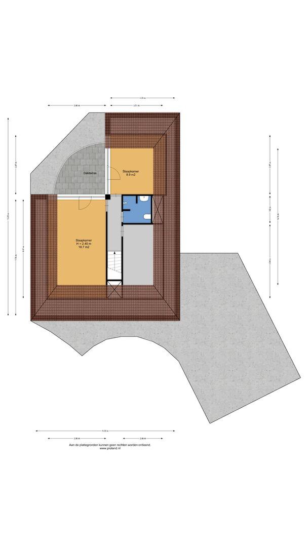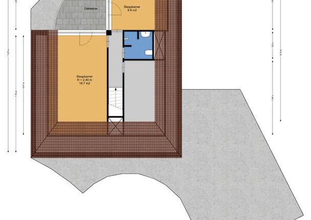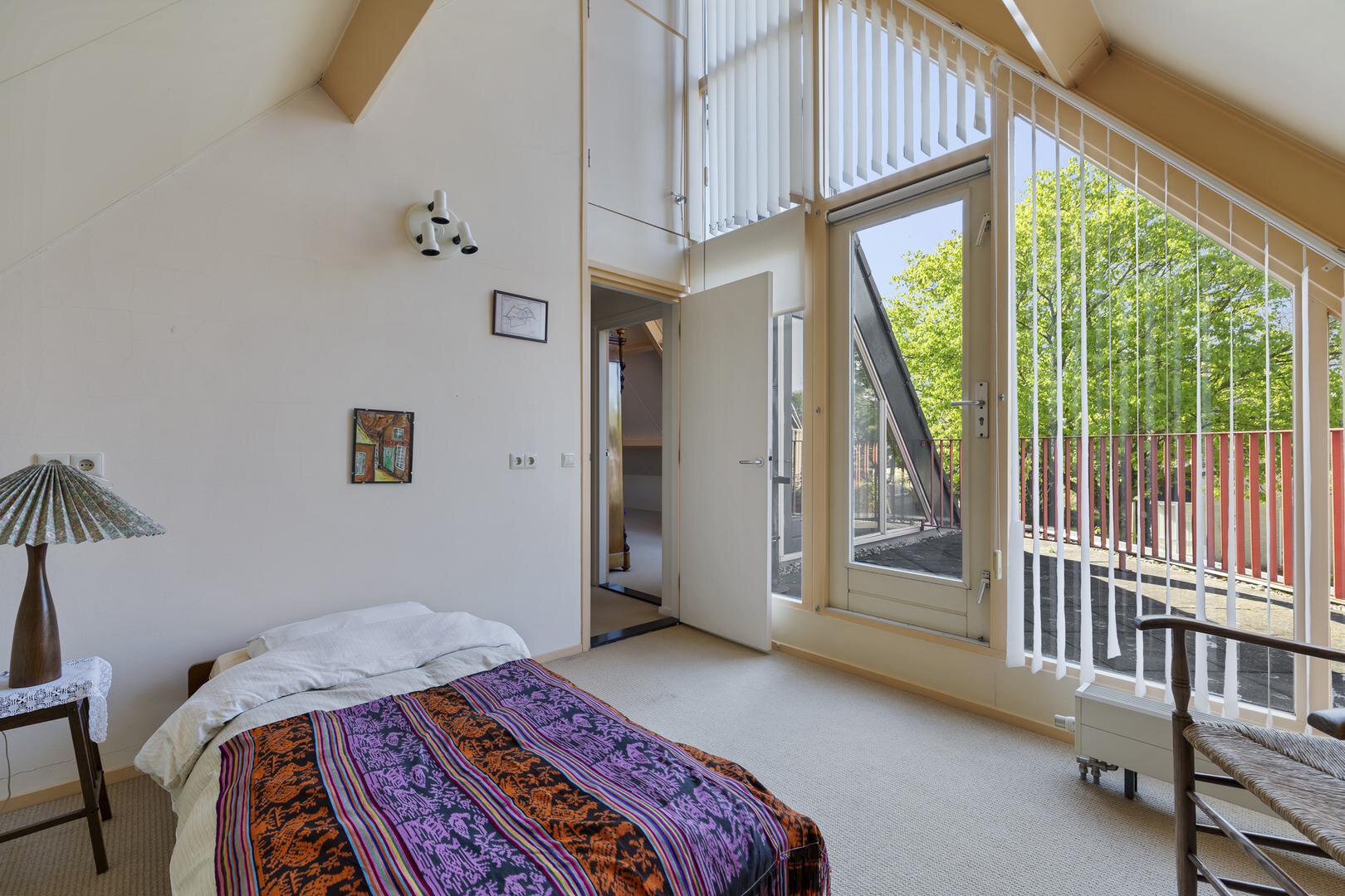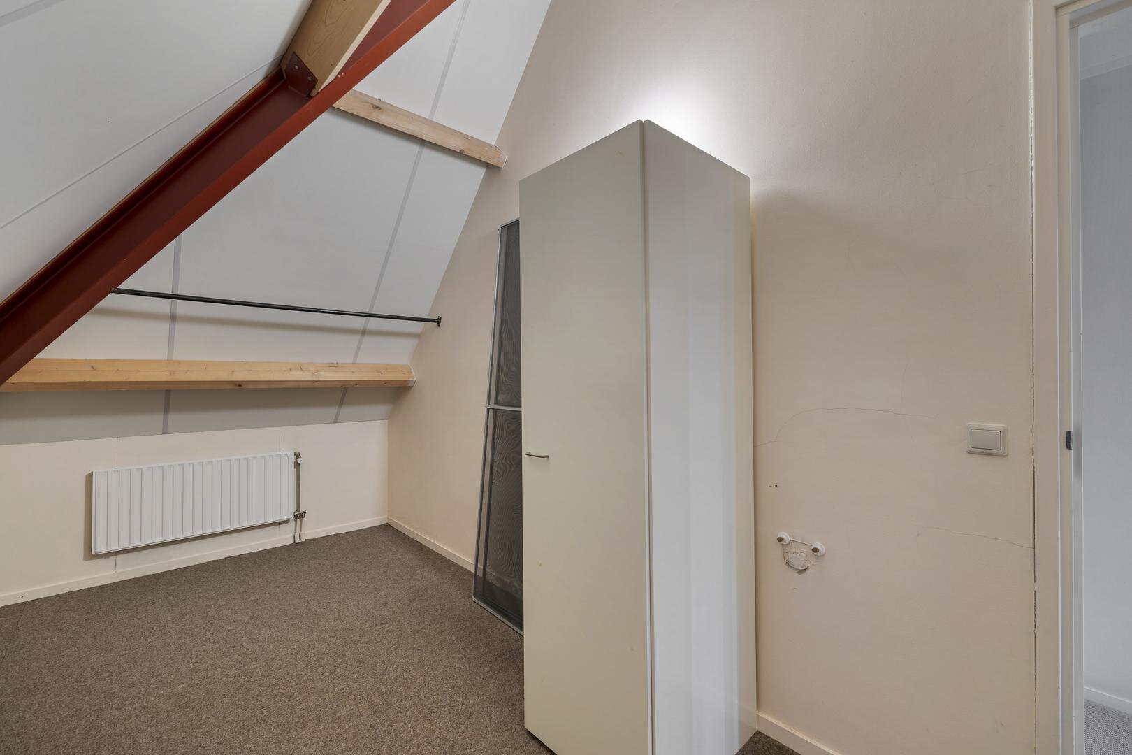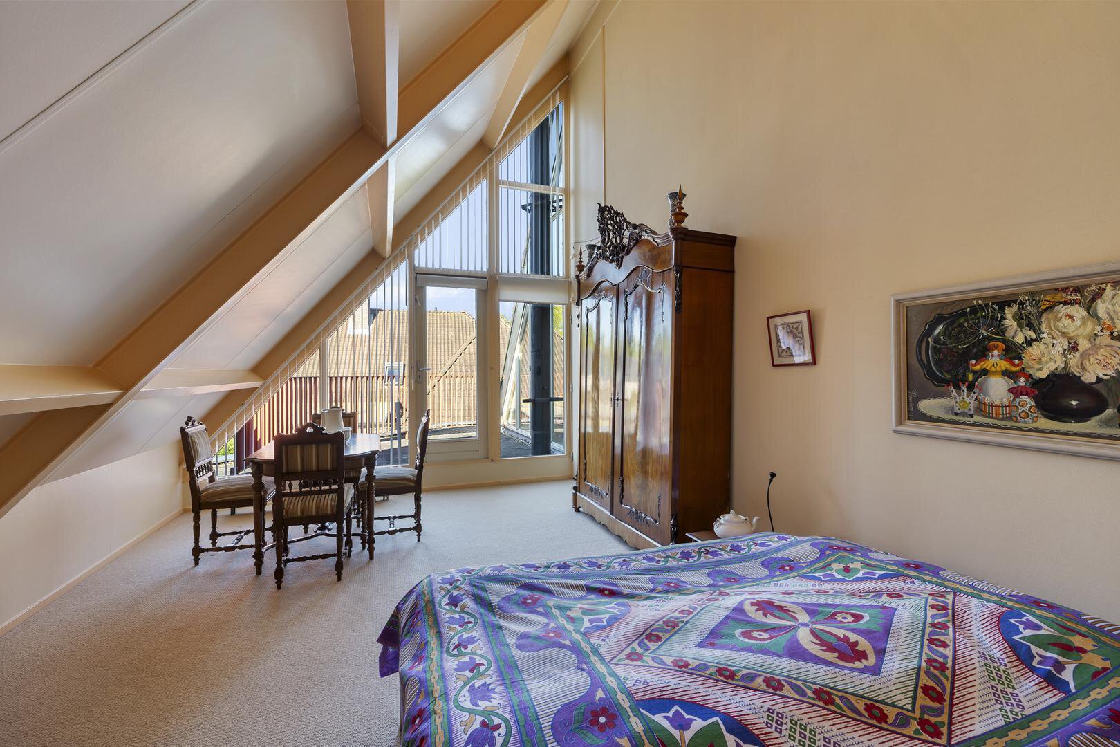 Eerste verdieping: overloop met berging. Twee ruime slaapkamers voorzien van vloerbedekking en toegang tot het riante dakterras met uitkijk over de mooie tuin. Badkamer met wastafel, douche en toilet.