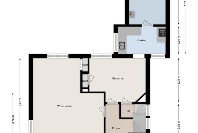 Begane grond: hal/entree met toilet. L-vormige woonkamer met uitzicht over het water/kanaal en voorzien van een laminaatvloer. Eetkamer met laminaatvloer. Keuken met 4pits gastoestel en afzuigkap. Berging met wasmachineaansluiting, cv-ketel en toegang naar de tuin.