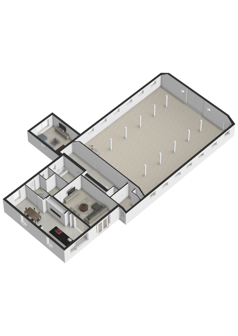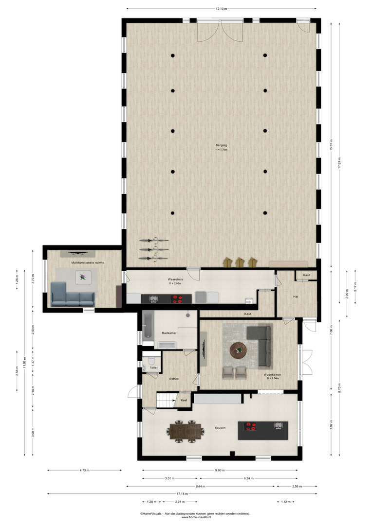 Begane grond: hal/entree met toilet. Woonkeuken met kook-en spoeleiland, 2 ovens, vaatwasser, koelkast, vriezer, inductiekookplaat met geïntegreerde afzuiging, airconditioning. Woonkamer voorzien van airconditioning en openslaande deuren naar het terras. Badkamer met ligbad, inloopdouche en dubbele wastafel met meubel. Tweede hal (voordeur) met vaste kast. Bijkeuken met keukenblok, boiler, warmtepomp en wasmachineaansluiting. In de woonkamer, hal en keuken/eetkamer ligt parket. Slaapkamer/ recreatieruimte. De hele begane grond heeft vloerverwarming. 2 Grote schuren van circa 20x65mtr en 15x48mtr.
