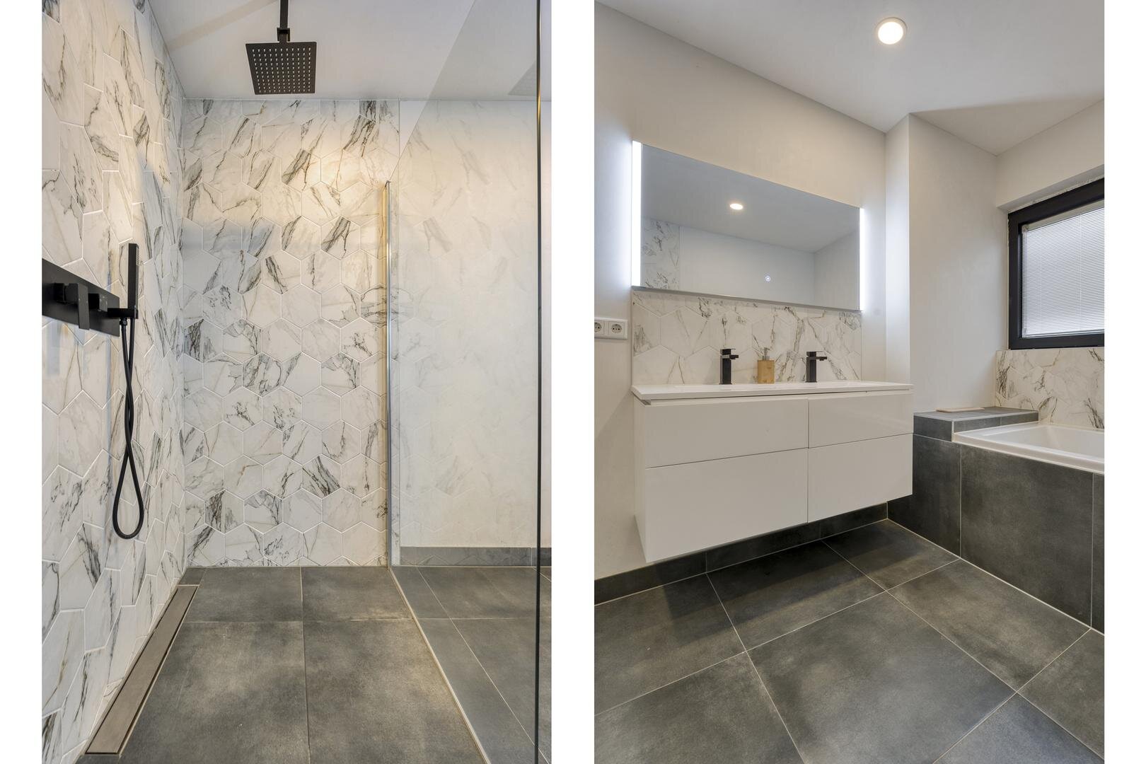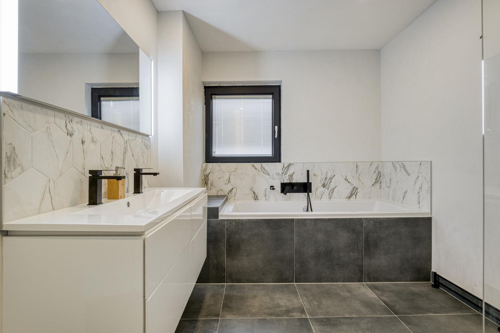 Eerste verdieping: overloop. 3 Slaapkamers voorzien van airconditioning en laminaatvloer. De grootste slaapkamer heeft een inloopkast, een vrijstaand ligbad en aangrenzend een badkamer voorzien van een douche, wastafel met meubel en toilet.