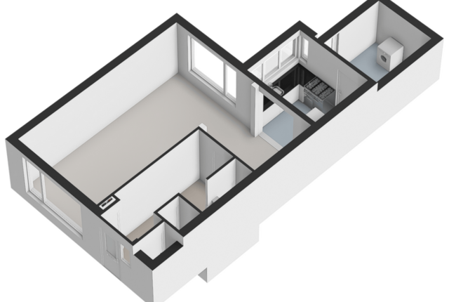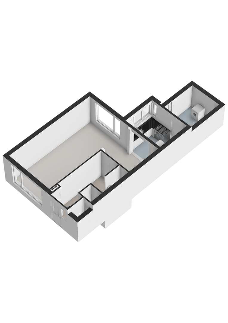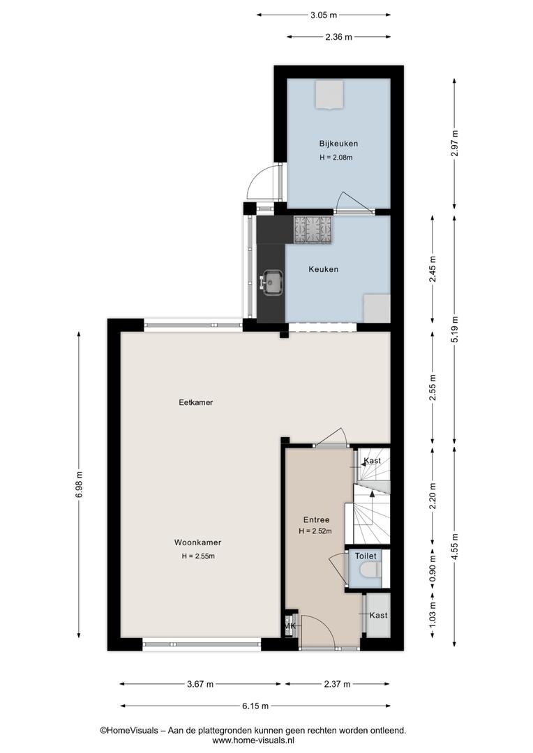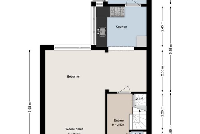 Begane grond: Entree met toilet en trap naar de eerste verdieping. L-vormige woon/eetkamer. Half open keuken met gaskookplaat en oven. Bijkeuken met wasmachineaansluiting.