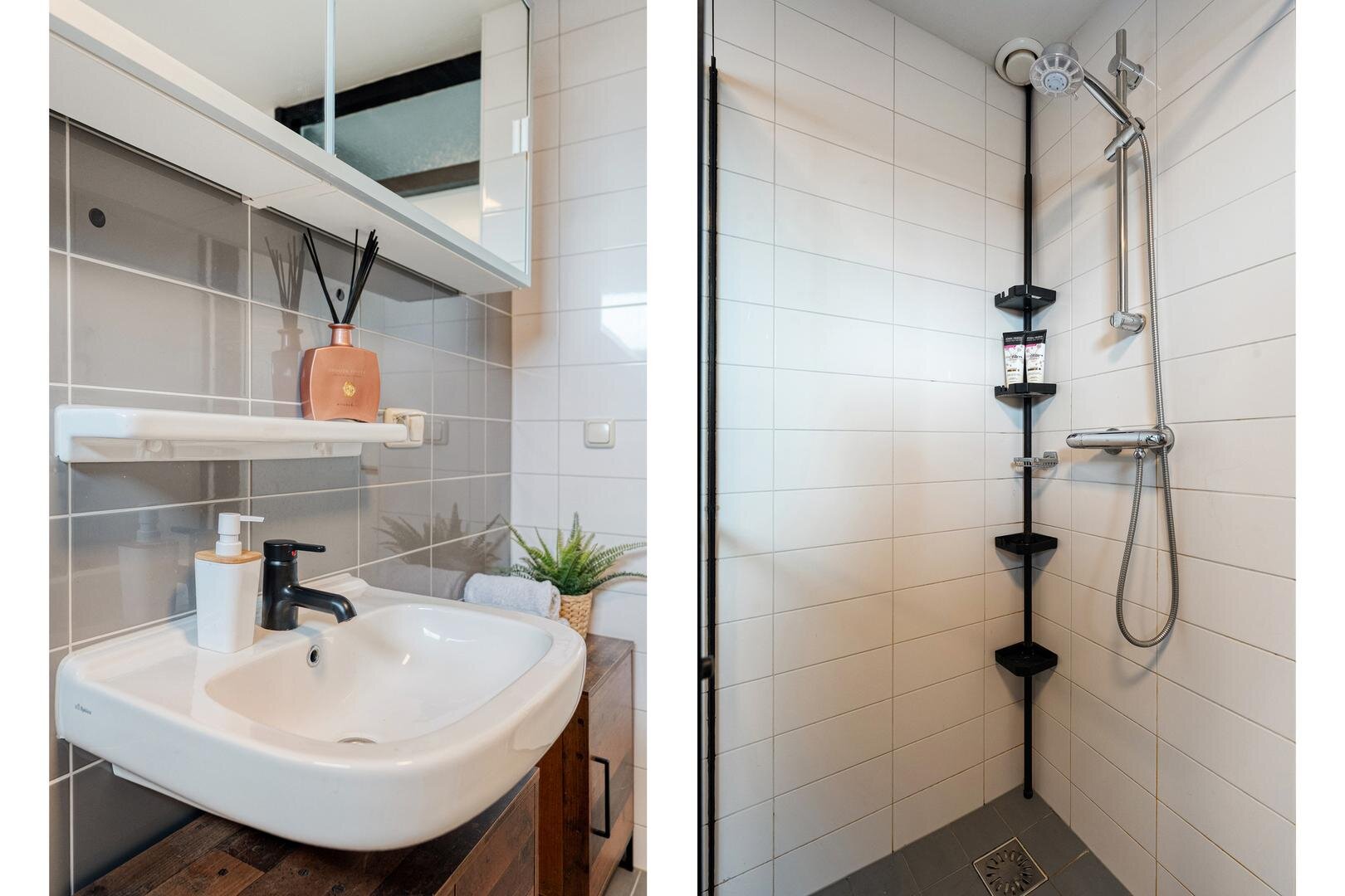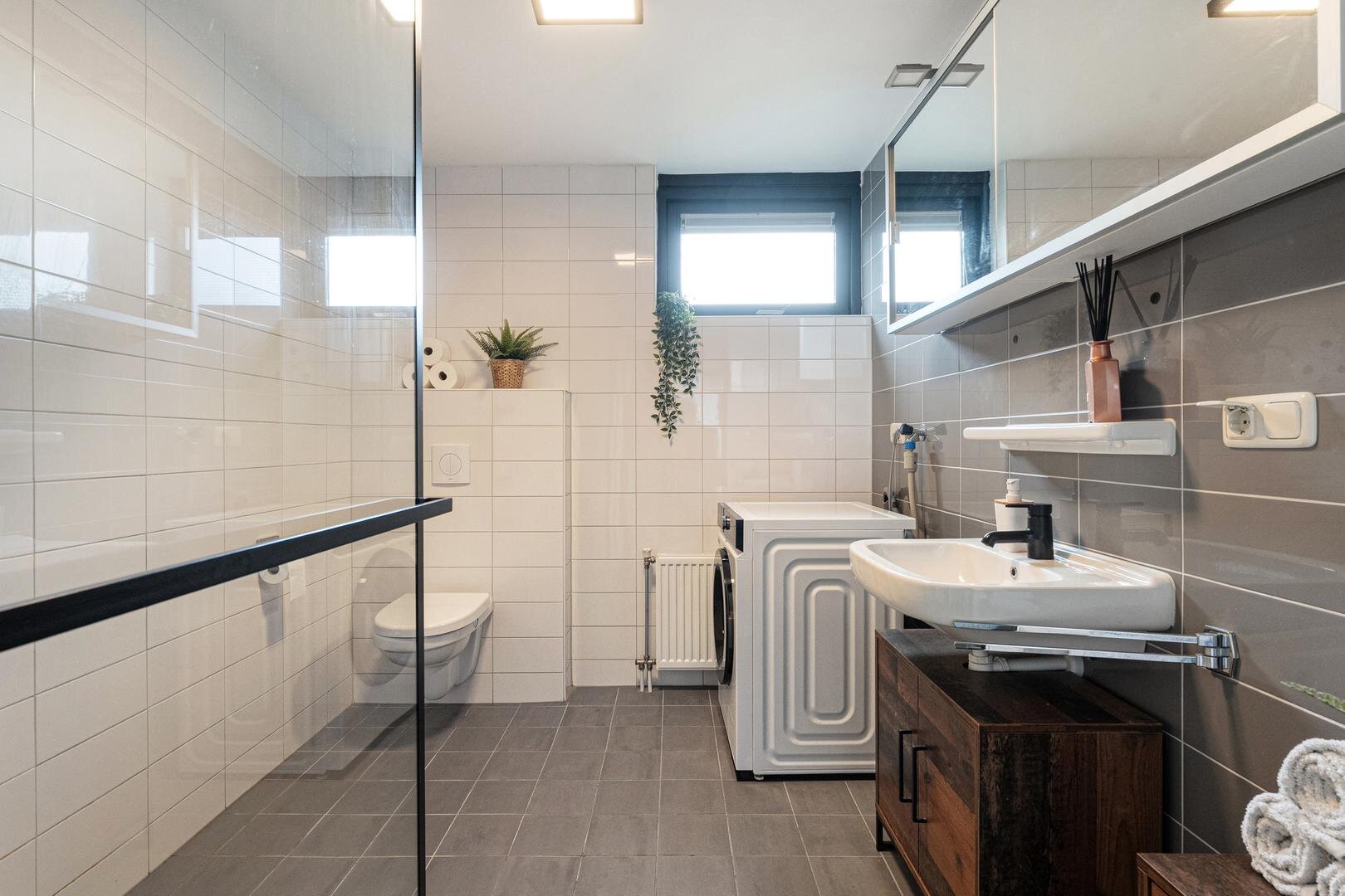 Eerste verdieping: overloop. drie slaapkamers waarvan één voorzien van airco en rolluik. Badkamer met toilet, douche, wastafel en wasmachineaansluiting.