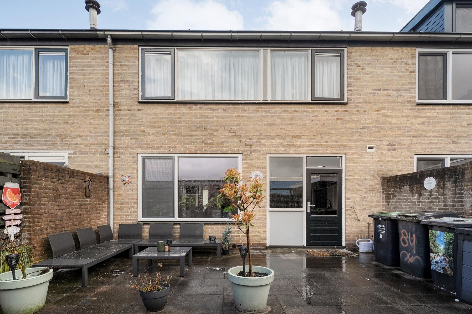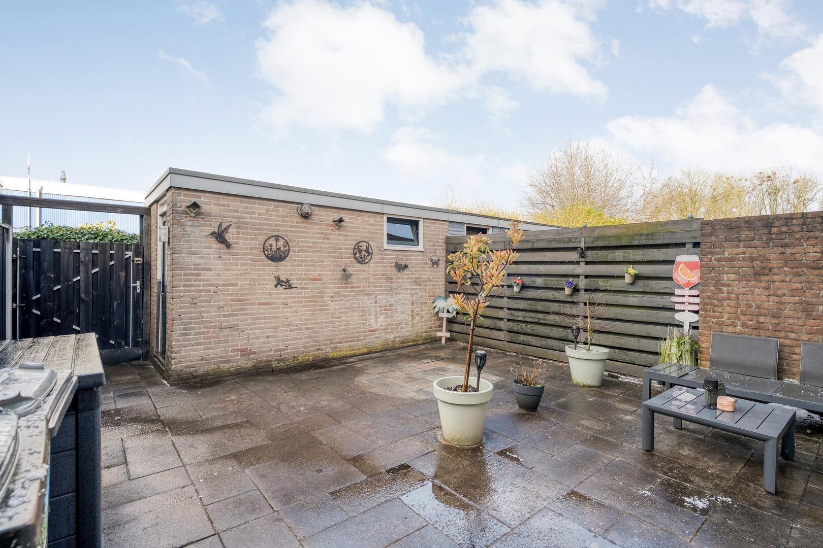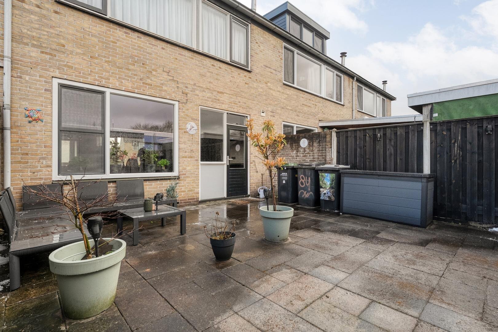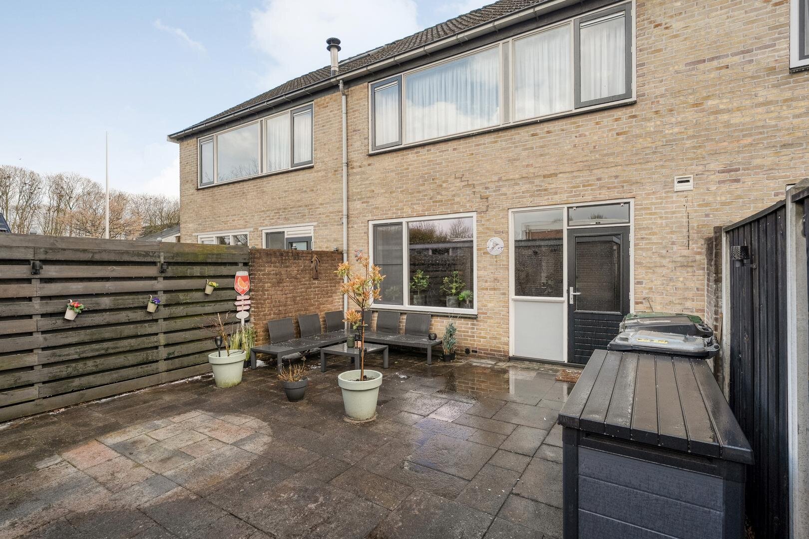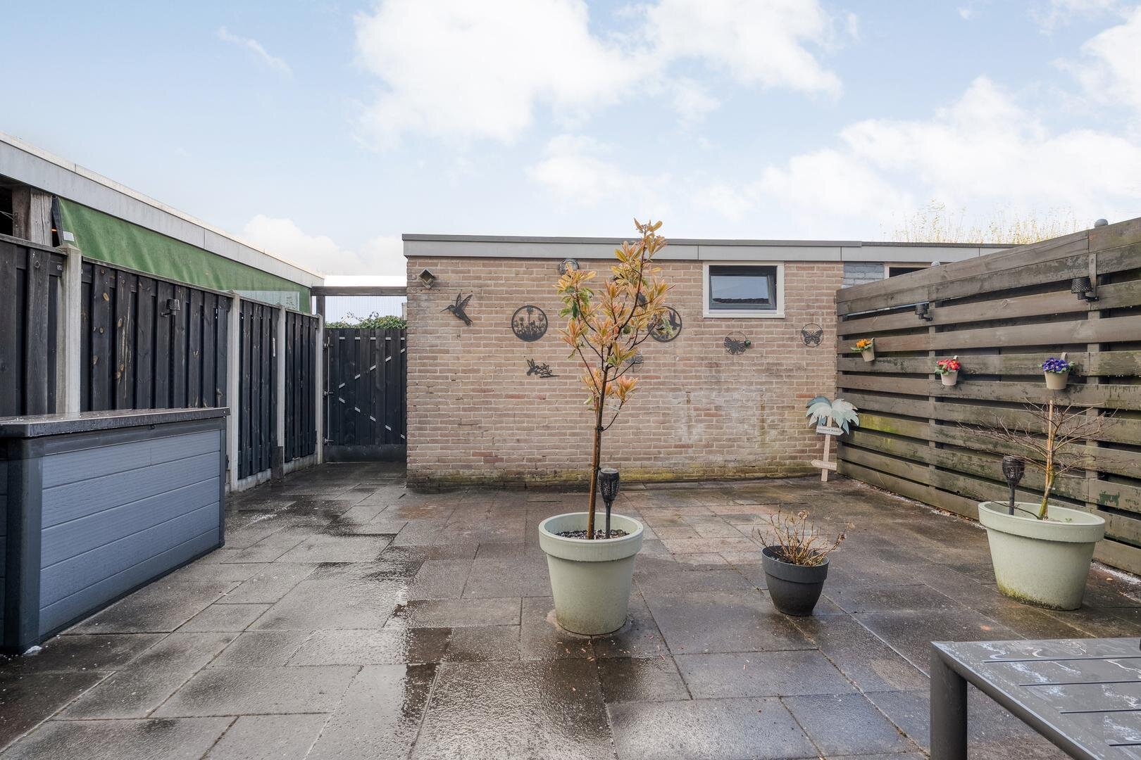 De achtertuin is gelegen op het noorden en biedt een fijne plek om te ontspannen. Achterin de tuin bevindt zich een stenen berging, ideaal voor het stallen van fietsen en het opbergen van tuinspullen. Dankzij de achterom is de tuin ook gemakkelijk bereikbaar.