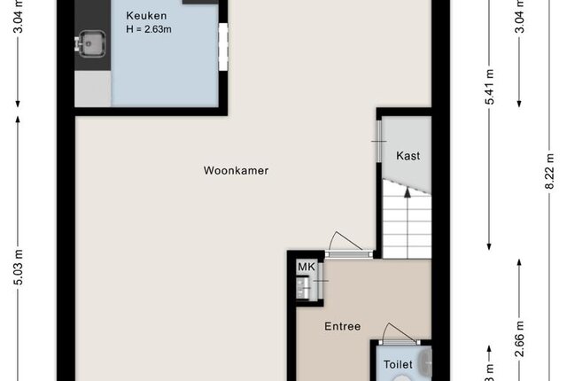 Begane grond: Hal/entree met toilet en vaste trap naar de eerste verdieping, lichte Z-woonkamer voorzien van laminaatvloer. Half open keuken met inbouwapparatuur: inductiekookplaat, afzuigkap, vaatwasser, koelkast, vriezer en combi-oven. Tuin met achterom op het noorden. Berging.
