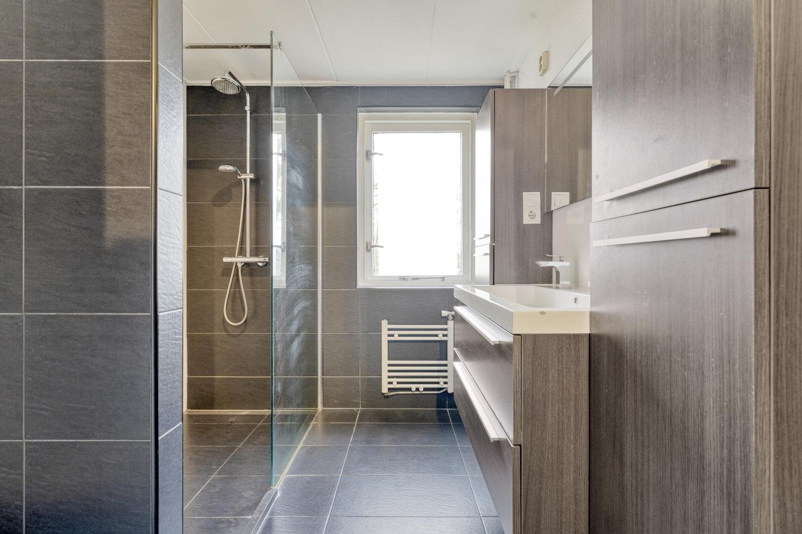 Eerste verdieping: Overloop met vaste kasten. Drie ruime slaapkamers waarvan twee voorzien van vaste kasten en één met balkon. Badkamer voorzien van dubbele wastafel, inloopdouche en toilet.