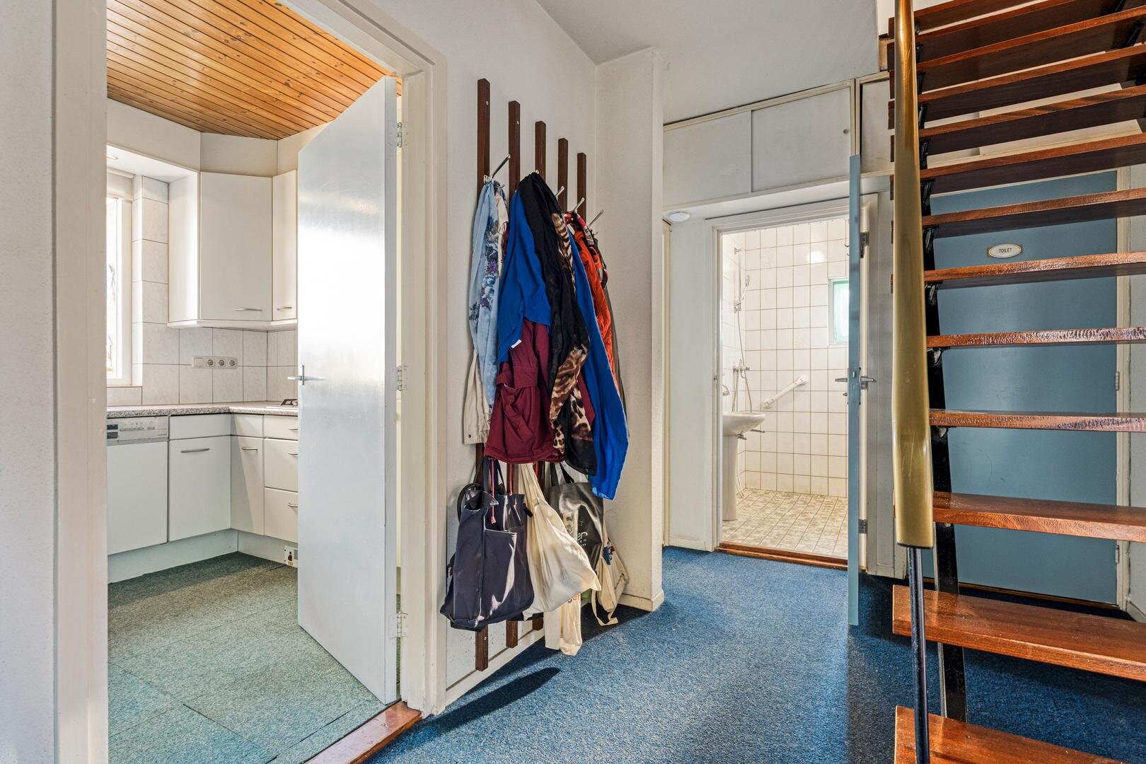 Begane grond: Hal/entree met toilet, trap naar de eerste verdieping en badkamer voorzien van een inloopdouche en wastafel. Woonkamer met vaste kast en deur naar de tuin. dichte keuken voorzien van vaatwasser, gaskookplaat, koelkast en wasmachineaansluiting. Aangebouwde slaapkamer (volledig geïsoleerd).