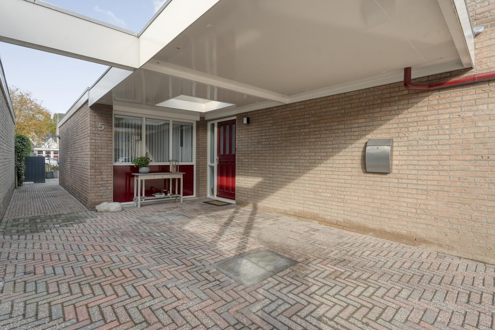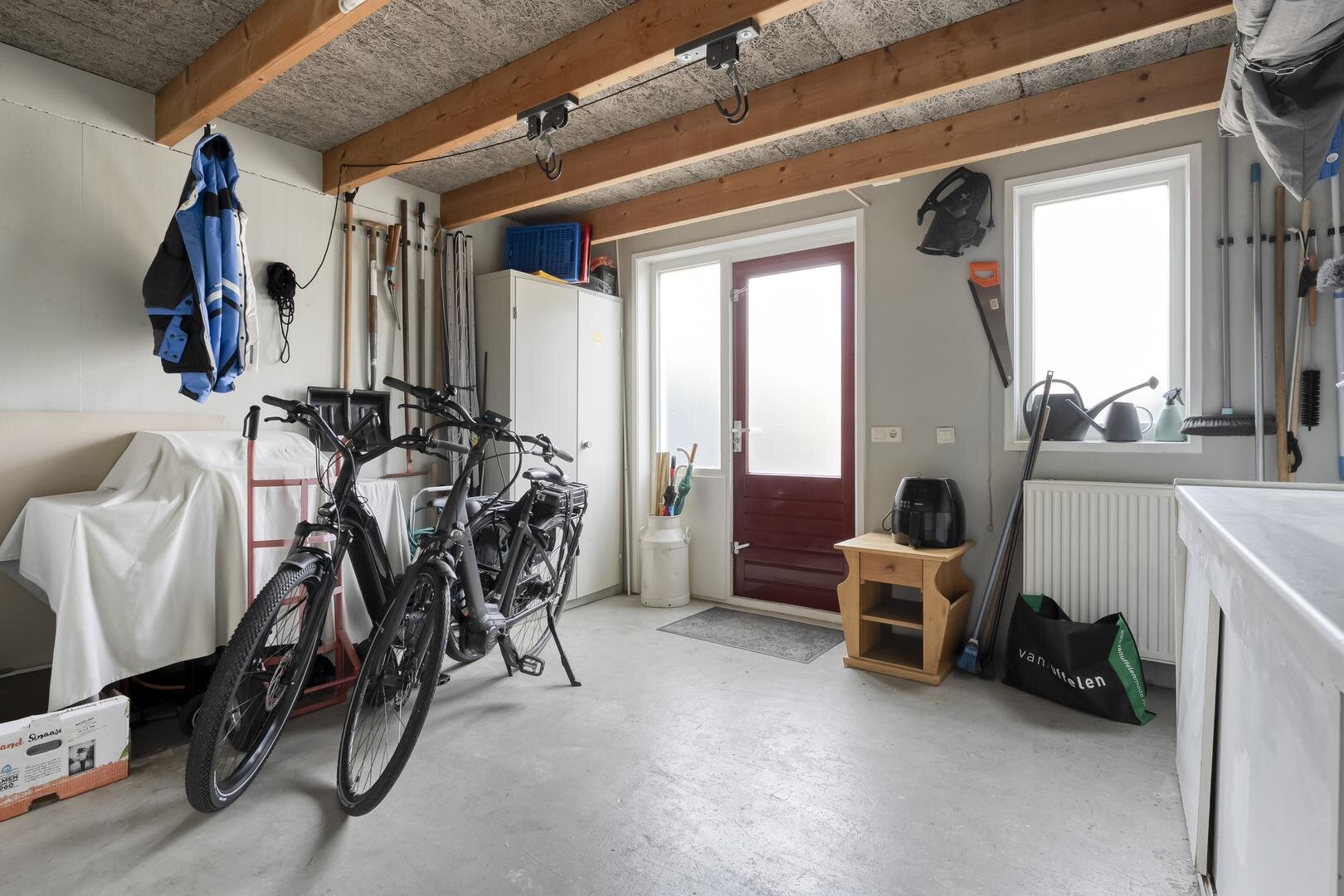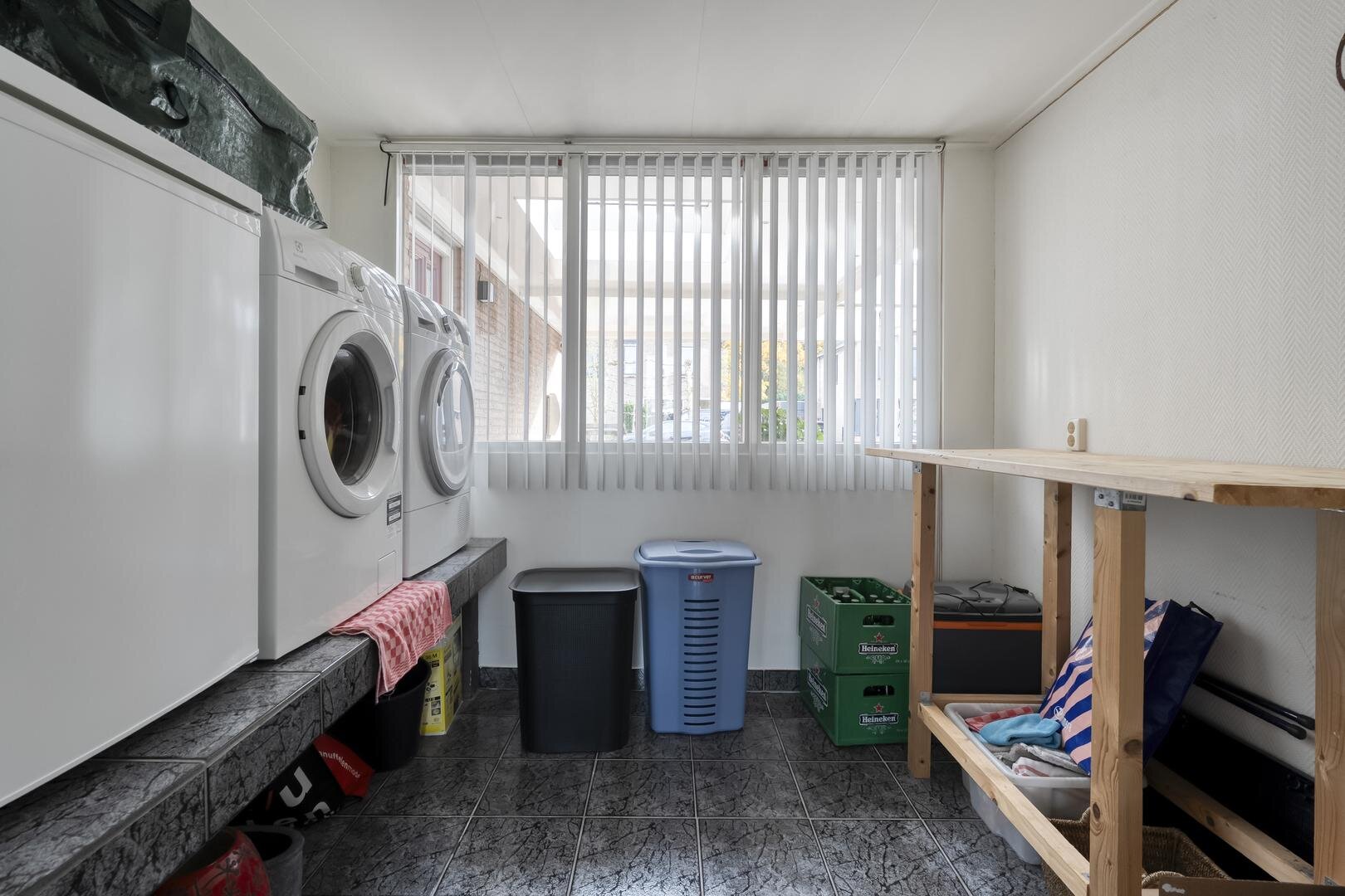 Berging met wasruimte in de voormalige geïsoleerde garage. Carport.