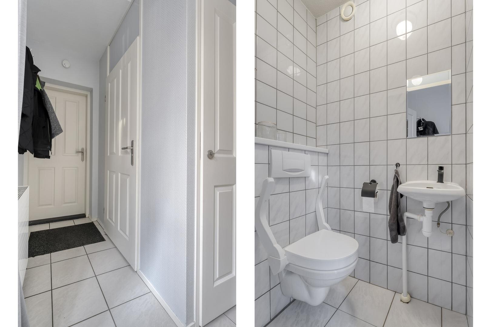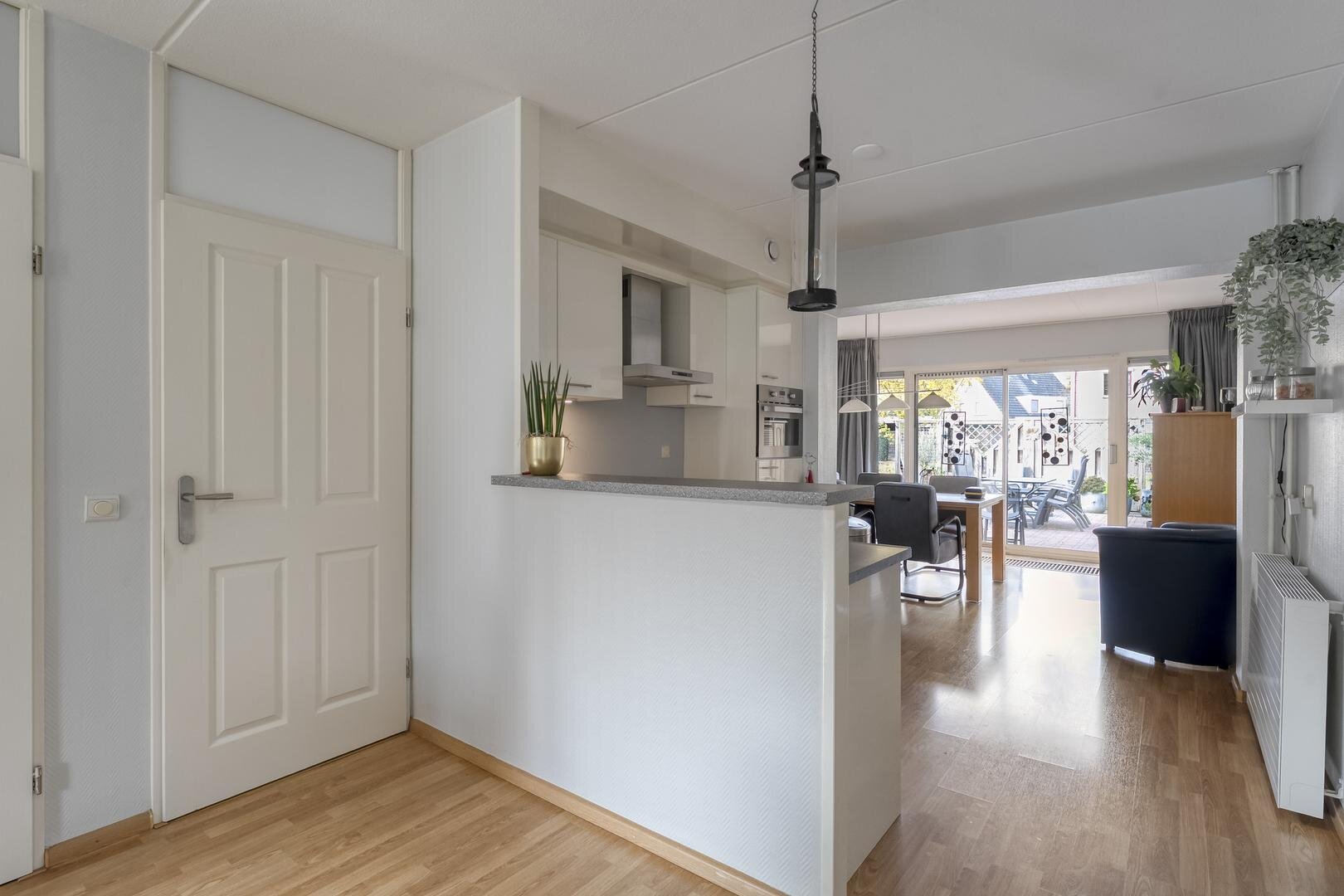 Begane grond: Entree met toilet en trap naar de eerste verdieping. L-vormige woonkamer voorzien van gashaard en provisiekast. Halfopen woonkeuken voorzien van inbouwapparatuur; keramische kookplaat, afzuigkap, vaatwasser, koelkast en combi-oven en schuifpui naar de fraaie tuin.