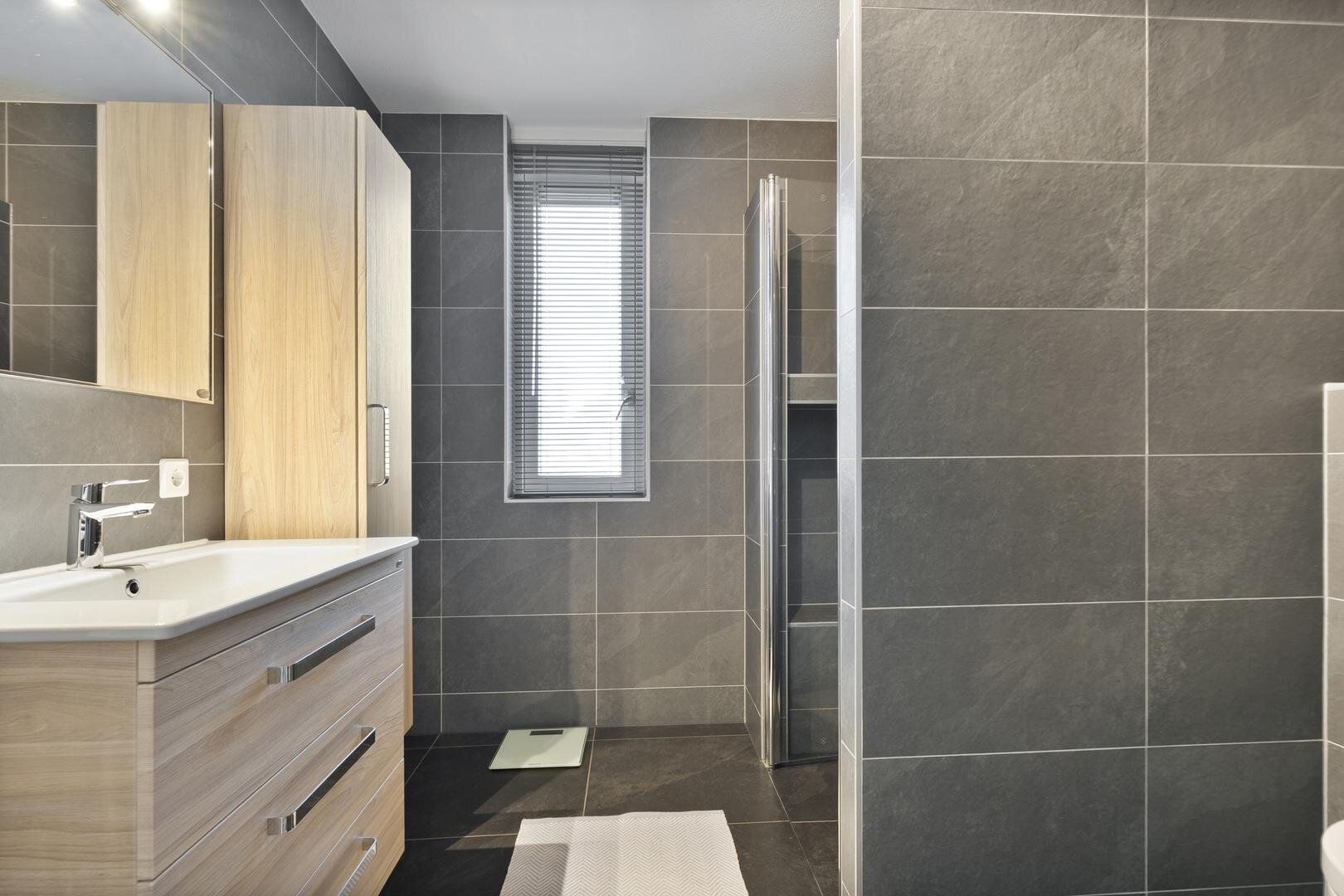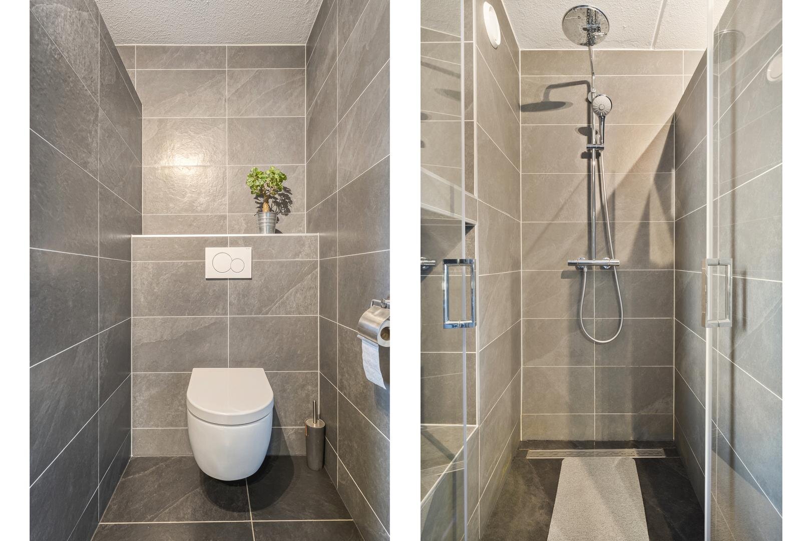 Eerste verdieping: Overloop. Twee ruime slaapkamers waarvan één met vaste kast. Eenvoudig weer drie van te maken. Nagenoeg nieuwe en fraaie badkamer voorzien van inloopdouche, wastafelmeubel en toilet.