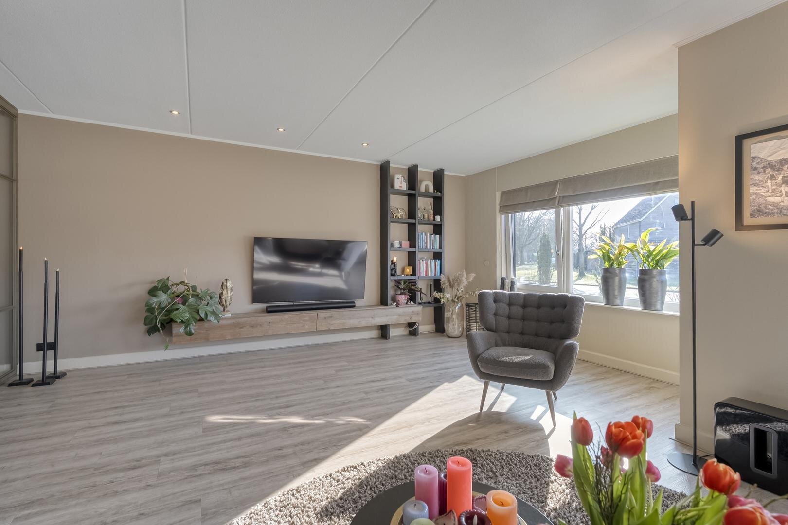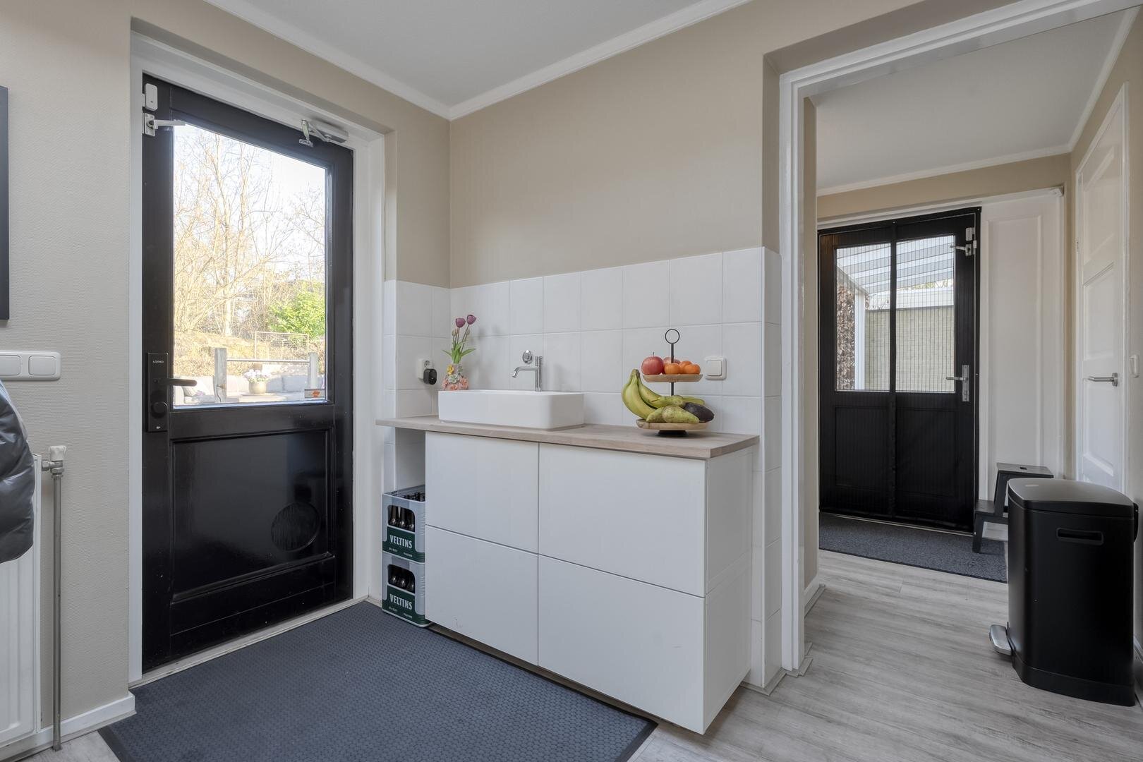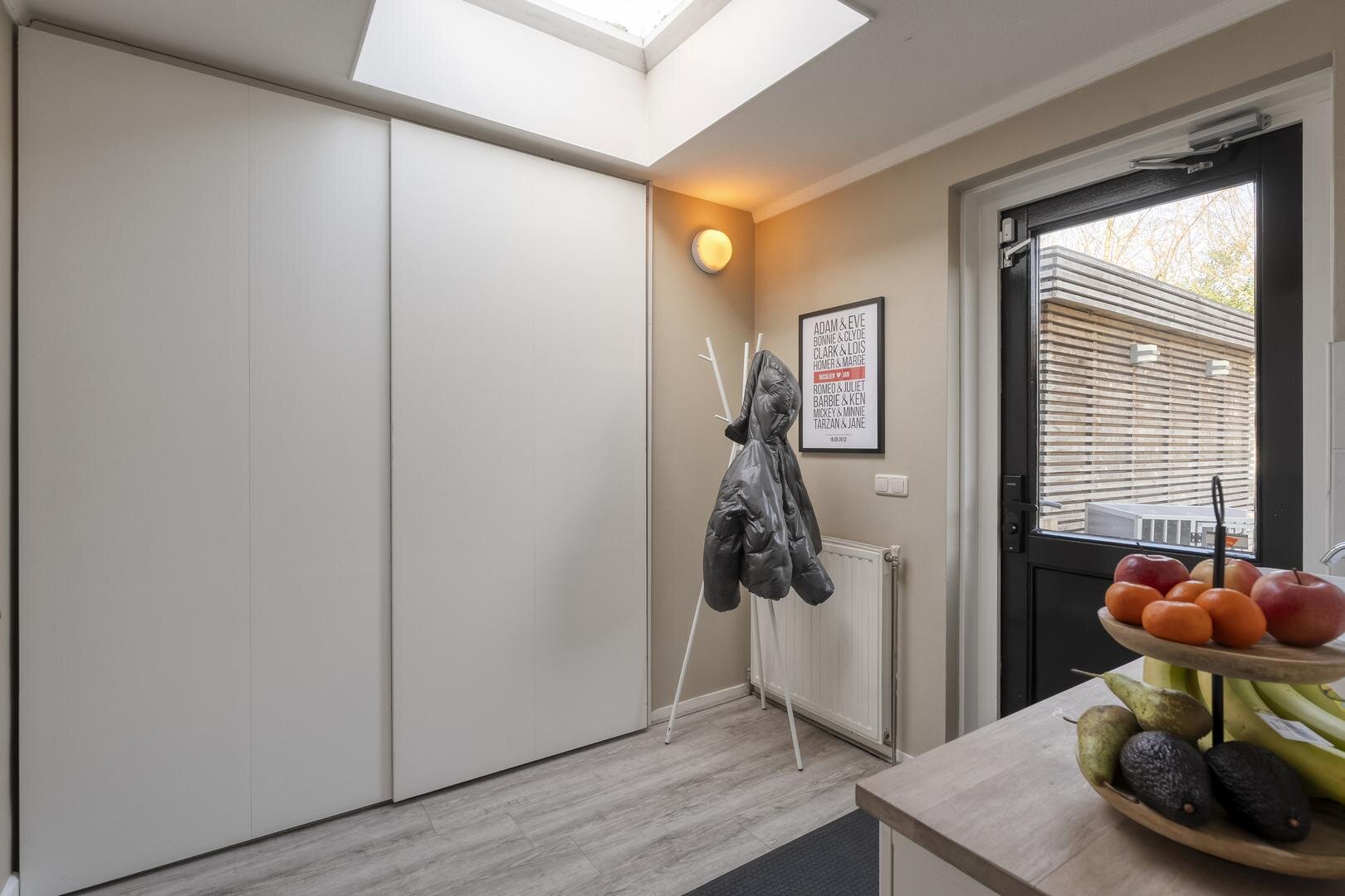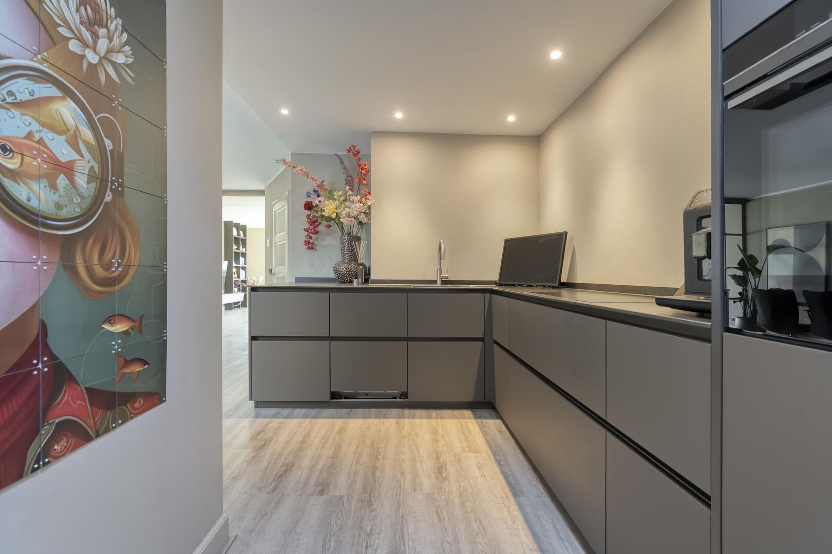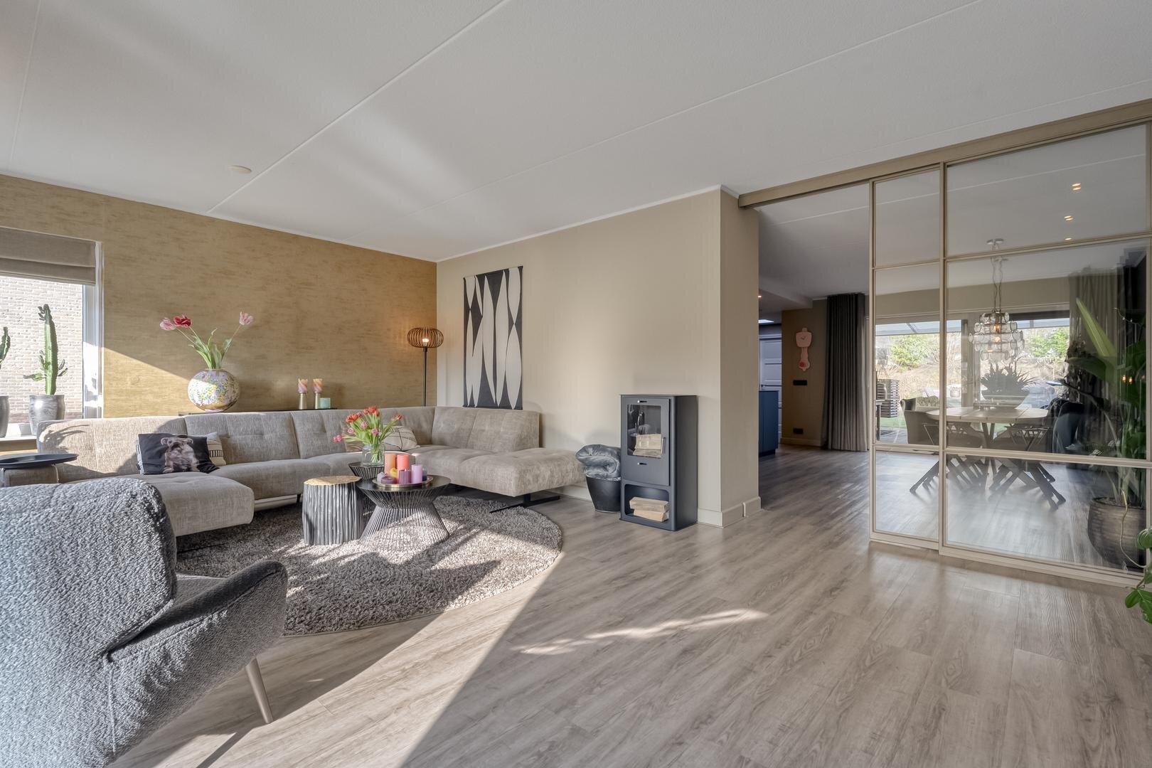 Via de ruime hal met toilet bereik je de lichte L-vormige woonkamer met erker en schuifdeur naar de woonkeuken. De woonkeuken is een fijne plek om te koken en samen te zijn, voorzien van een moderne inbouwkeuken met o.a. een inductiekookplaat met geïntegreerde afzuiging, Quooker, keramisch aanrechtblad en een ruime koelkast. Ook hier geeft een schuifpui direct toegang tot de tuin.
