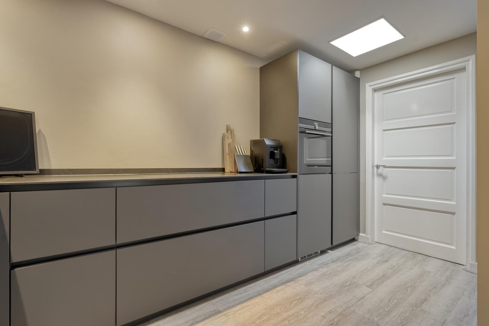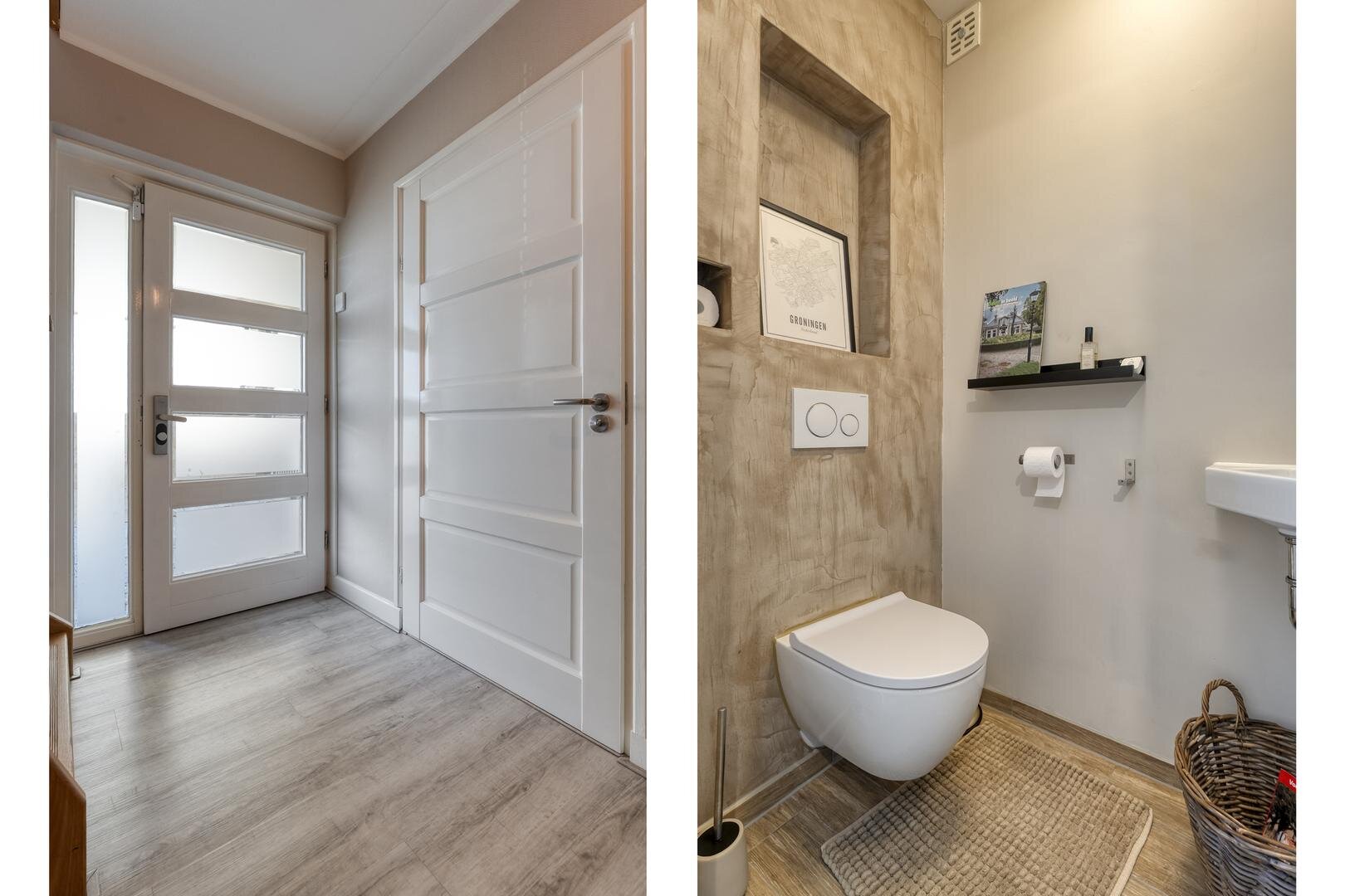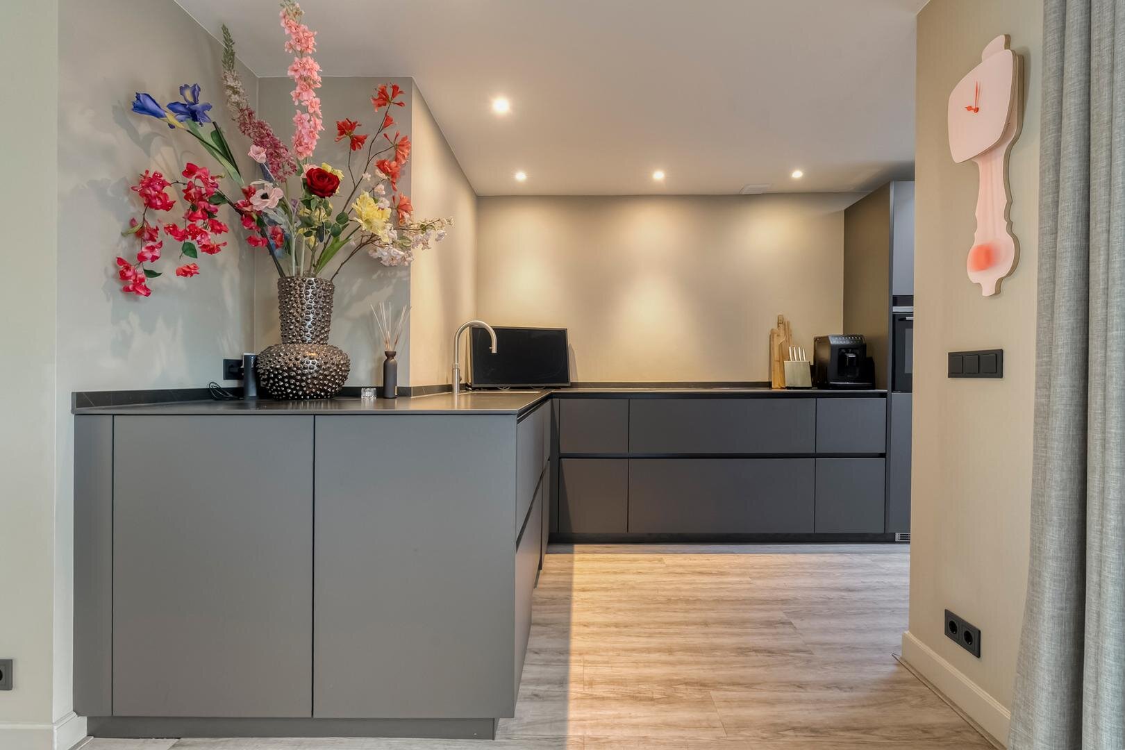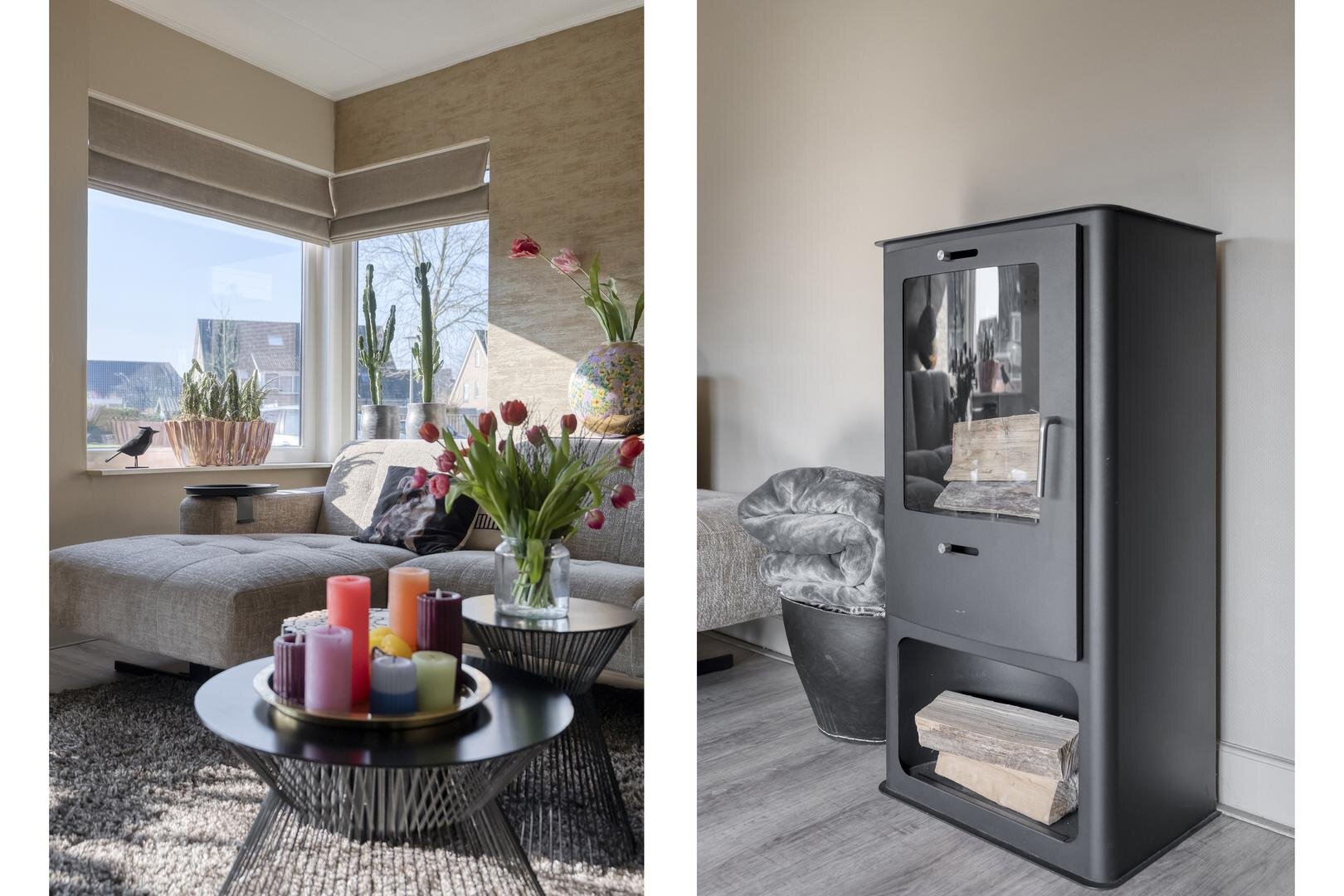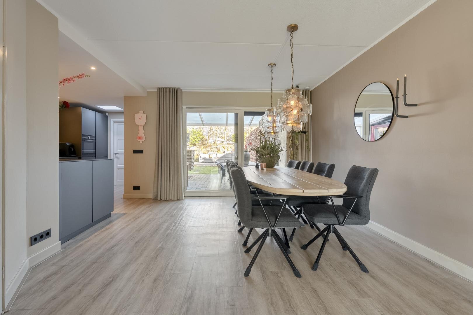 Via de ruime hal met toilet bereik je de lichte L-vormige woonkamer met erker en schuifdeur naar de woonkeuken. De woonkeuken is een fijne plek om te koken en samen te zijn, voorzien van een moderne inbouwkeuken met o.a. een inductiekookplaat met geïntegreerde afzuiging, Quooker, keramisch aanrechtblad en een ruime koelkast. Ook hier geeft een schuifpui direct toegang tot de tuin.
