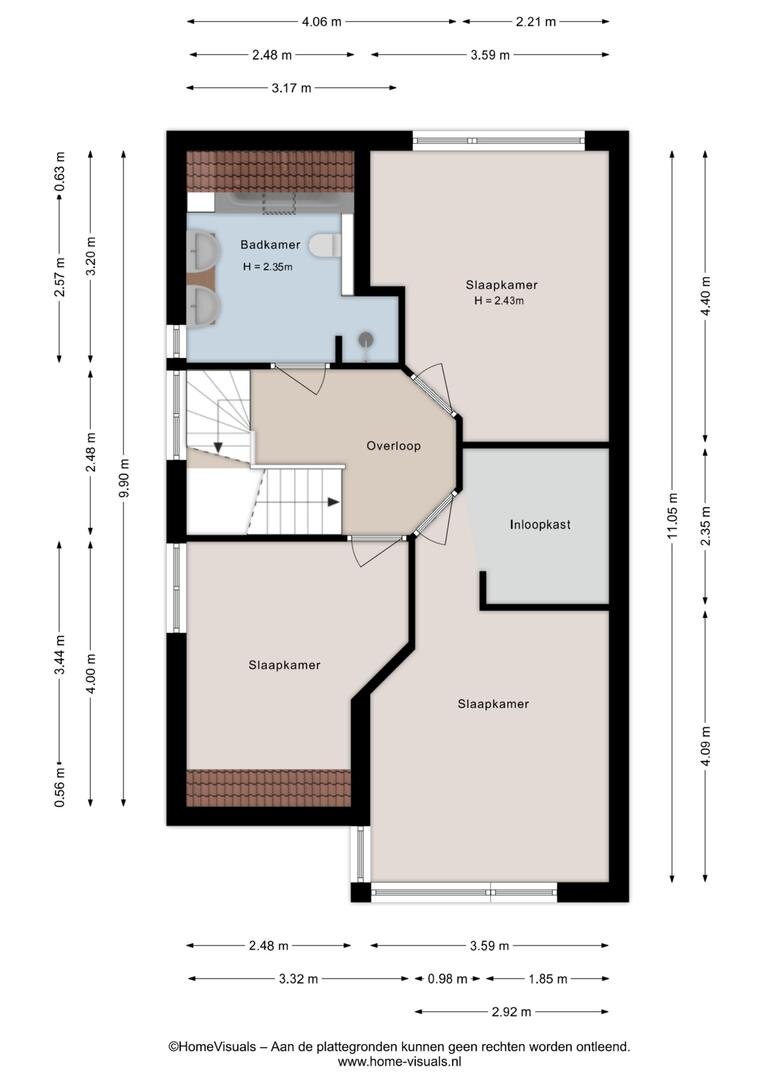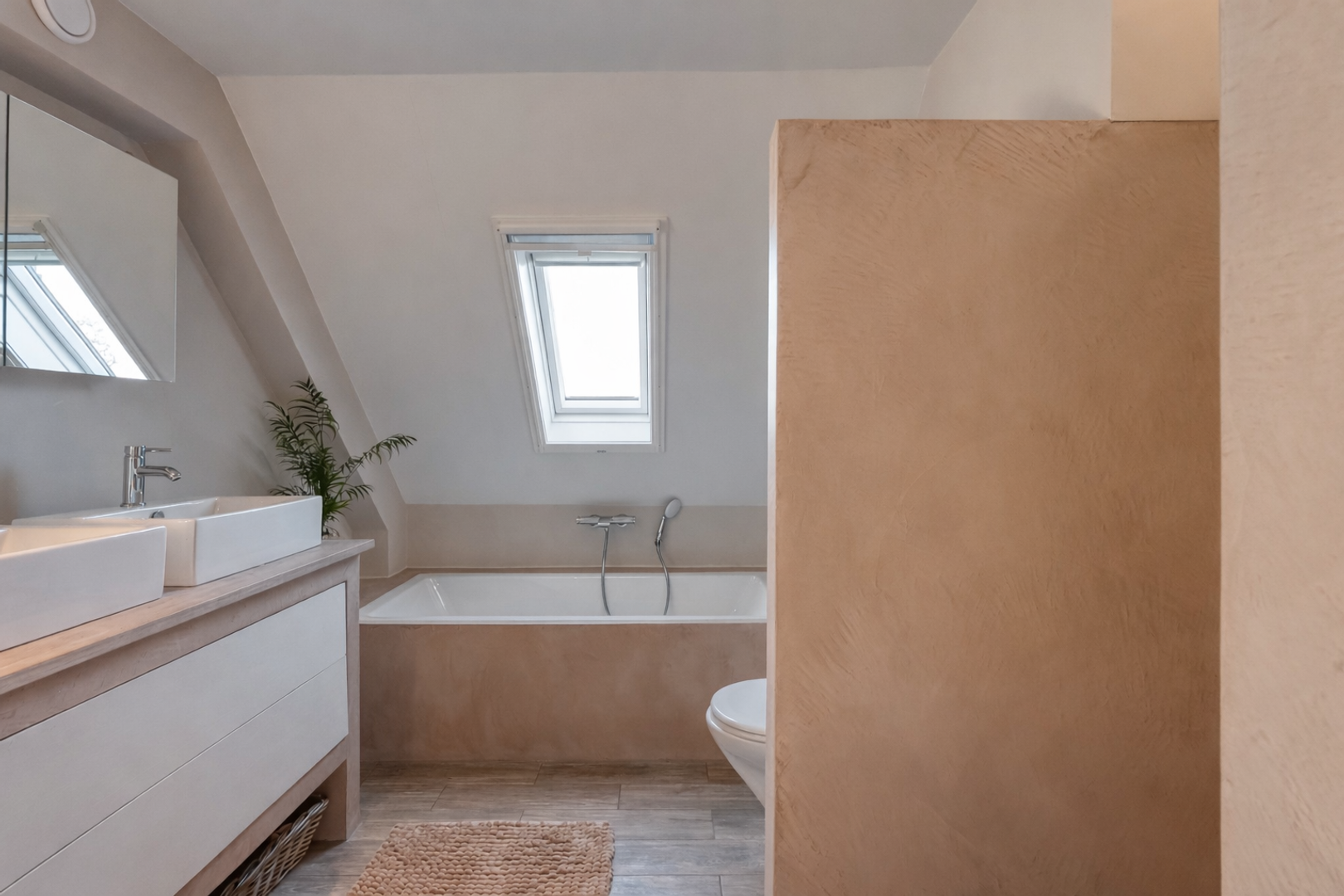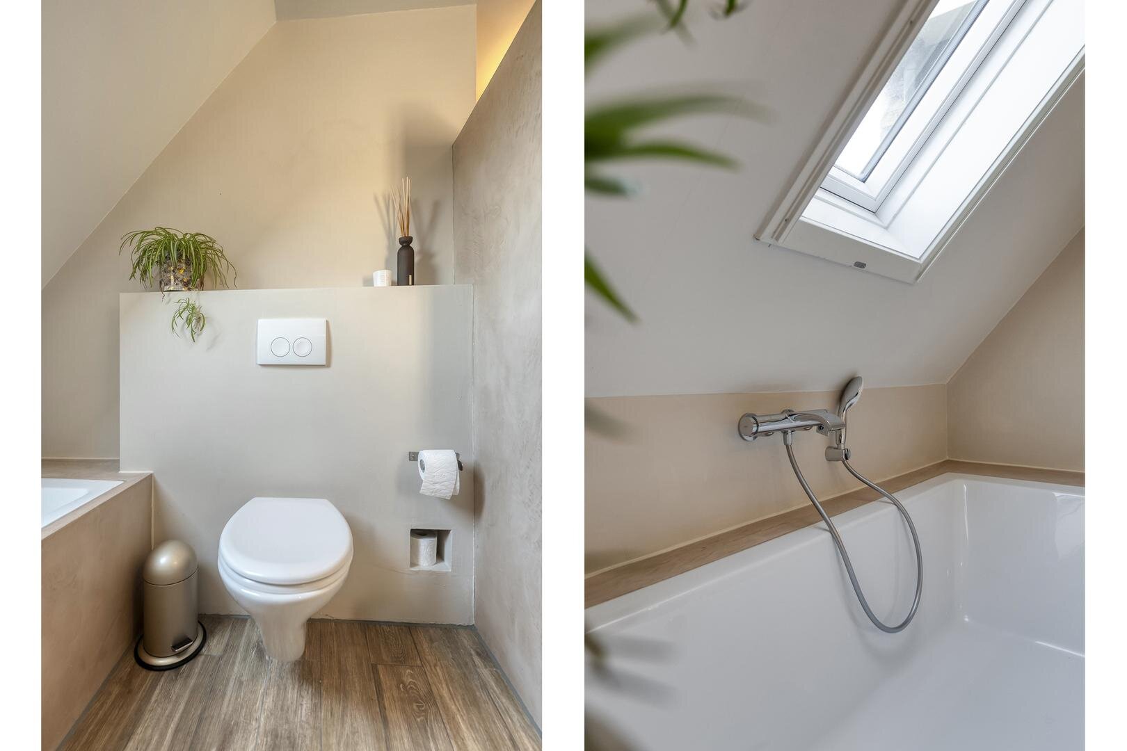 De overloop geeft toegang tot drie grote slaapkamers, waarvan twee met dakkapel. De badkamer is deels vernieuwd in 2024, en uitgerust met een ligbad, dubbele wastafel, inloopdouche met stortdouche en toilet.
