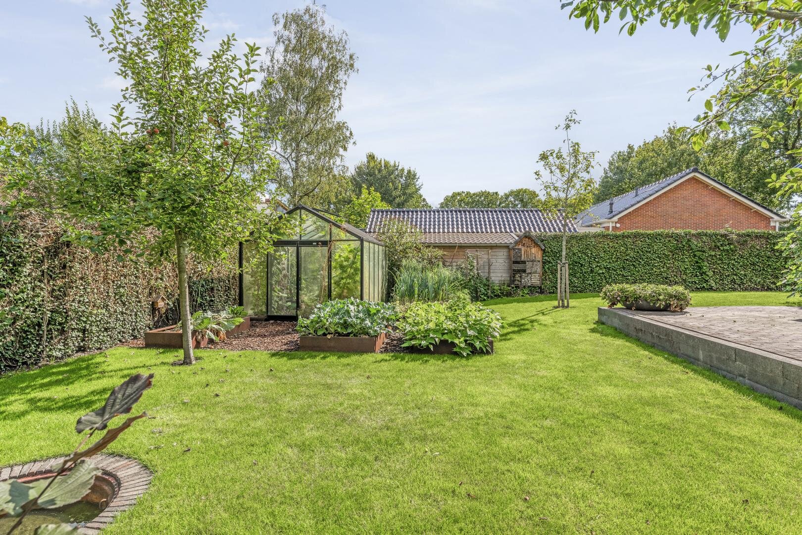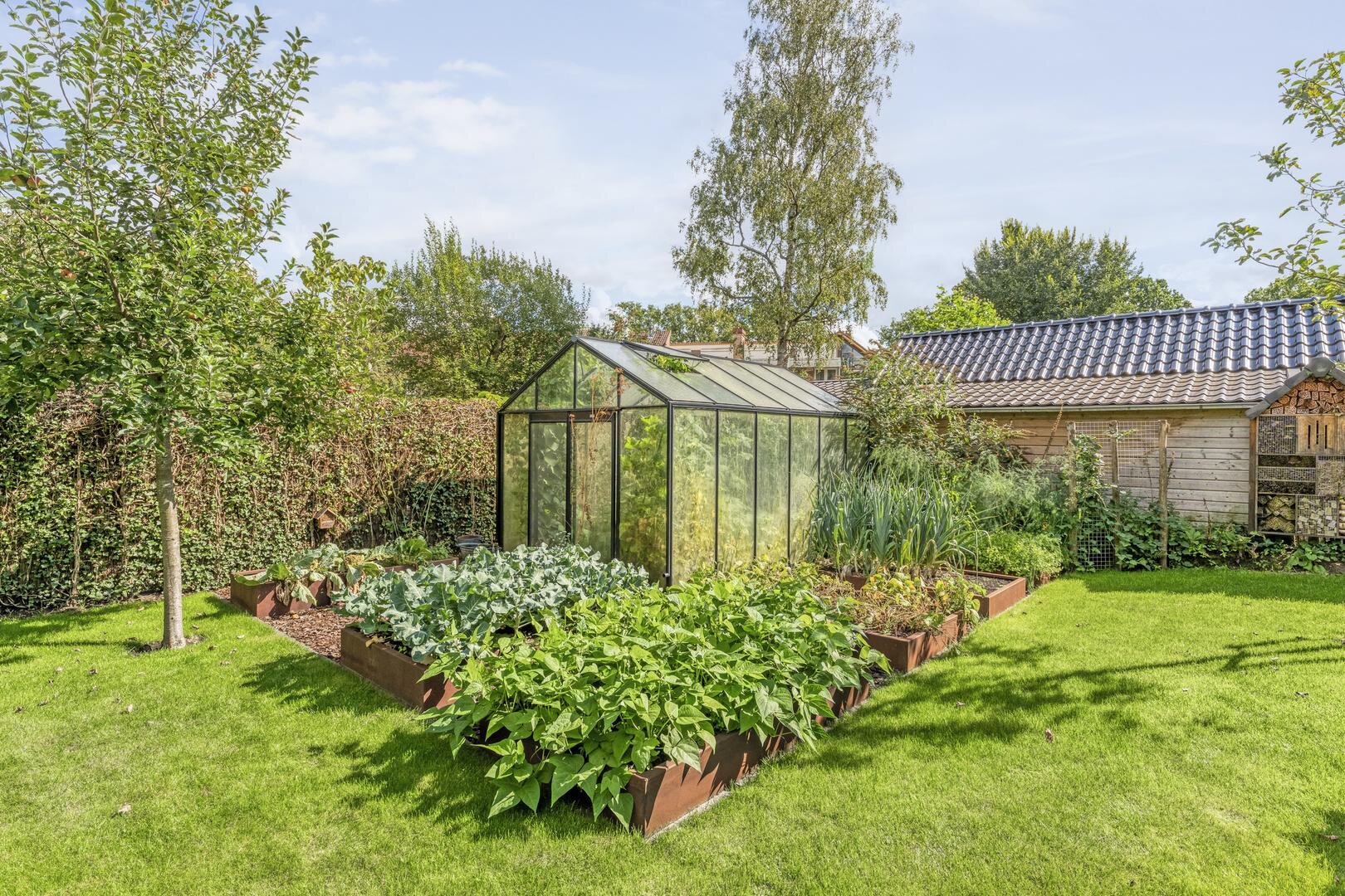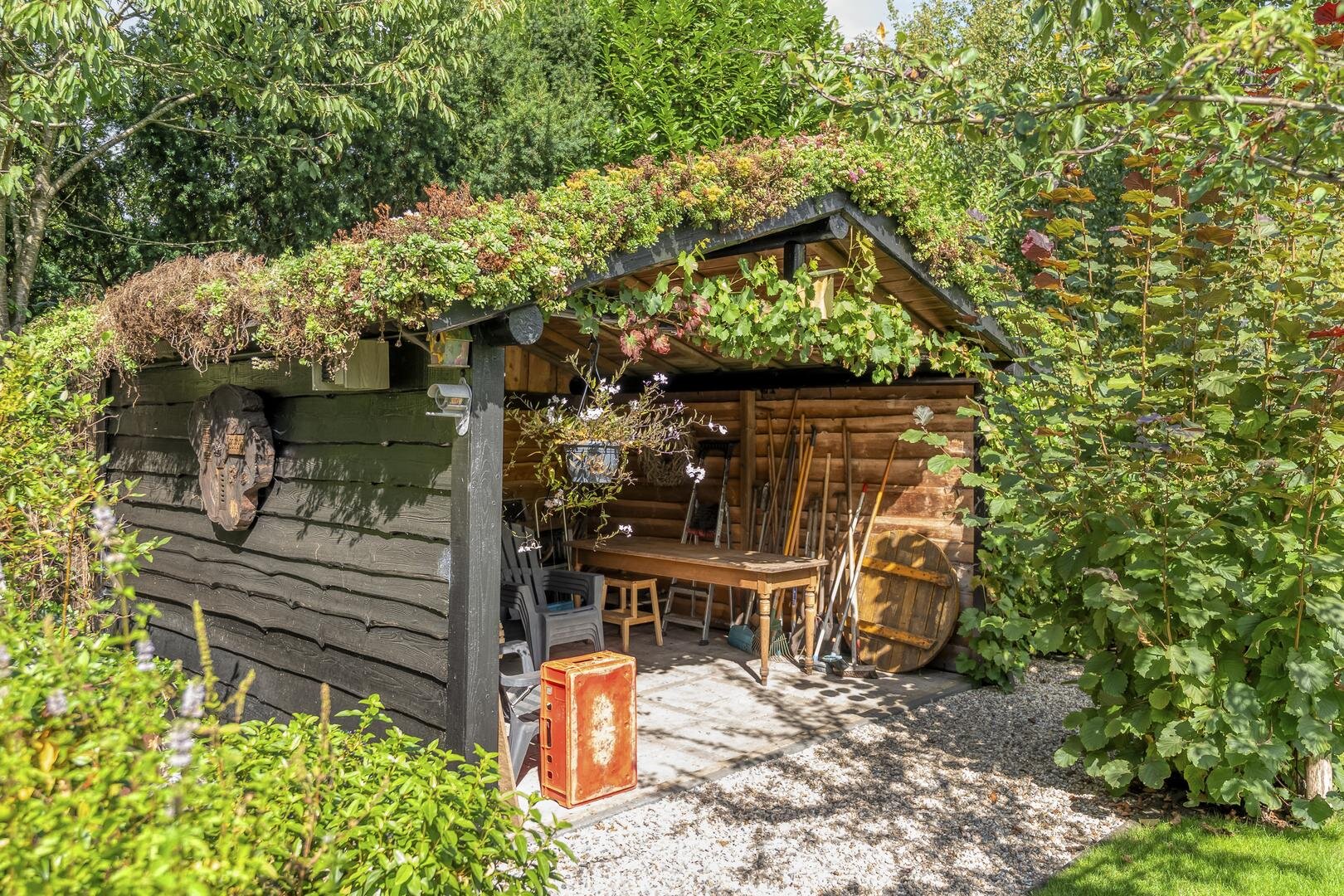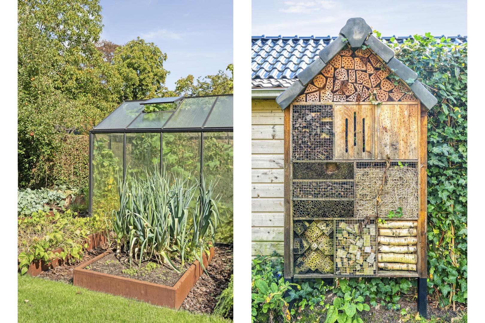 De fraai aangelegde tuin vormt een waar verlengstuk van de woning. Hier vindt u meerdere terrassen, een overkapping, een kas en zelfs een insectenhotel. Dankzij de bron en het computergestuurde beregeningssysteem blijft de tuin altijd in optimale conditie. Ook aan bergruimte is gedacht, met een aangebouwde garage en een vrijstaand tuinschuurtje.