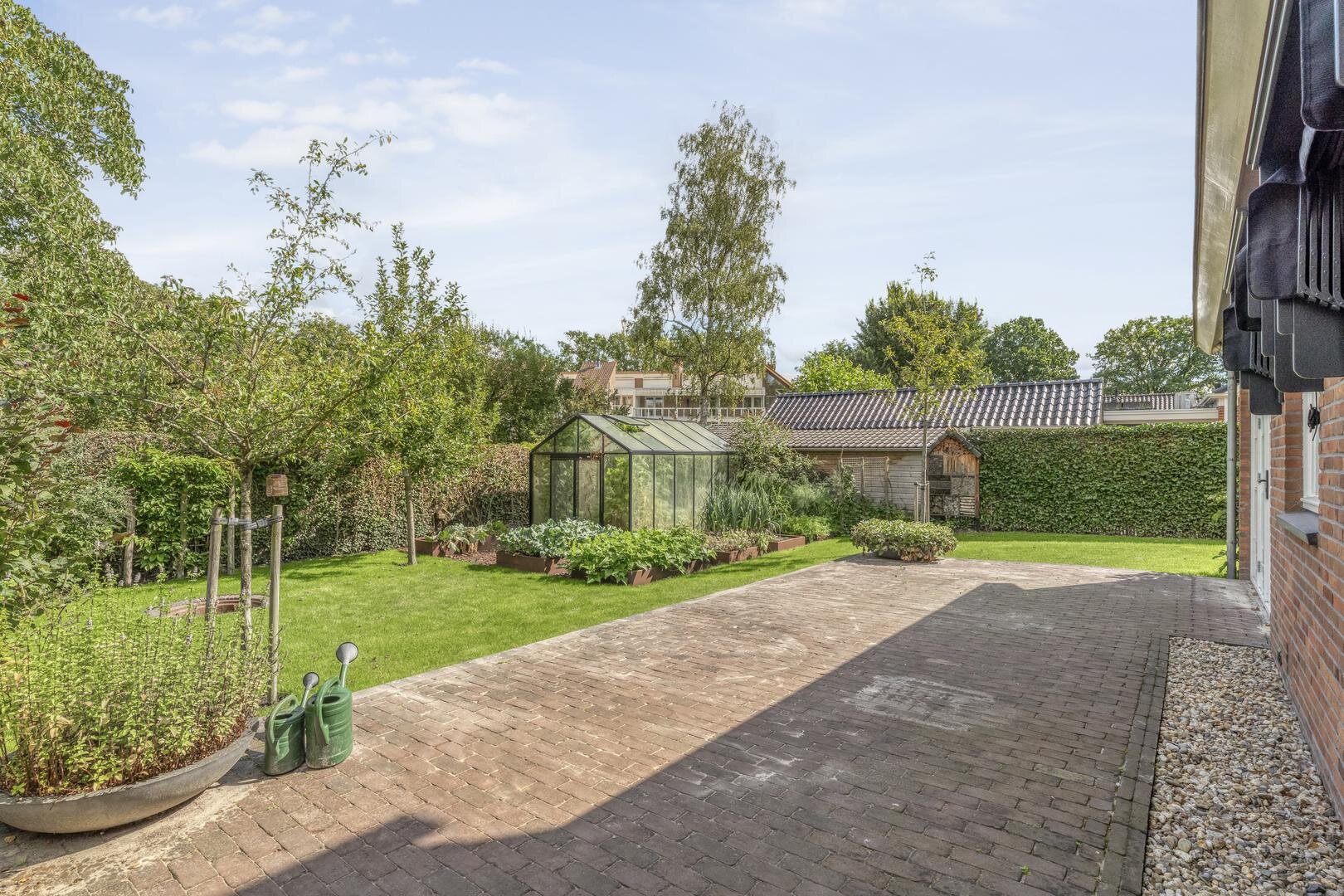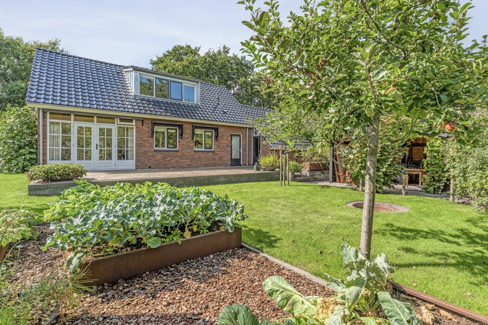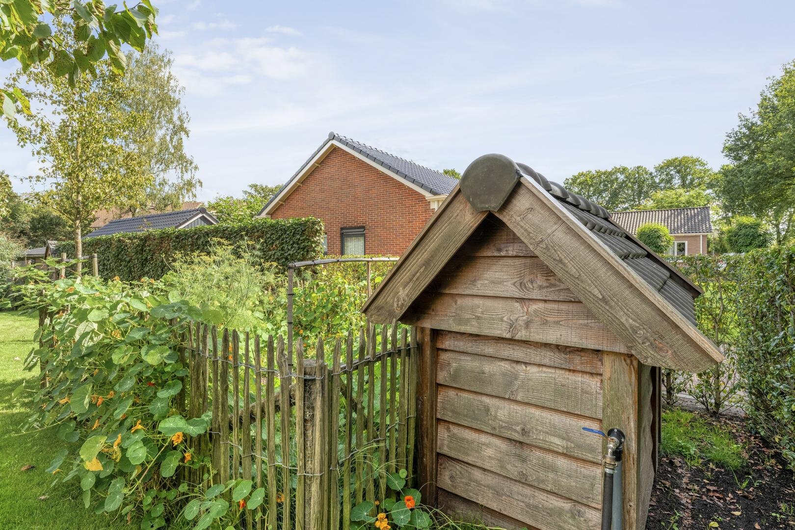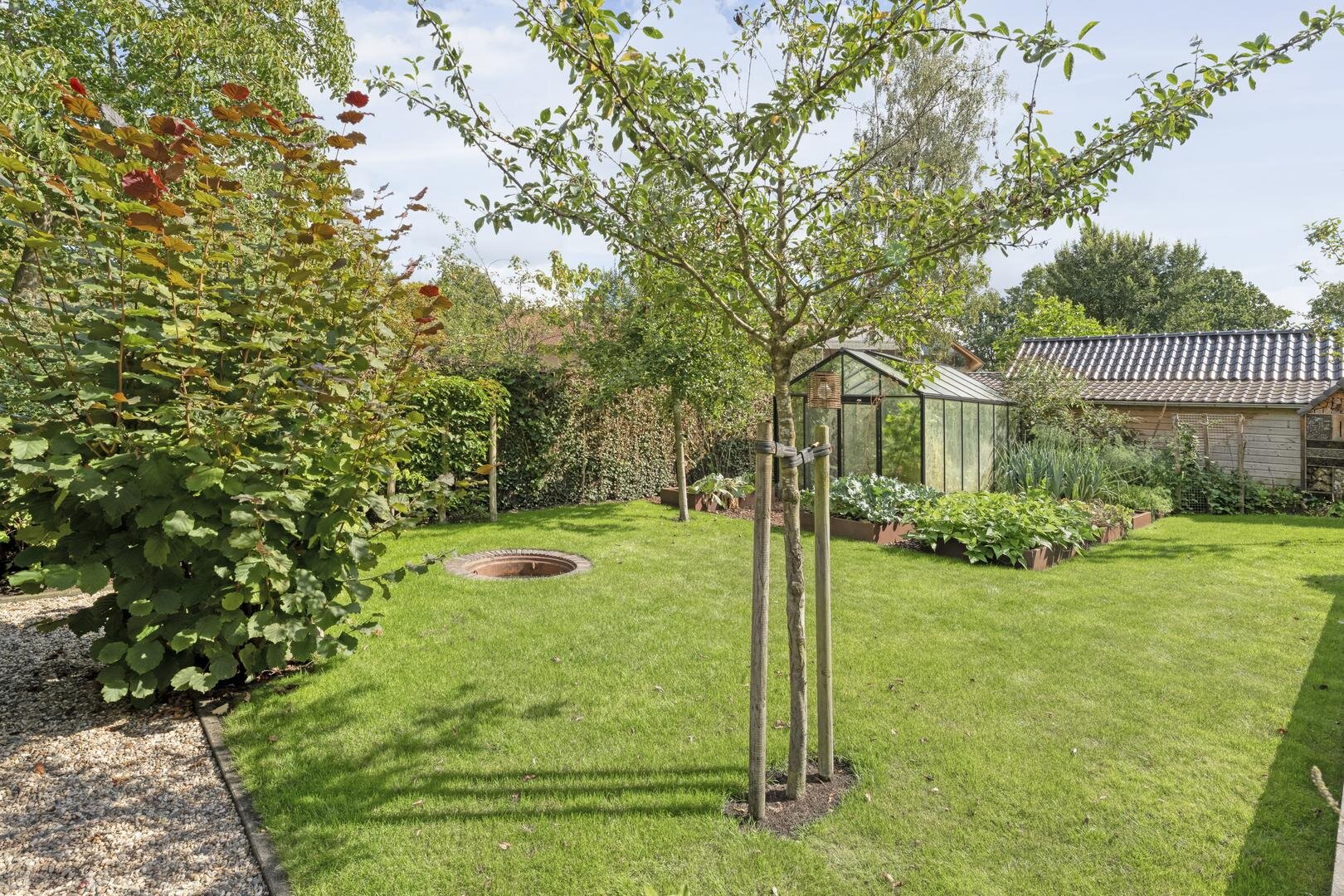 De fraai aangelegde tuin vormt een waar verlengstuk van de woning. Hier vindt u meerdere terrassen, een overkapping, een kas en zelfs een insectenhotel. Dankzij de bron en het computergestuurde beregeningssysteem blijft de tuin altijd in optimale conditie. Ook aan bergruimte is gedacht, met een aangebouwde garage en een vrijstaand tuinschuurtje.